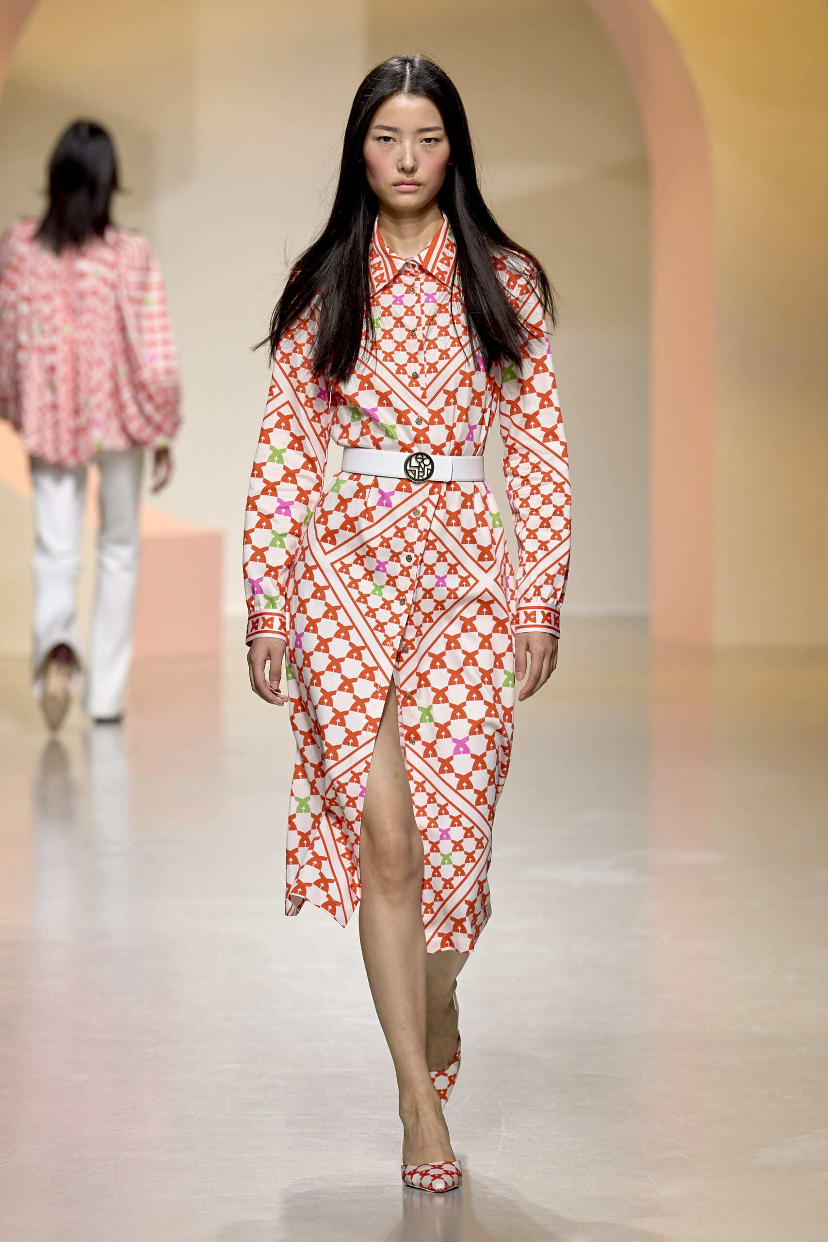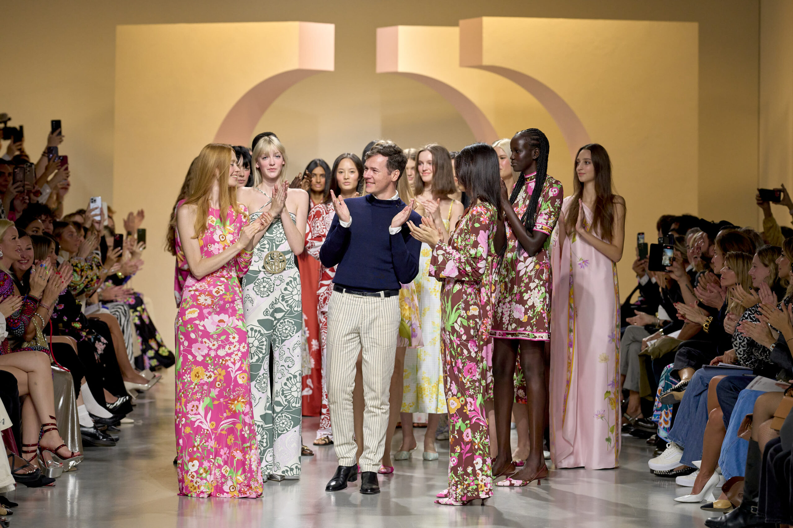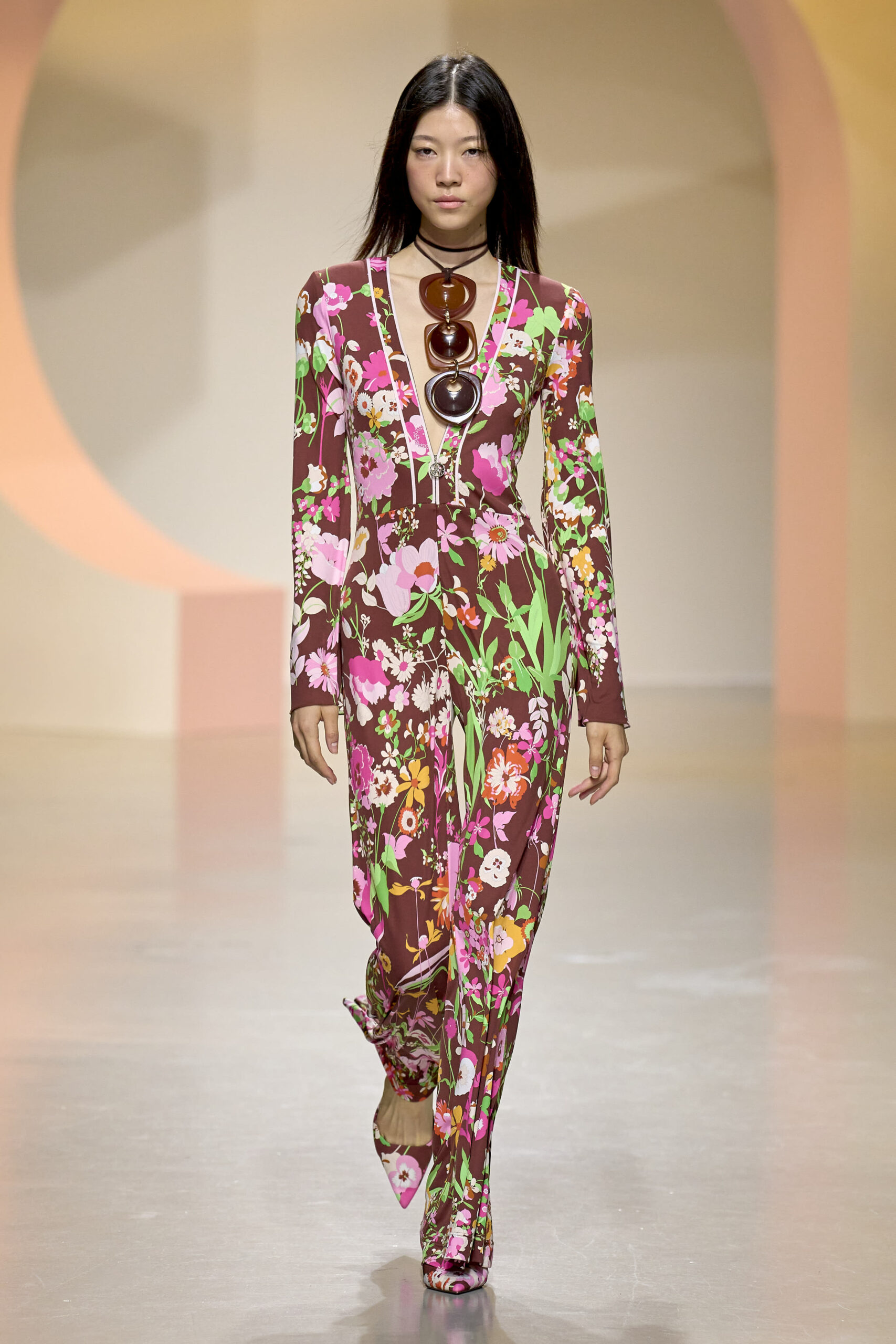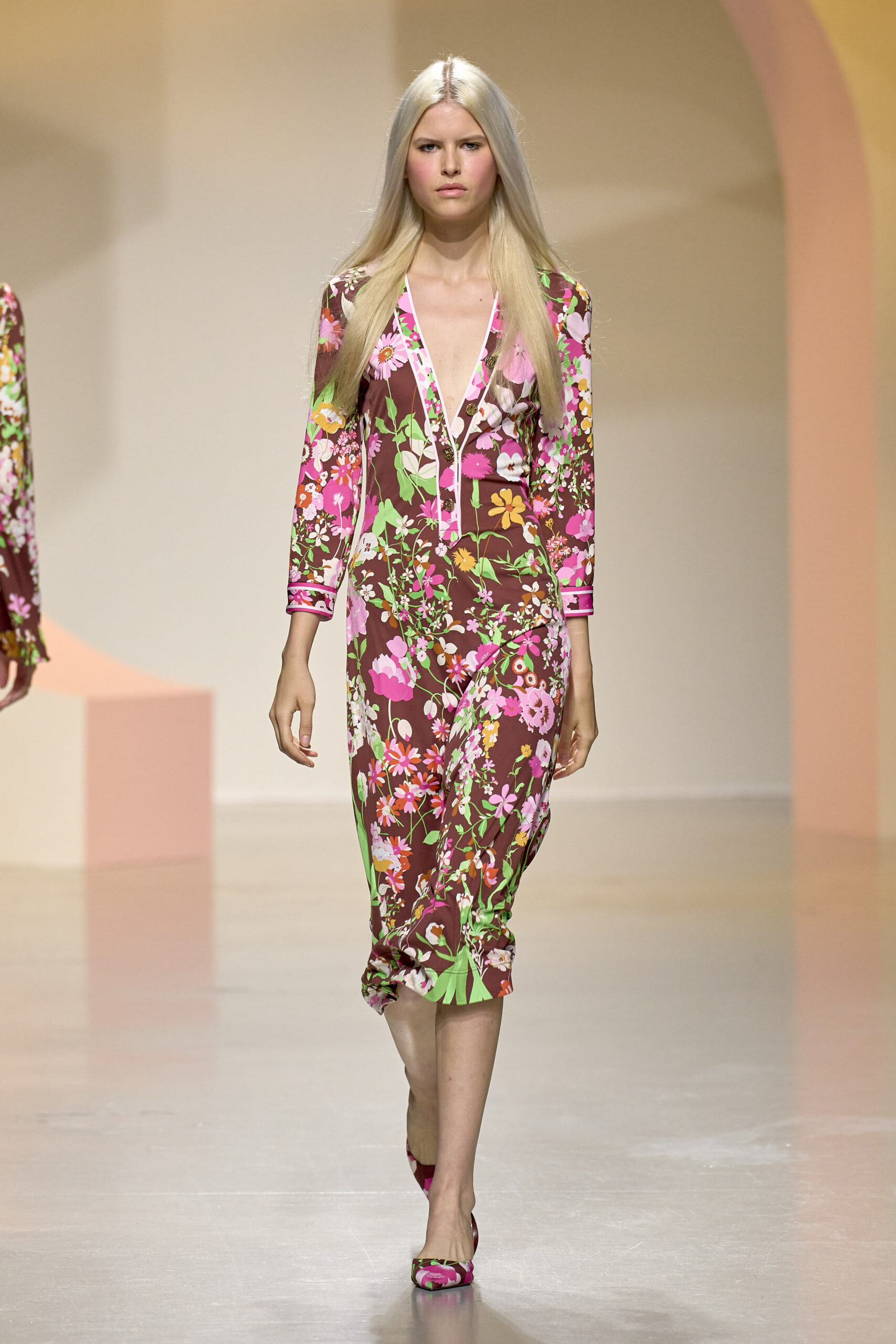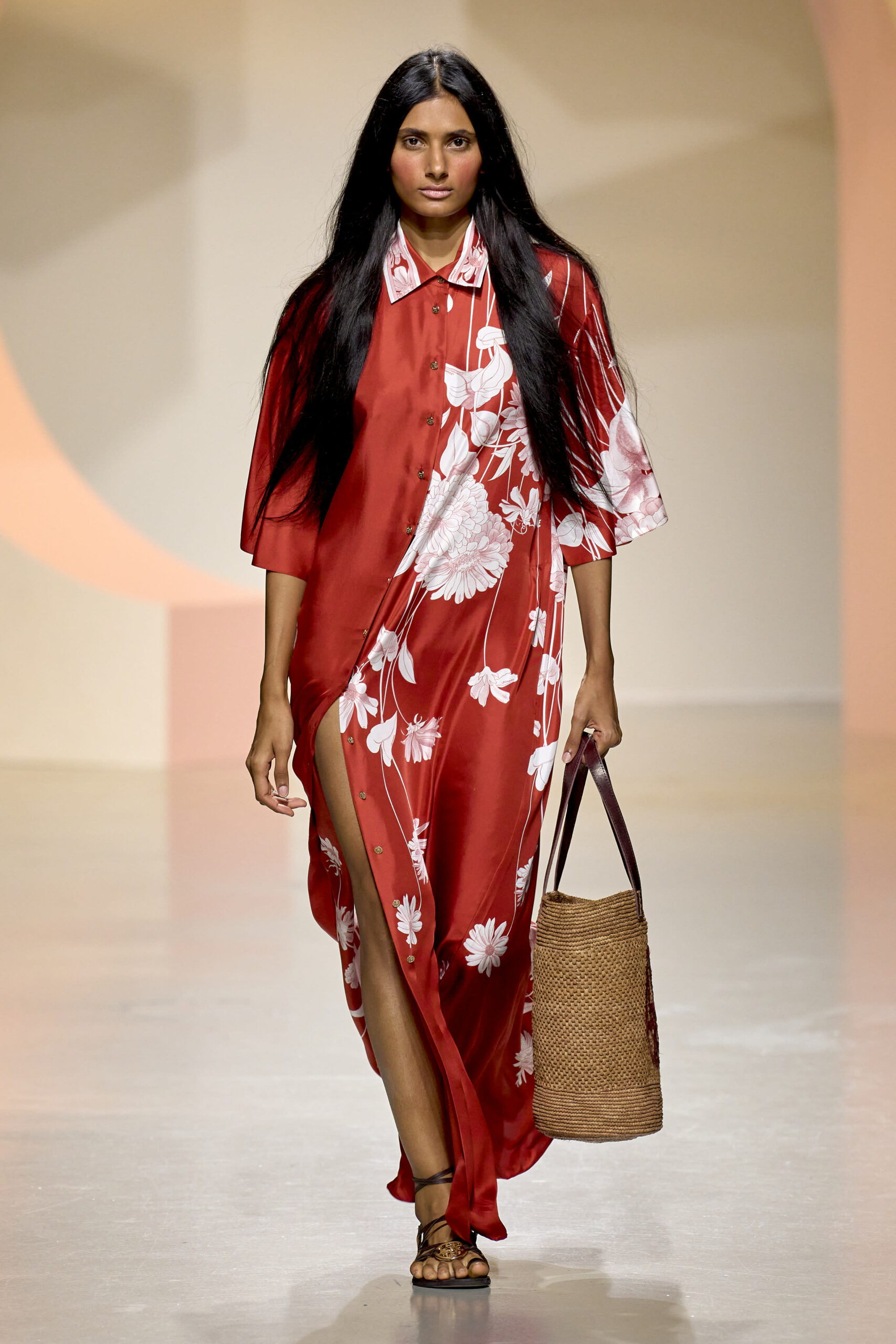 L’ouverture du défilé, marquée par une veste de costume blanc portée à même la peau, évoque la sensualité intemporelle incarnée par Bianca Jagger lors de son union avec Mick. La signature florale de la Maison LEONARD, véritable hymne à la joie de vivre, est revisitée à travers des imprimés fleuris vibrant de couleurs. Cependant, l’audace de la collection ne s’arrête pas là. Elle propose une évolution stylistique avec des pantalons fluides et évasés, des blouses amplement poétiques, des ponchos, des escarpins mutins et un sac qui promet de devenir culte.