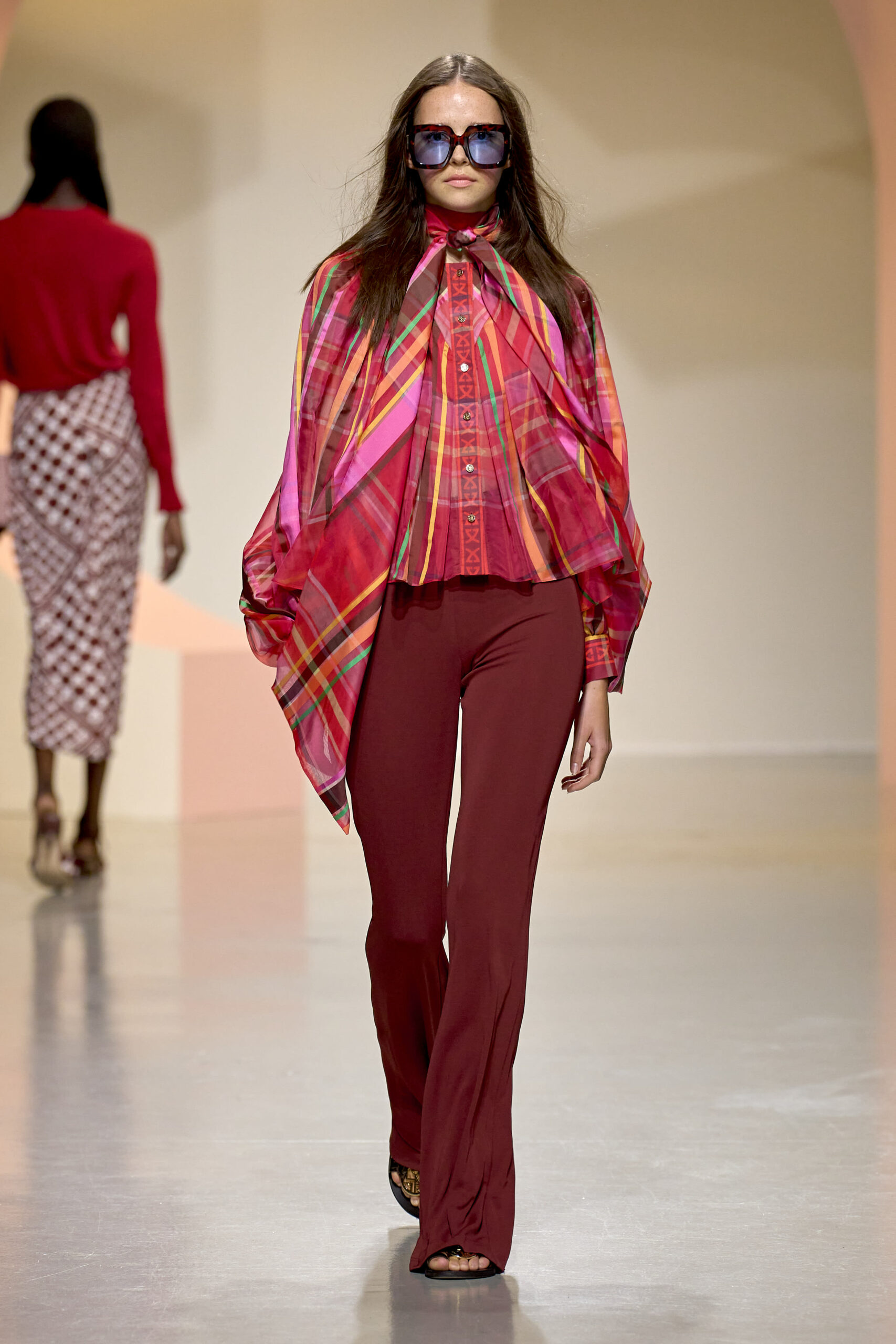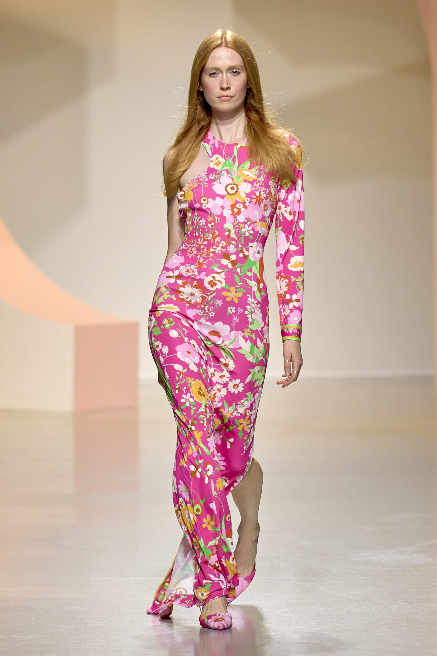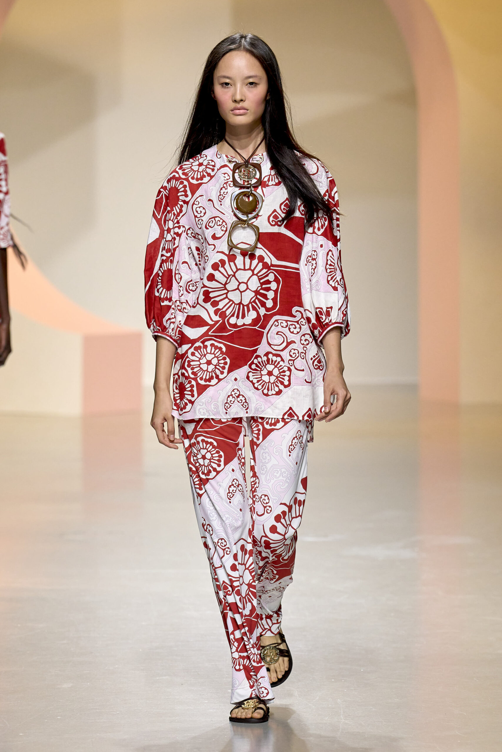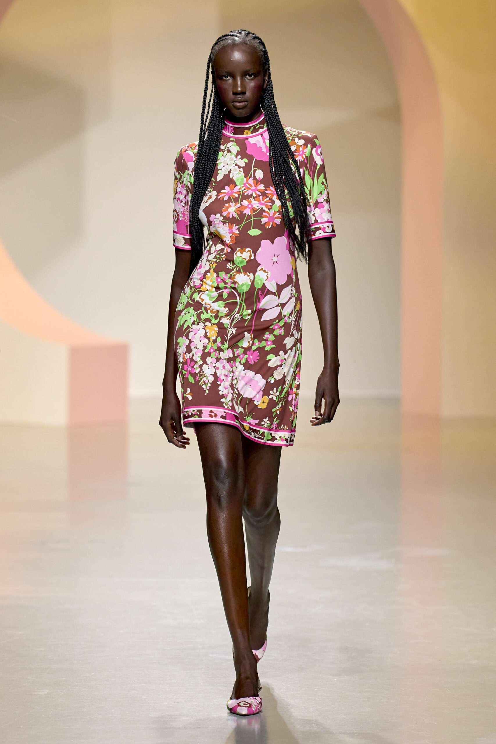 L’ouverture du défilé, marquée par une veste de costume blanc portée à même la peau, évoque la sensualité intemporelle incarnée par Bianca Jagger lors de son union avec Mick. La signature florale de la Maison LEONARD, véritable hymne à la joie de vivre, est revisitée à travers des imprimés fleuris vibrant de couleurs. Cependant, l’audace de la collection ne s’arrête pas là. Elle propose une évolution stylistique avec des pantalons fluides et évasés, des blouses amplement poétiques, des ponchos, des escarpins mutins et un sac qui promet de devenir culte.