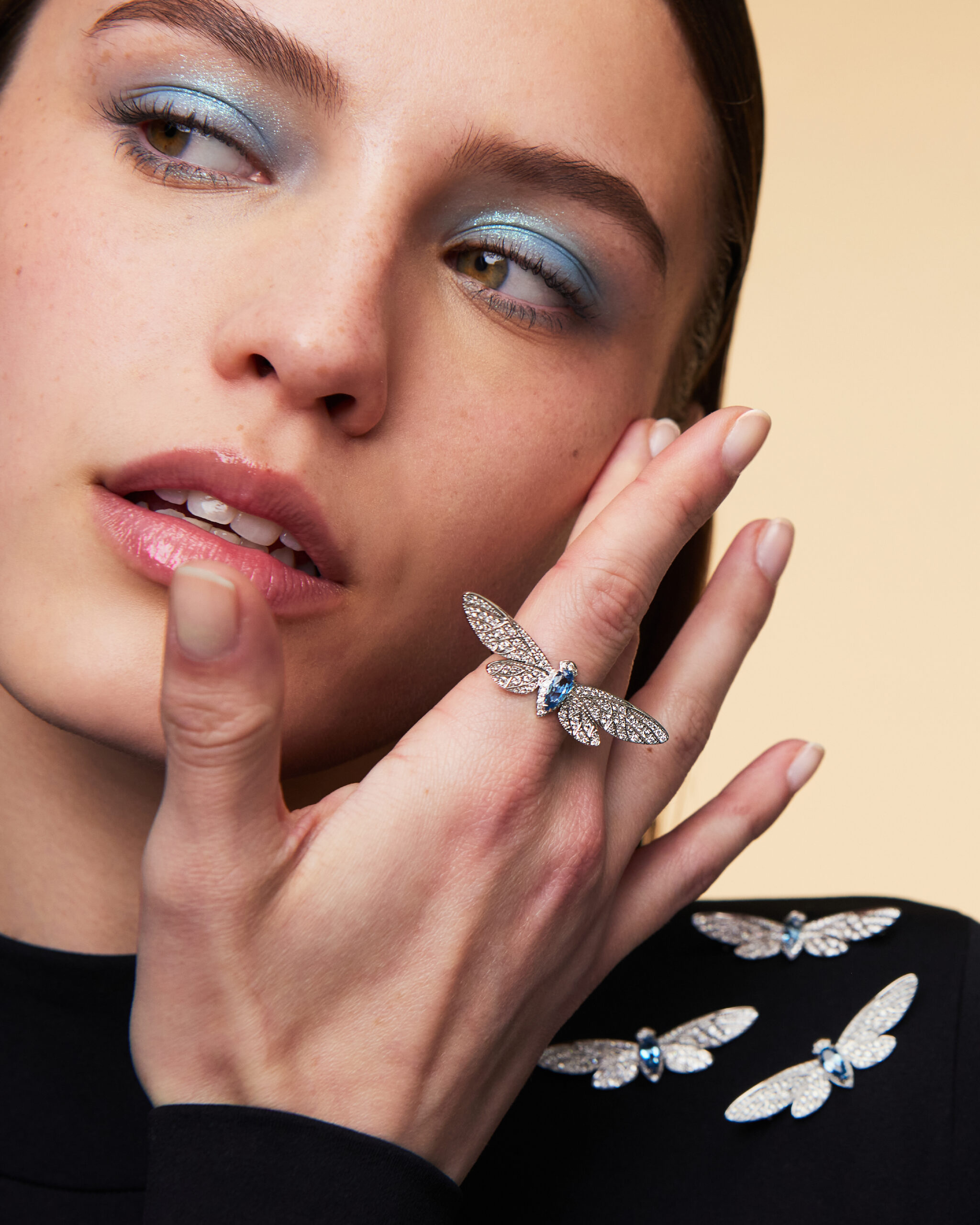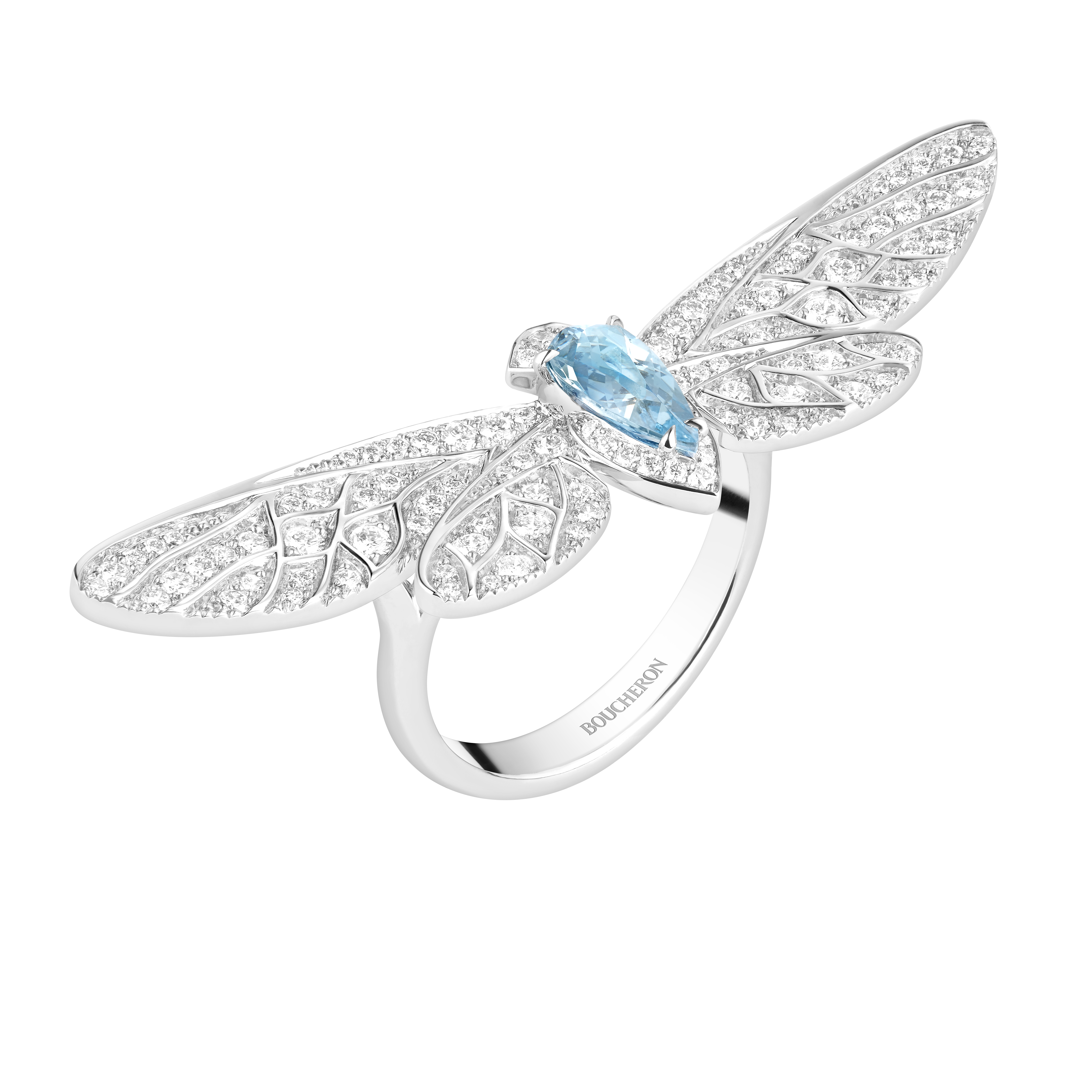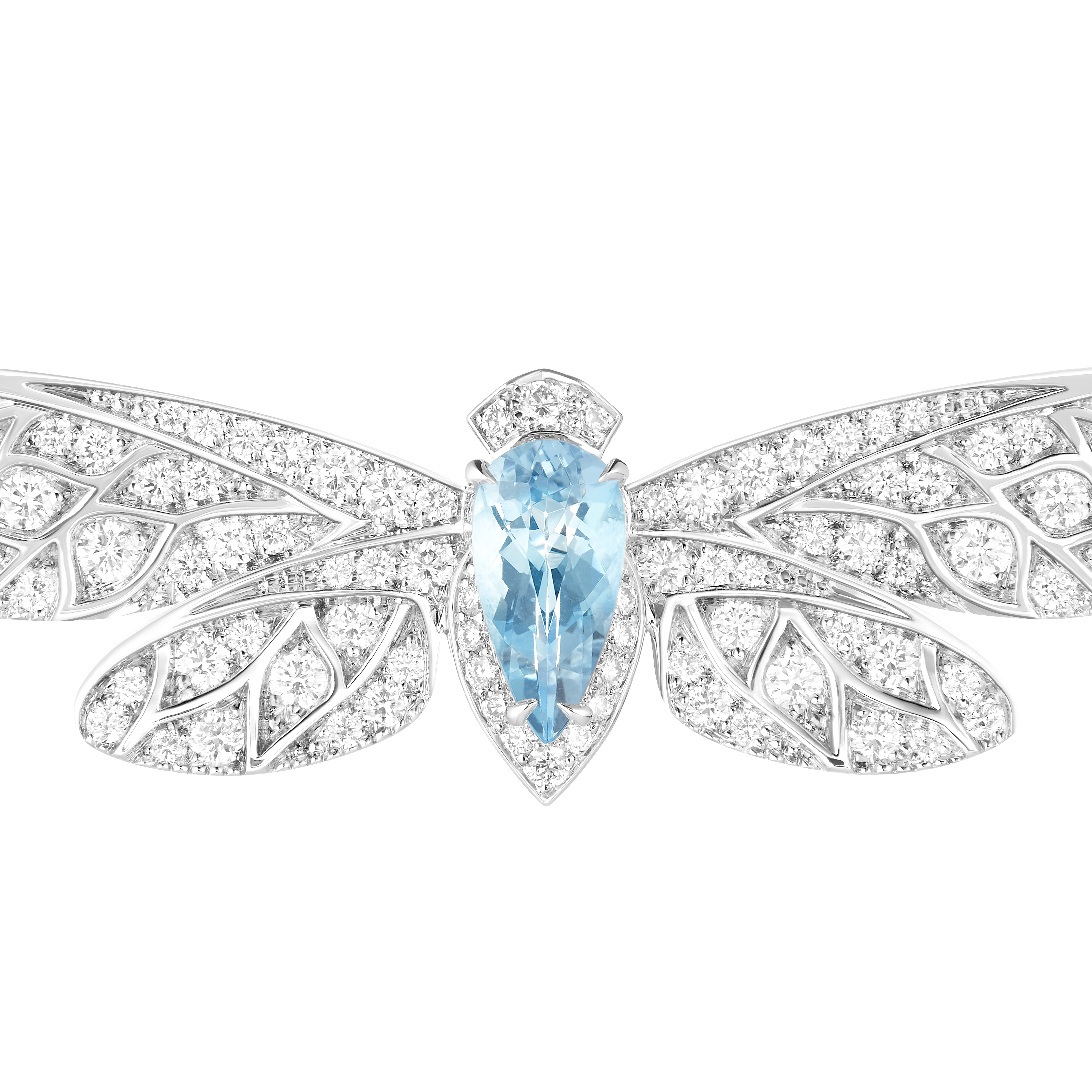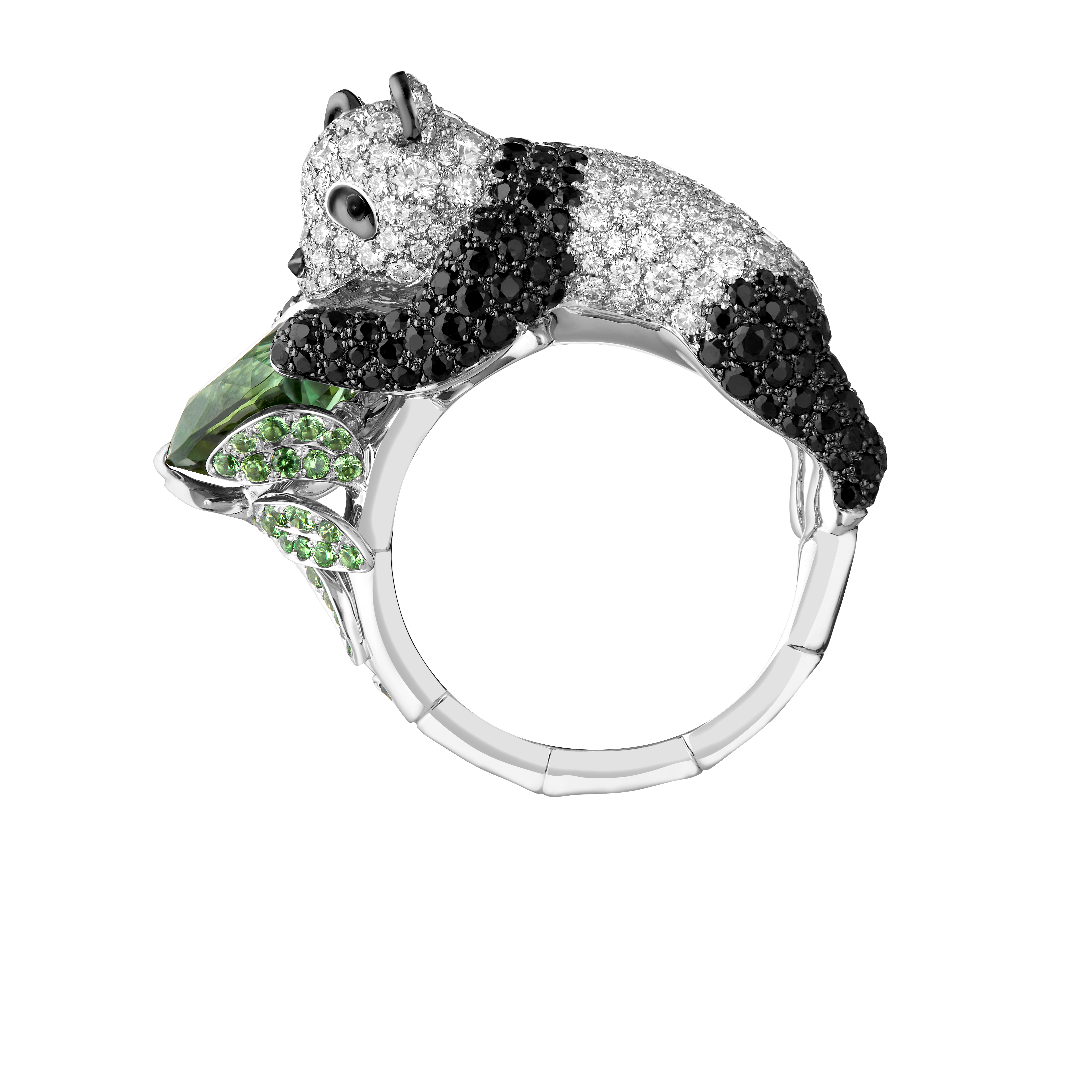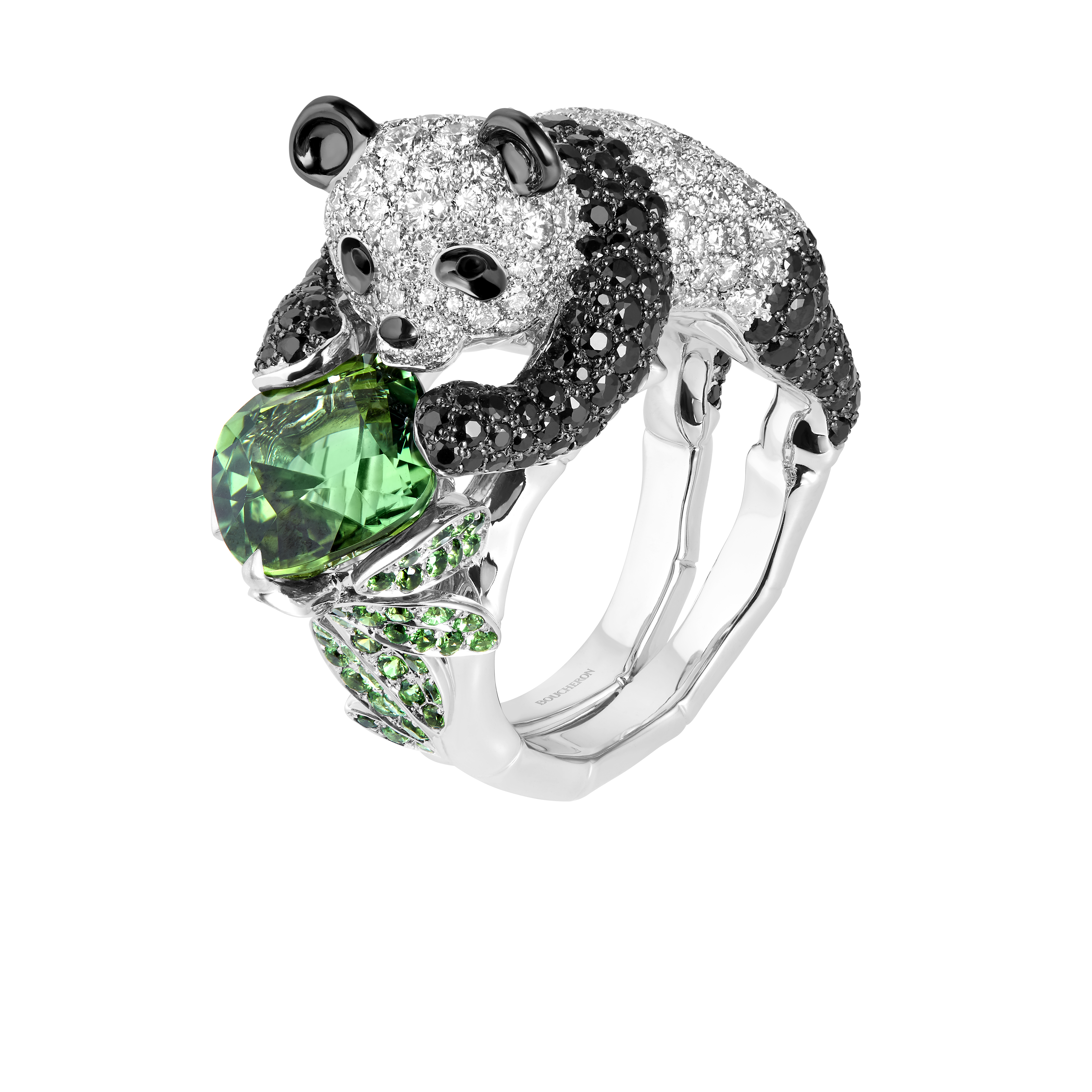 Les Nouveaux Arrivants: Panda et Cigale En cette année 2023, deux nouvelles créatures font leur apparition dans le bestiaire Boucheron: le Panda et la Cigale. Le Panda, symbole de paix et d’amitié, est façonné avec une rondeur qui invite à la tendresse. La bague qui le met en scène est sertie d’une tourmaline somptueuse, clin d’œil à son aliment de prédilection, le bambou. Quant à la cigale, elle est l’incarnation du renouveau et de l’harmonie. Pavée de diamants et sertie d’une aigue-marine, elle se dévoile sur un collier transformable en broche, étendant ses ailes délicates sur la peau de son porteur.