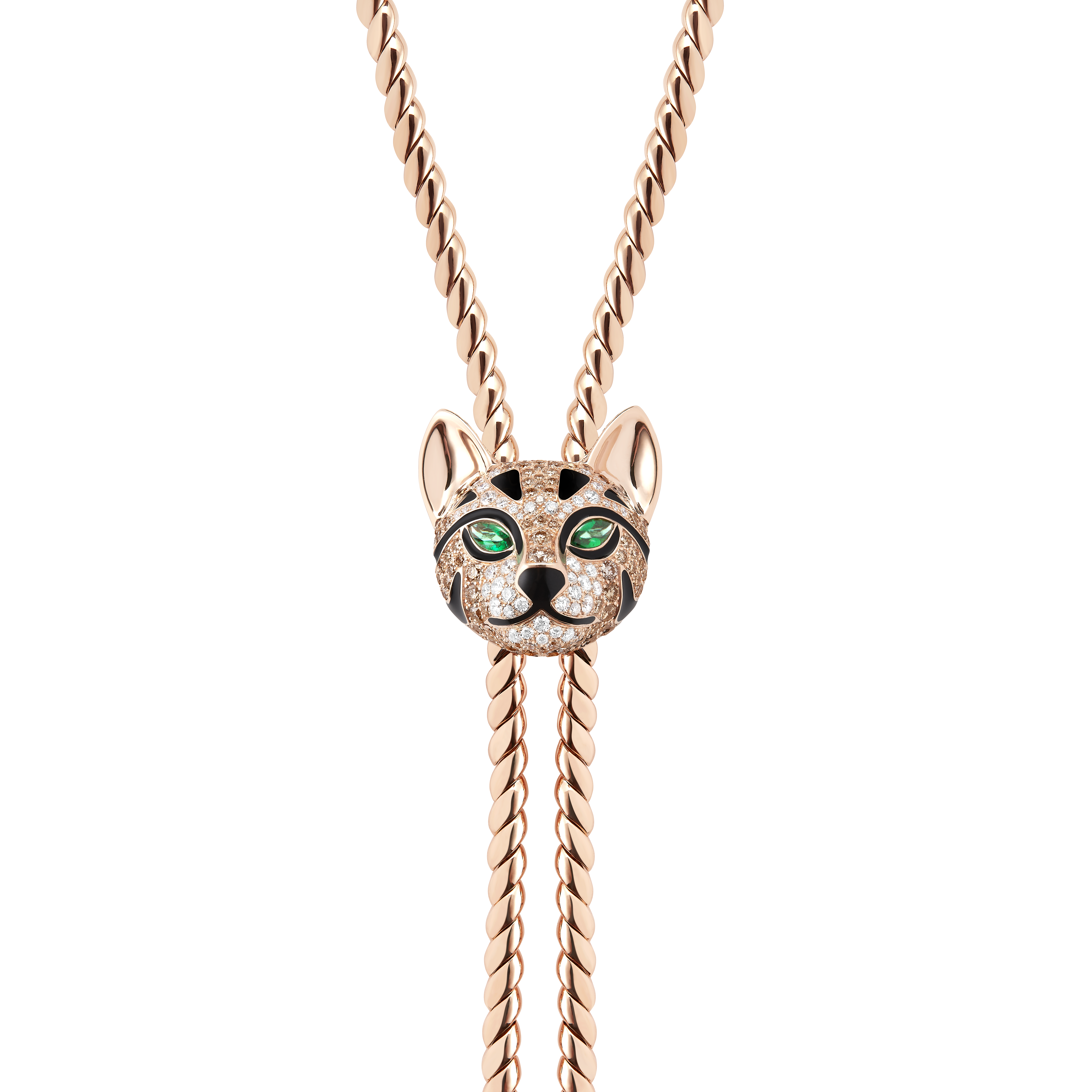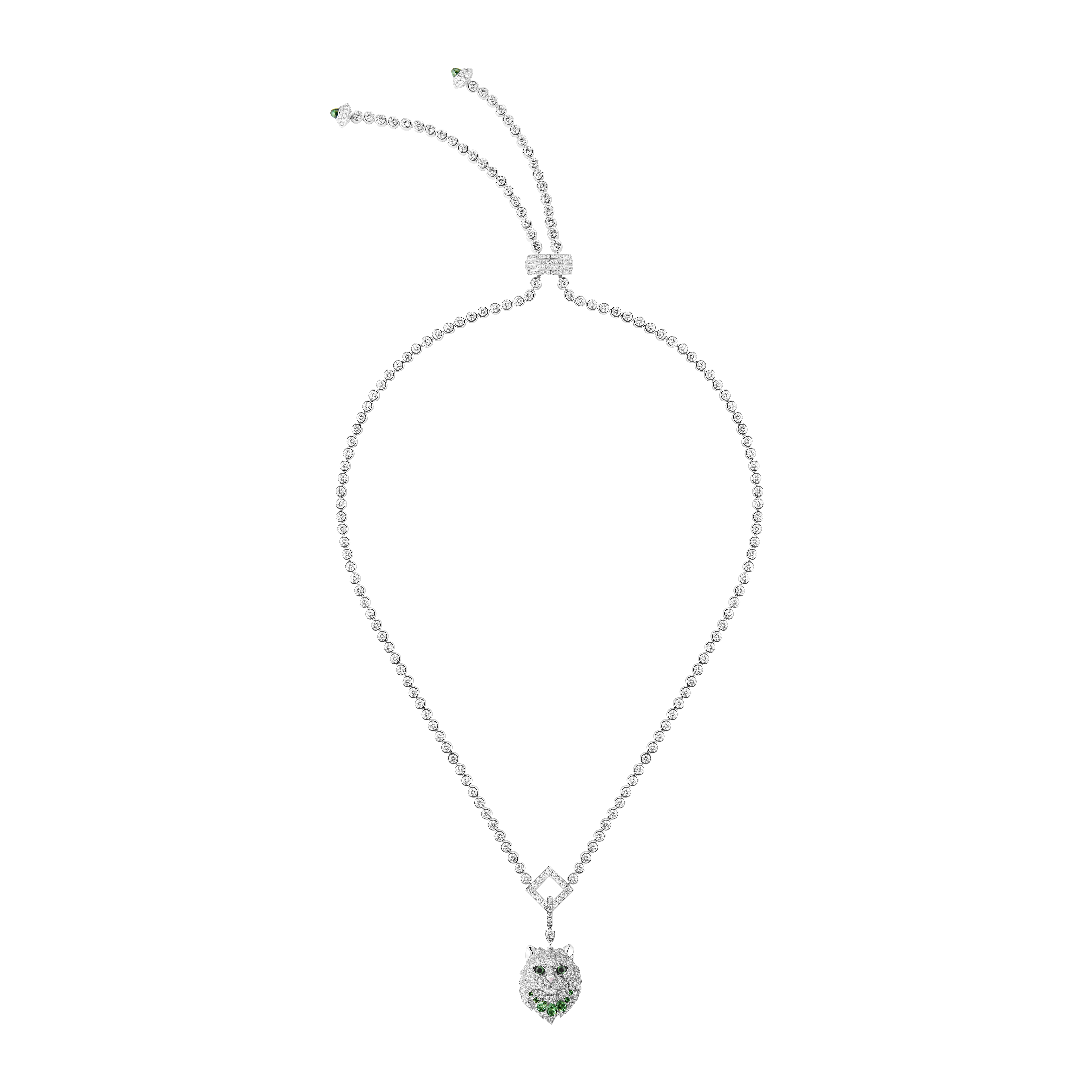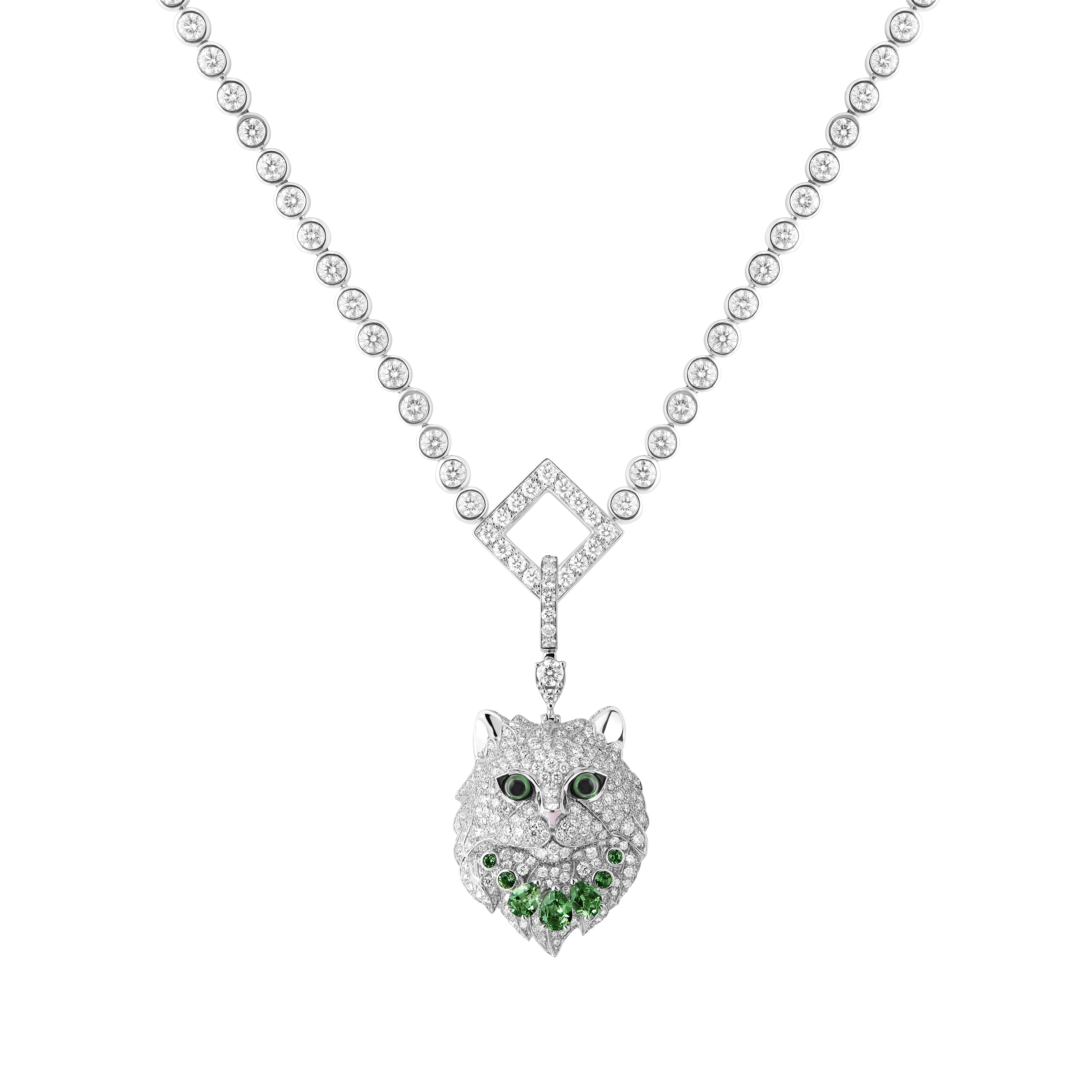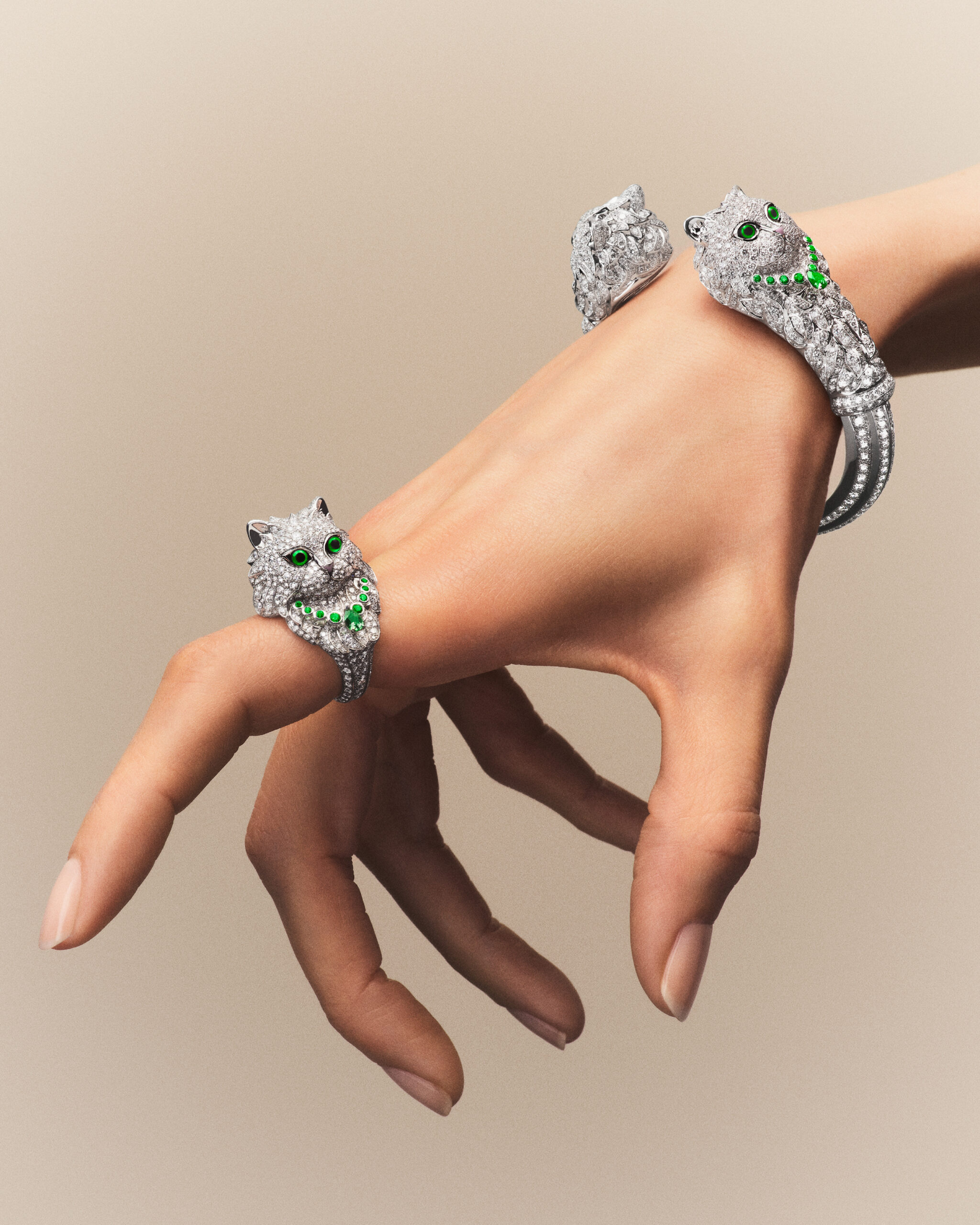 S’épanouir à travers les Collections Fétiches Il serait imprudent de passer sous silence les autres pièces qui continuent de faire la renommée de la maison. Fuzzy, le chat léopard, apparaît dans un sautoir joueur et dans un pendentif en édition limitée pour la nouvelle boutique de Ginza en septembre 2023. Wladimir, le chat emblématique de la maison, s’enrichit d’un collier multiporté, d’un bracelet ainsi que d’une paire de puces d’oreilles, chacun serti de tsavorites et saphirs noirs.