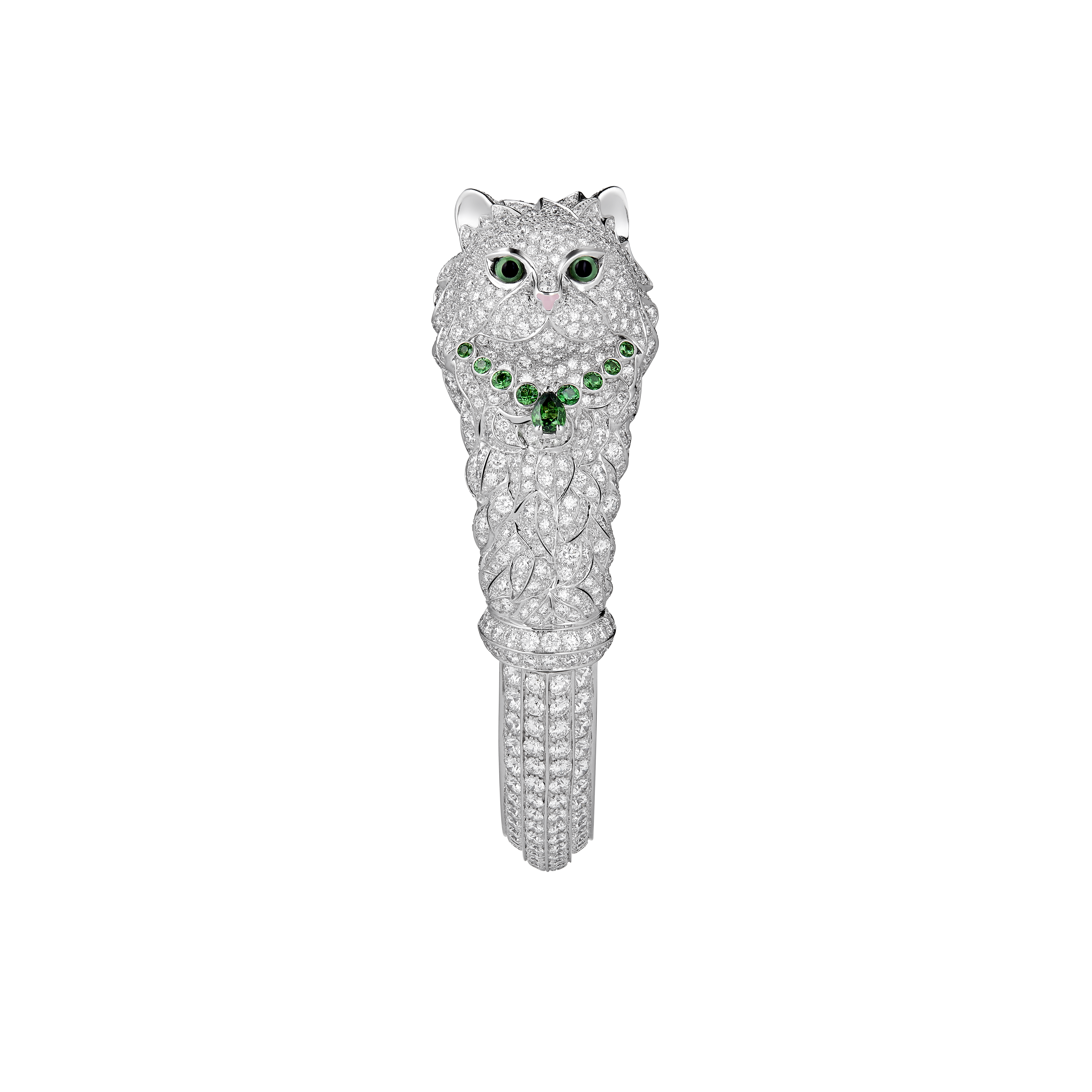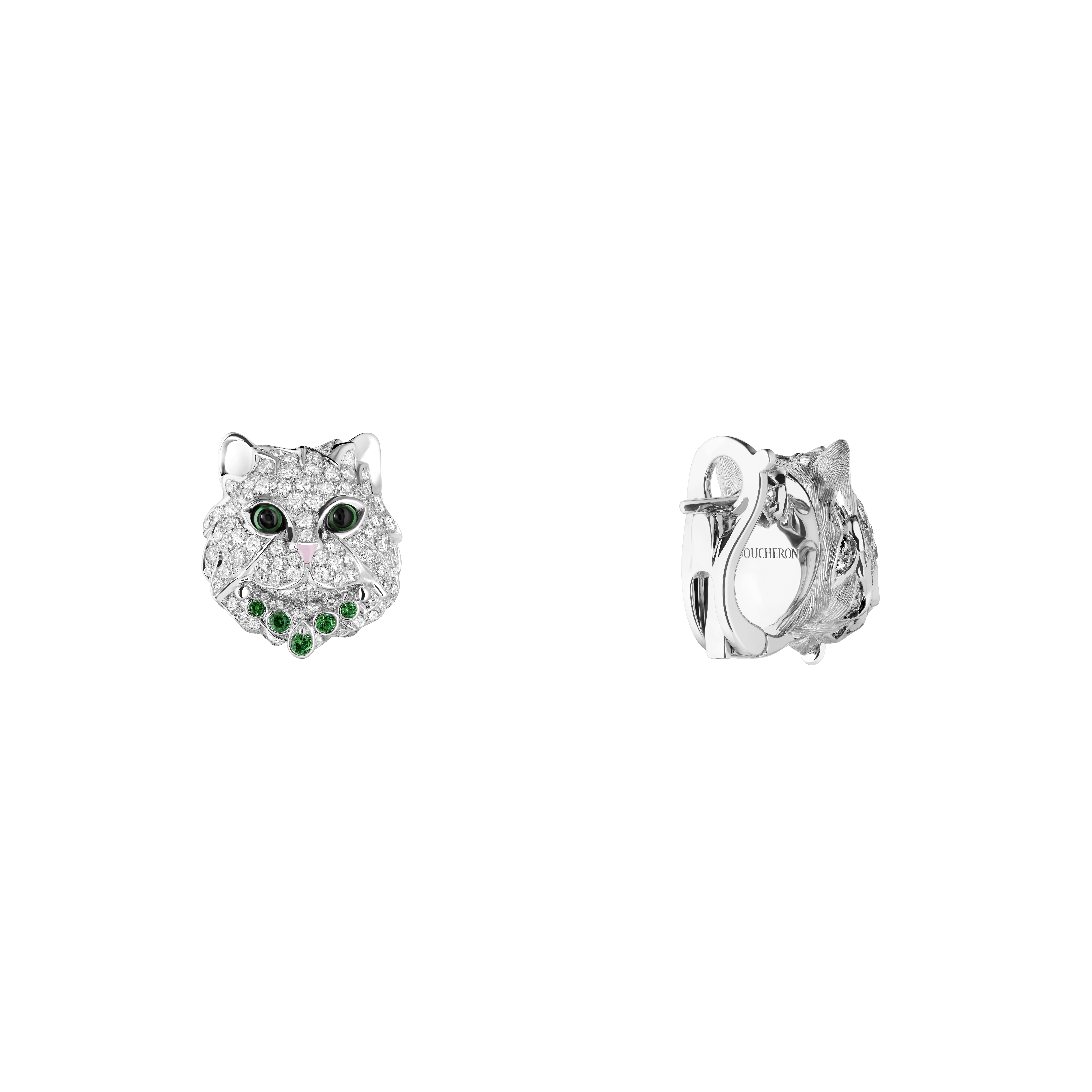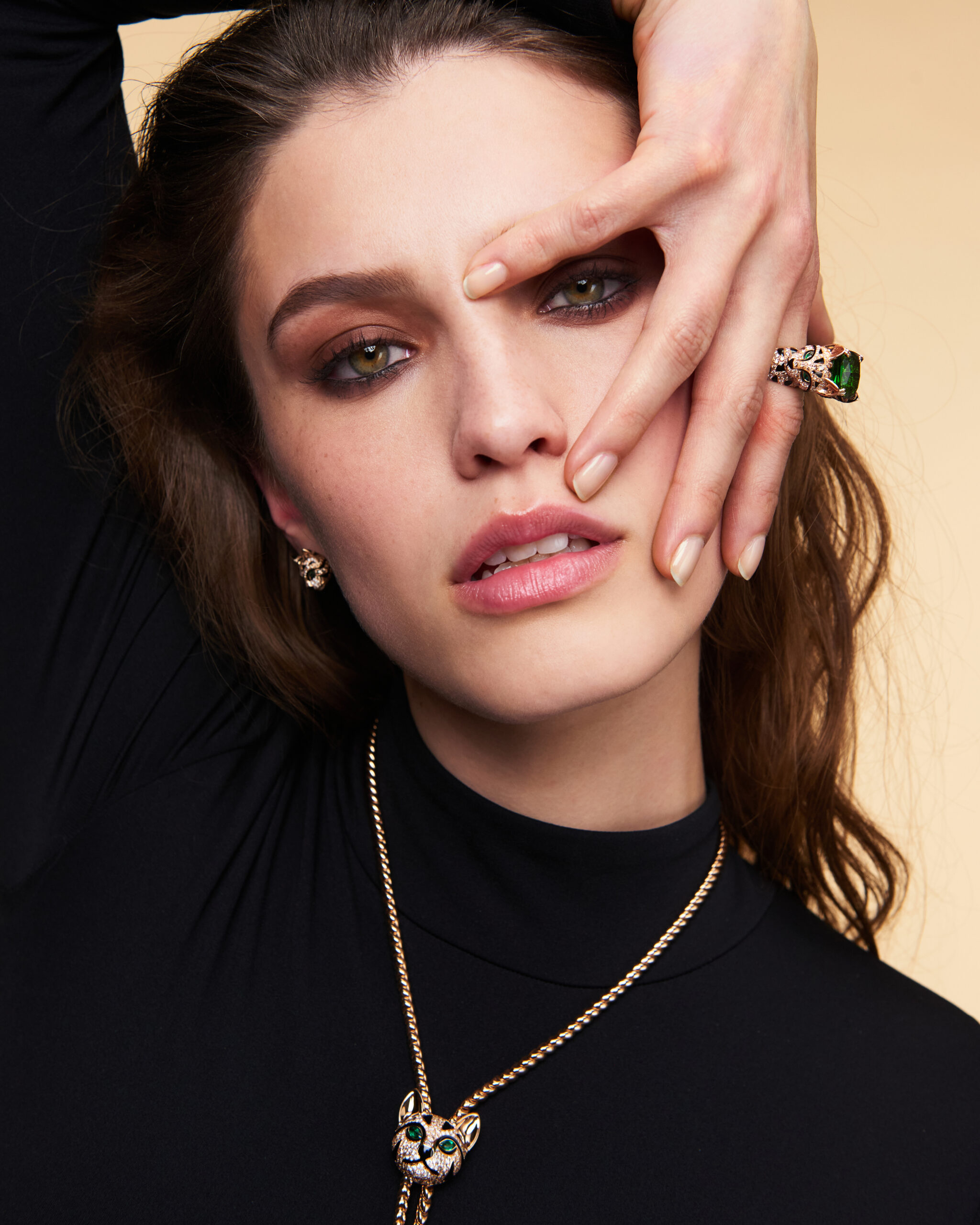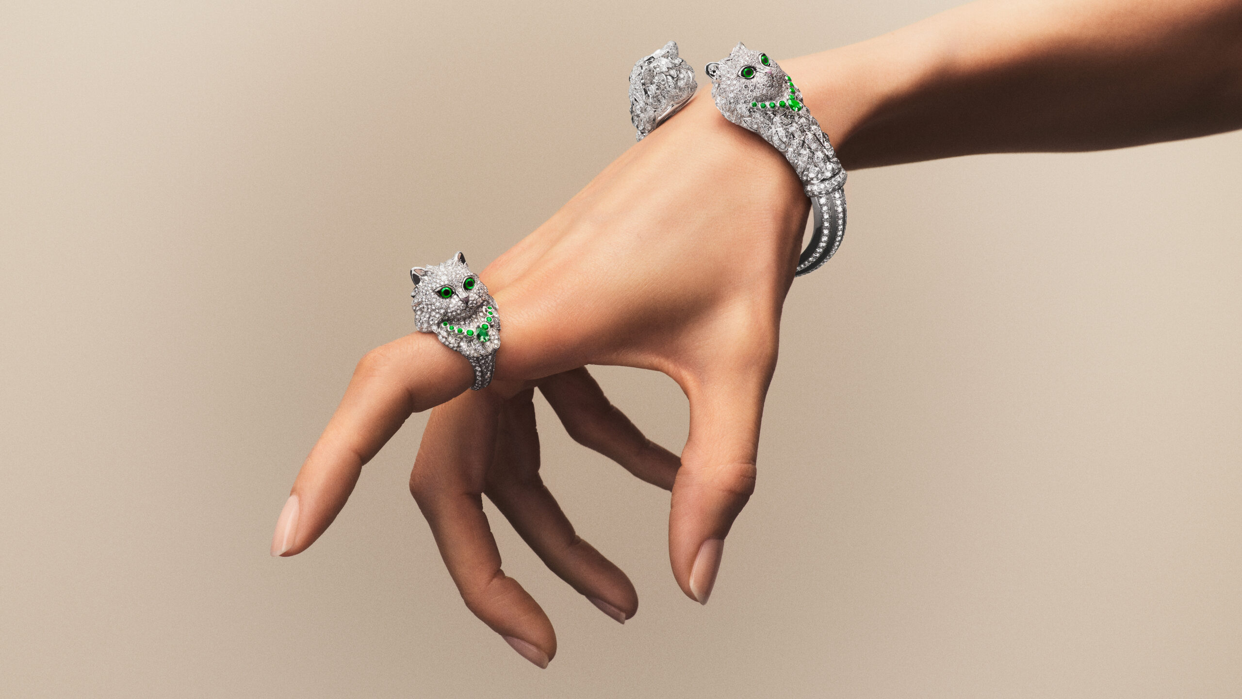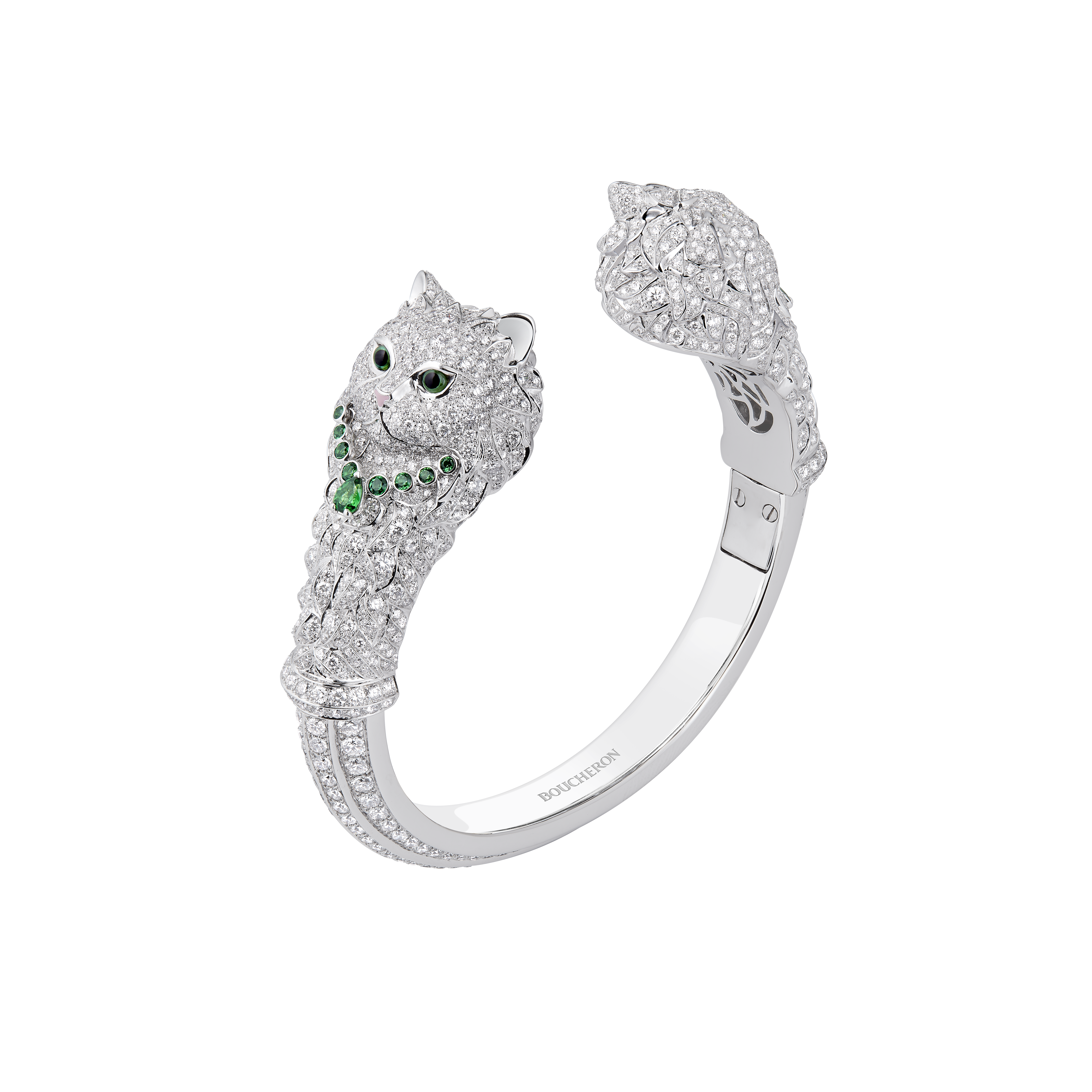 S’épanouir à travers les Collections Fétiches Il serait imprudent de passer sous silence les autres pièces qui continuent de faire la renommée de la maison. Fuzzy, le chat léopard, apparaît dans un sautoir joueur et dans un pendentif en édition limitée pour la nouvelle boutique de Ginza en septembre 2023. Wladimir, le chat emblématique de la maison, s’enrichit d’un collier multiporté, d’un bracelet ainsi que d’une paire de puces d’oreilles, chacun serti de tsavorites et saphirs noirs.