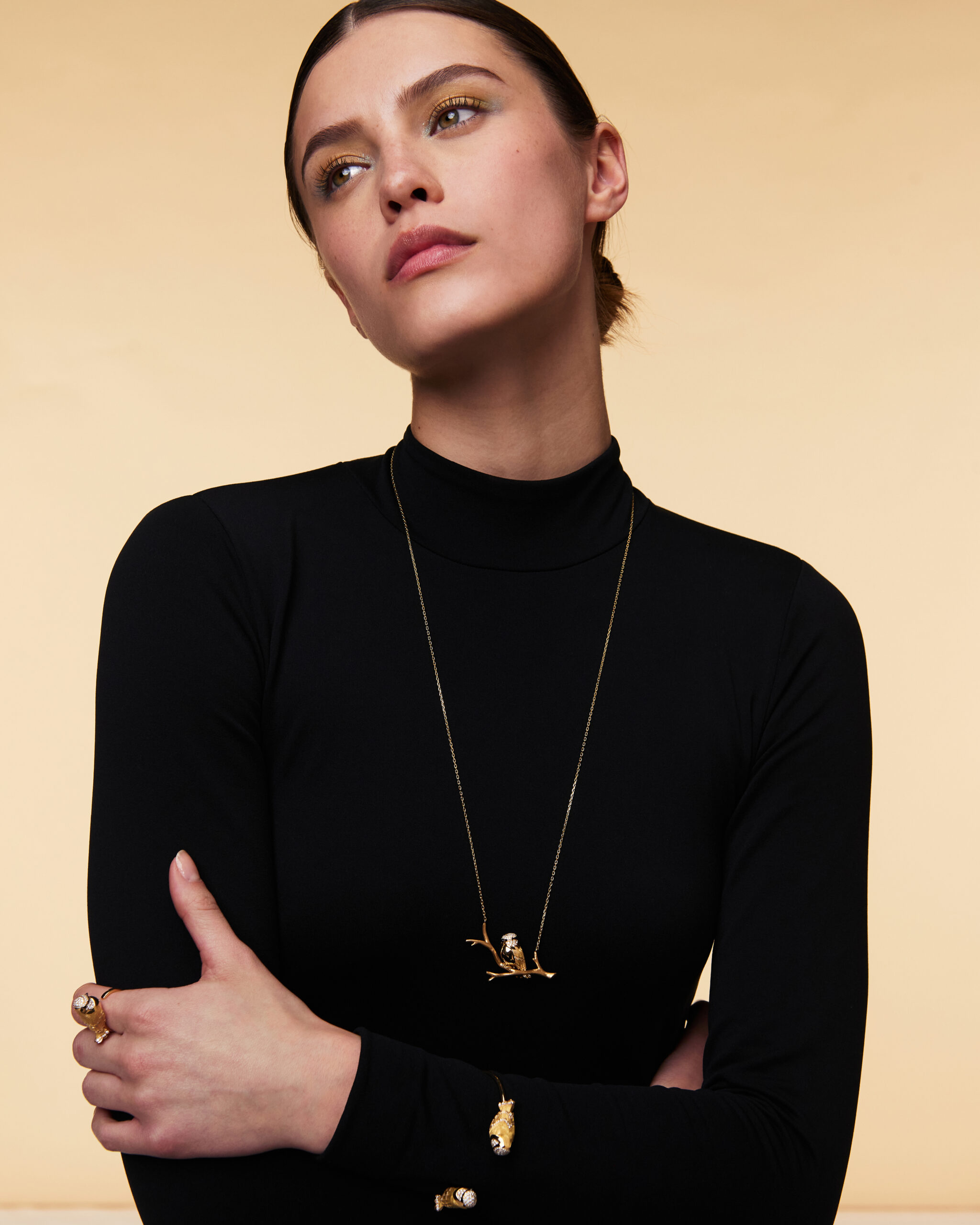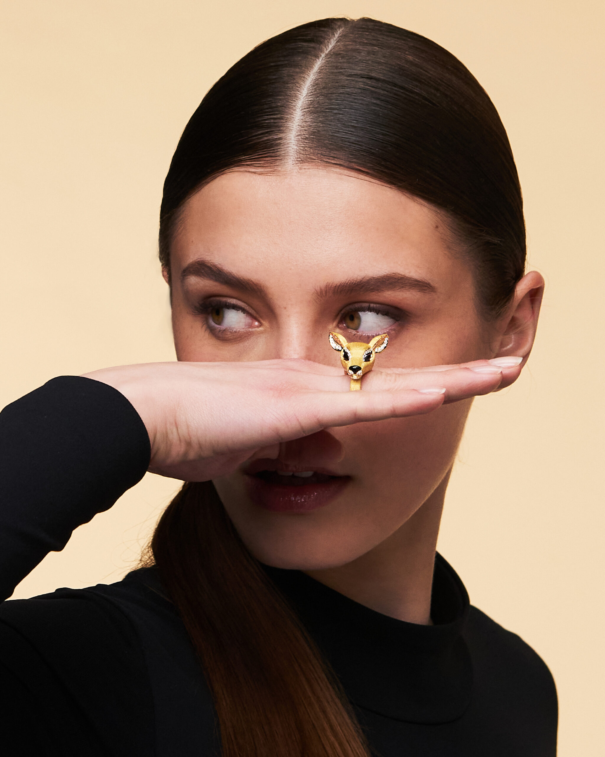 Le Bestiaire Fabuleux, entre Réel et Imaginaire Un hérisson, un panda, un chat, une cigale, une biche… Chaque animal de cette collection est plus qu’un bijou, c’est un totem, un compagnon de vie qui vient révéler une part de l’âme de son propriétaire. Le choix de chaque matière, la taille de chaque pierre précieuse, le moindre détail est conçu pour transformer ces bijoux en œuvres d’art en trois dimensions. Ici, saphirs, émeraudes et rubis deviennent les regards intenses d’un panda ou d’une cigale, tandis que l’or et les diamants dessinent des plumages et des pelages somptueux.