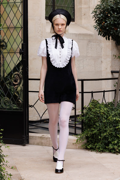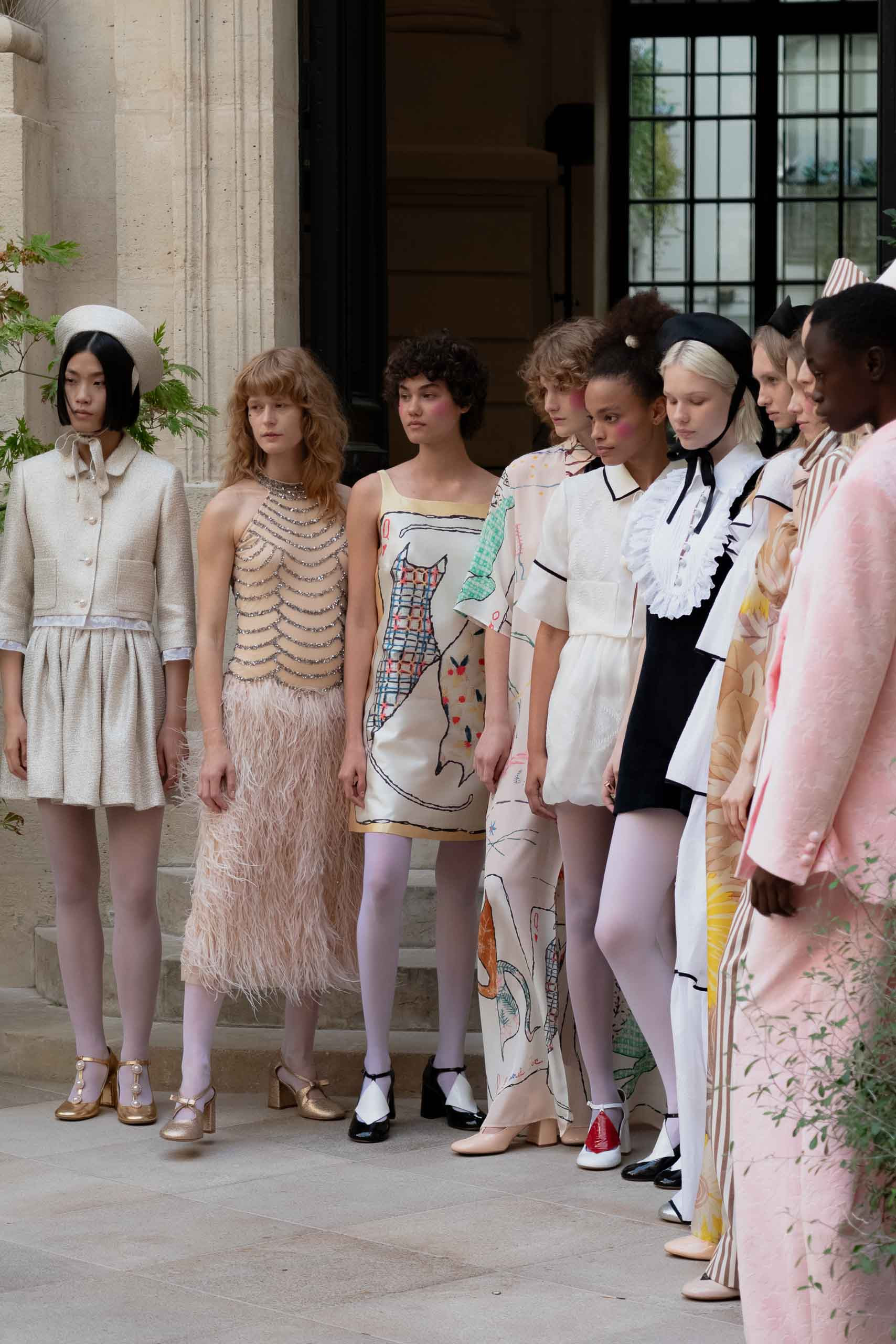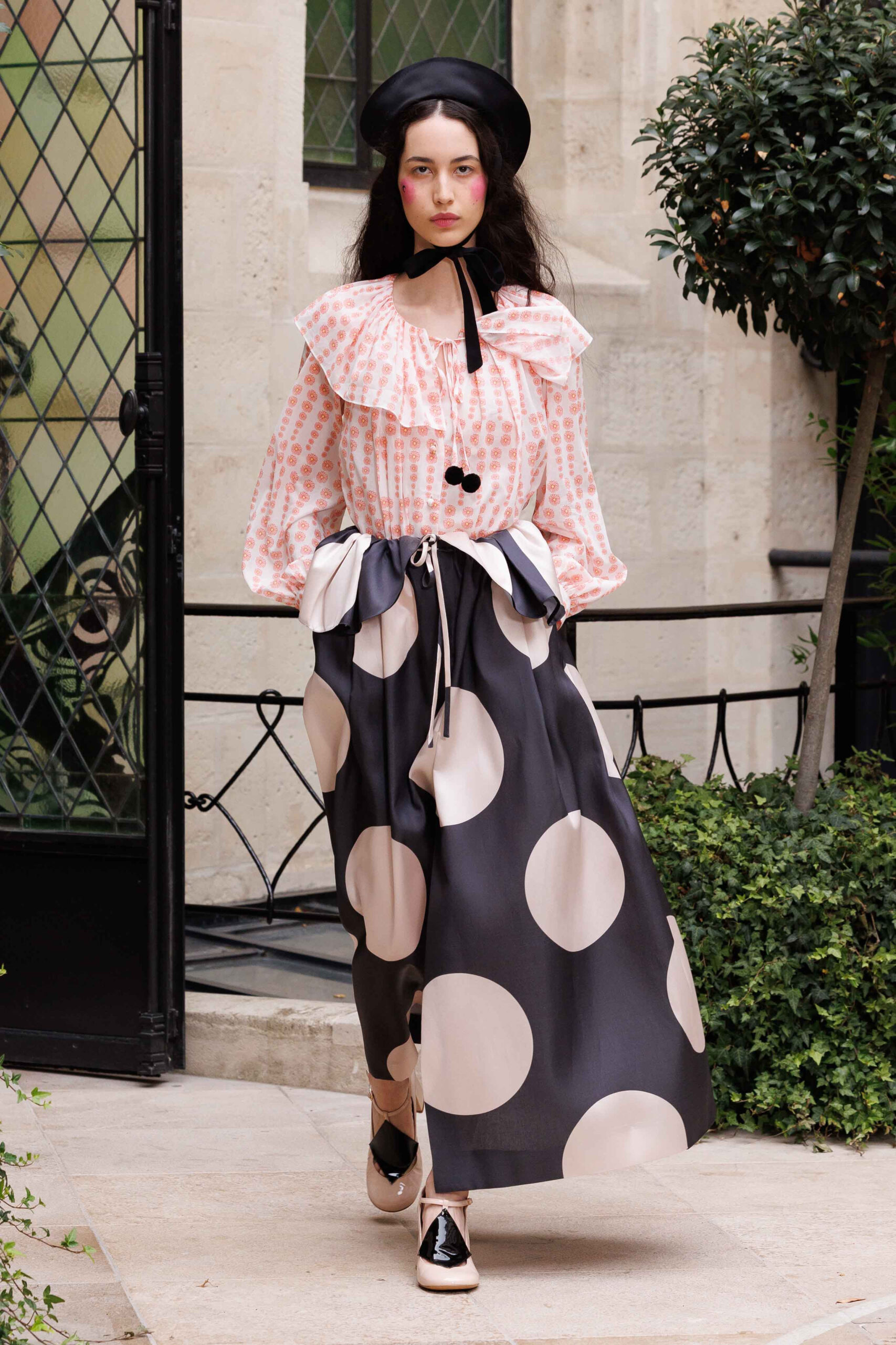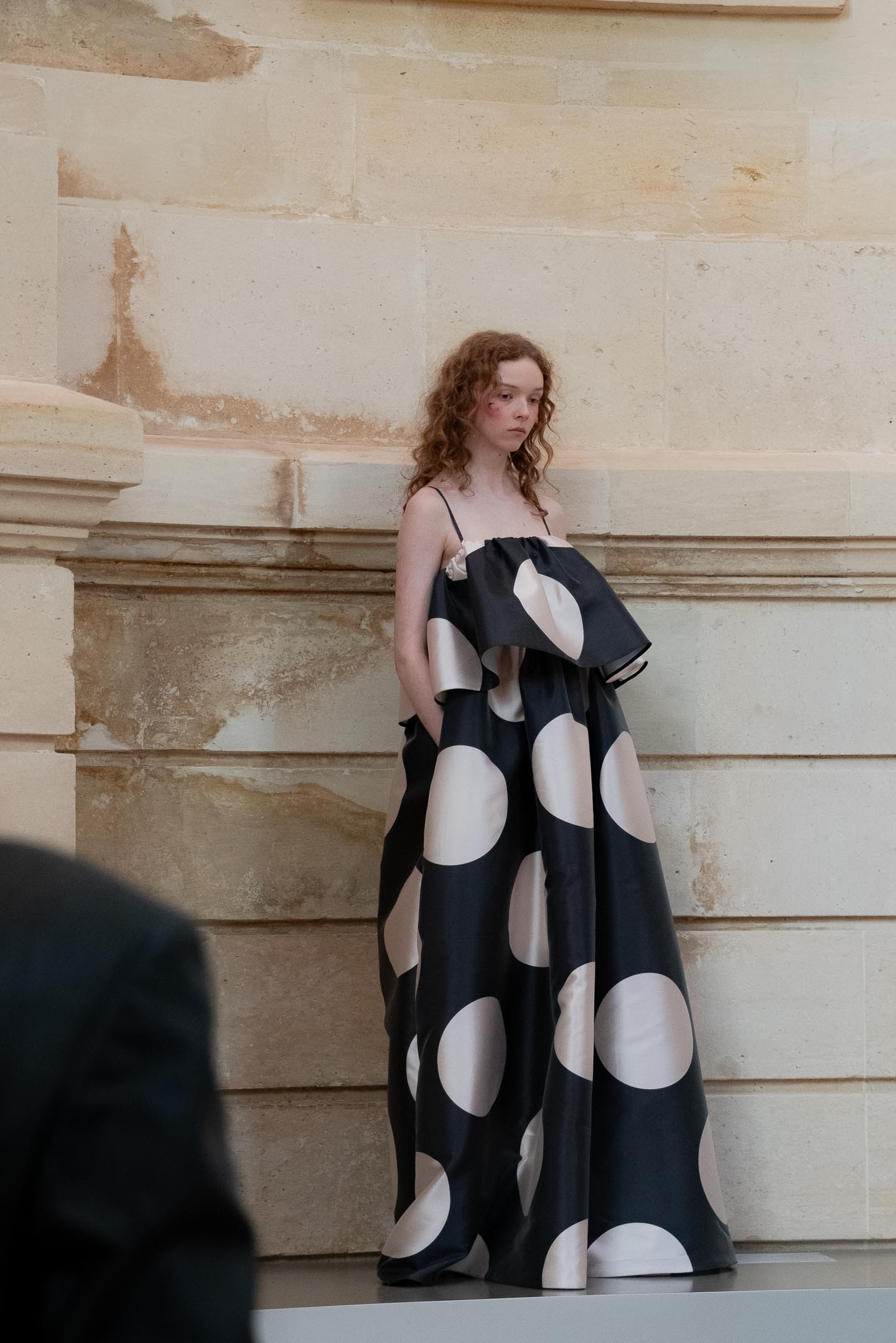 La collection est un festin visuel où la fantaisie scénique rencontre la réalité tangible. Les matières se déclinent en voiles de coton blanc ornés de pompons noirs contrastants, de mikado précieux couvert de pois gigantesques, et de mousseline de coton superposée avec de la dentelle Chantilly appliquée. C’est une célébration de la féminité, un flot de volants, de textures délicates et de formes sculpturales.