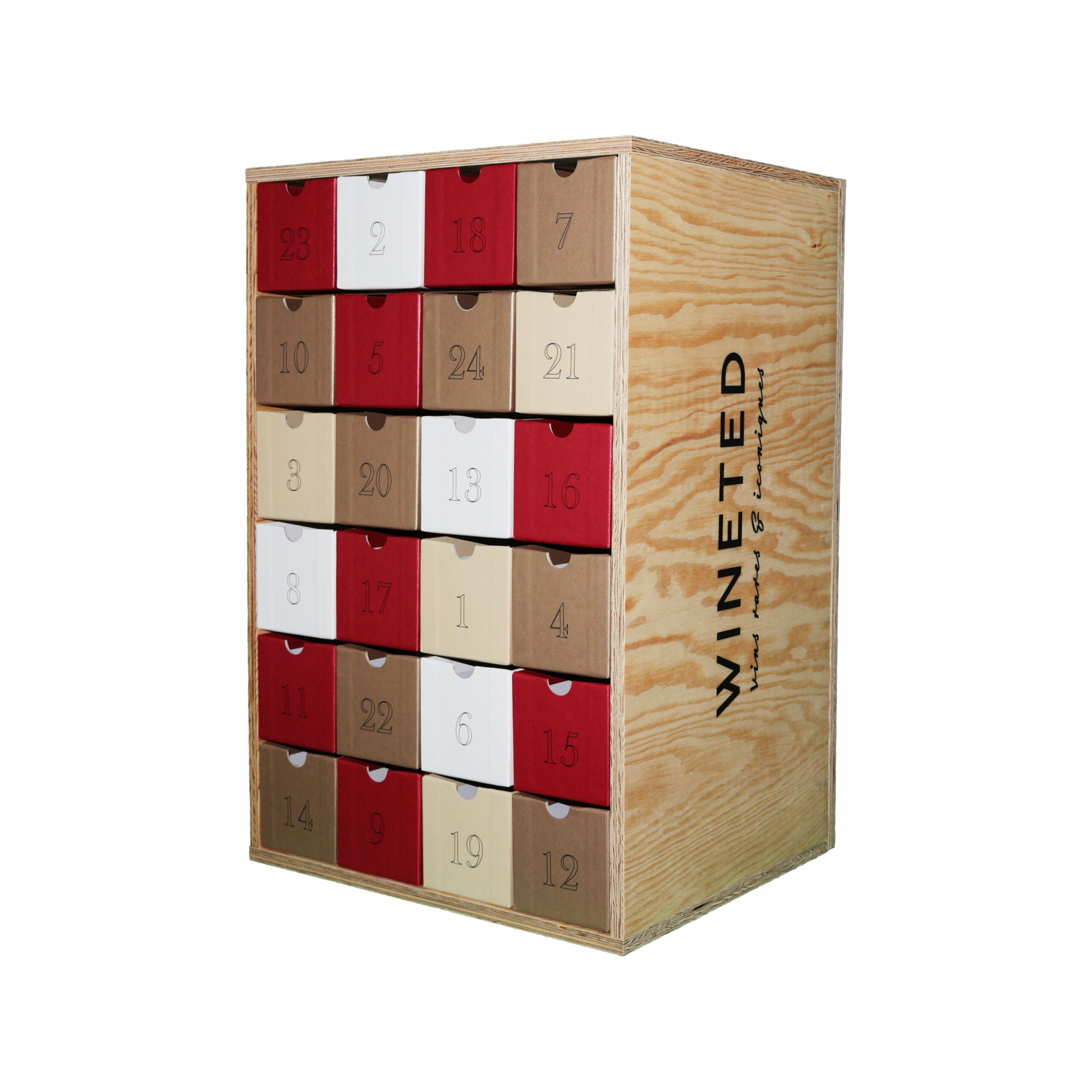 Établie comme l’une des maisons de négoce de vins rares les plus respectées, Wineted déploie un spectre de sélections exquises. Ce calendrier, audacieusement tarifé à 1 500 € TTC, propose une aventure sensorielle inédite avec une panoplie de 17 grands crus, 4 spiritueux et 3 assortiments de mets fins. De l’iconique Château d’Yquem au sublime Champagne Krug, chaque tiroir ouvert est une ode à l’excellence viticole. Complétant cette symphonie de saveurs, des accords mets et vins avec du foie gras, des truffes et du chocolat Ducasse sont habilement choisis pour enrichir l’expérience.