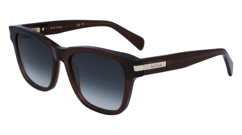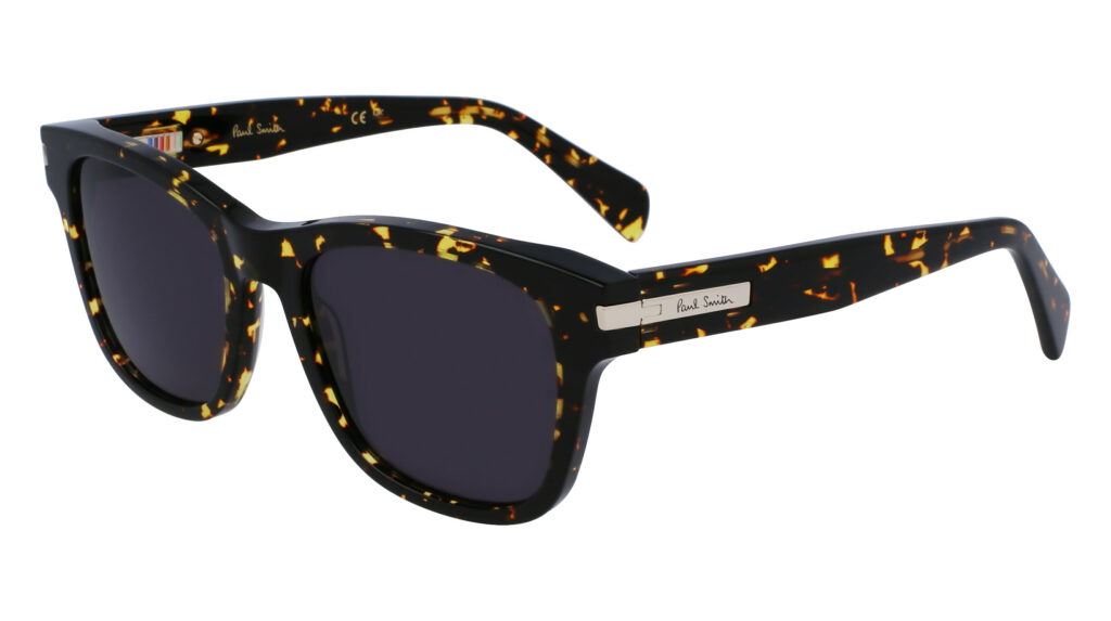 Paul Smith sait depuis toujours concilier l’indémodable avec le surprenant. Par exemple, le modèle Howitt, ces solaires carrées conçues en acétate de première qualité, propose de nouvelles charnières intégrées en métal, signées par le logo Paul Smith. Non seulement cela, mais un bas-relief Artist Stripe en émail orne l’intérieur de ces mêmes charnières. L’Artist Stripe, cette bande multicolore, apparaît comme une ponctuation discrète mais significative de l’identité de la marque. Les Howitt sont proposées en plusieurs coloris, du Black de la campagne publicitaire AH23 au Transparent Brown, Transparent Avio et Havana.