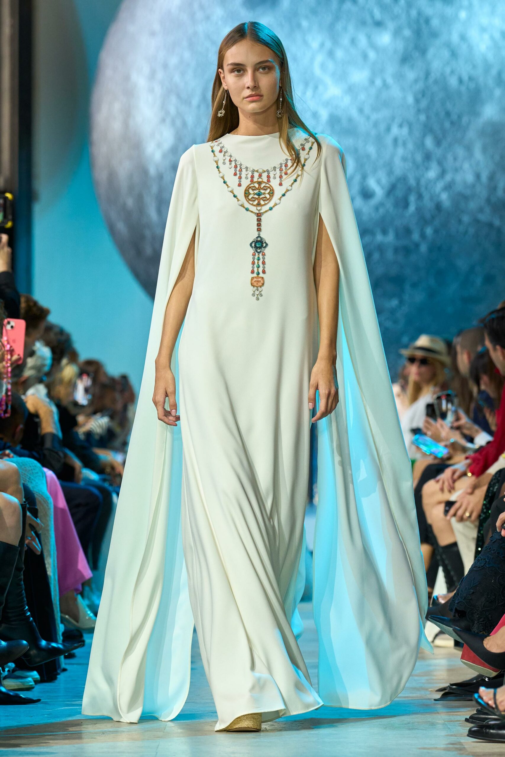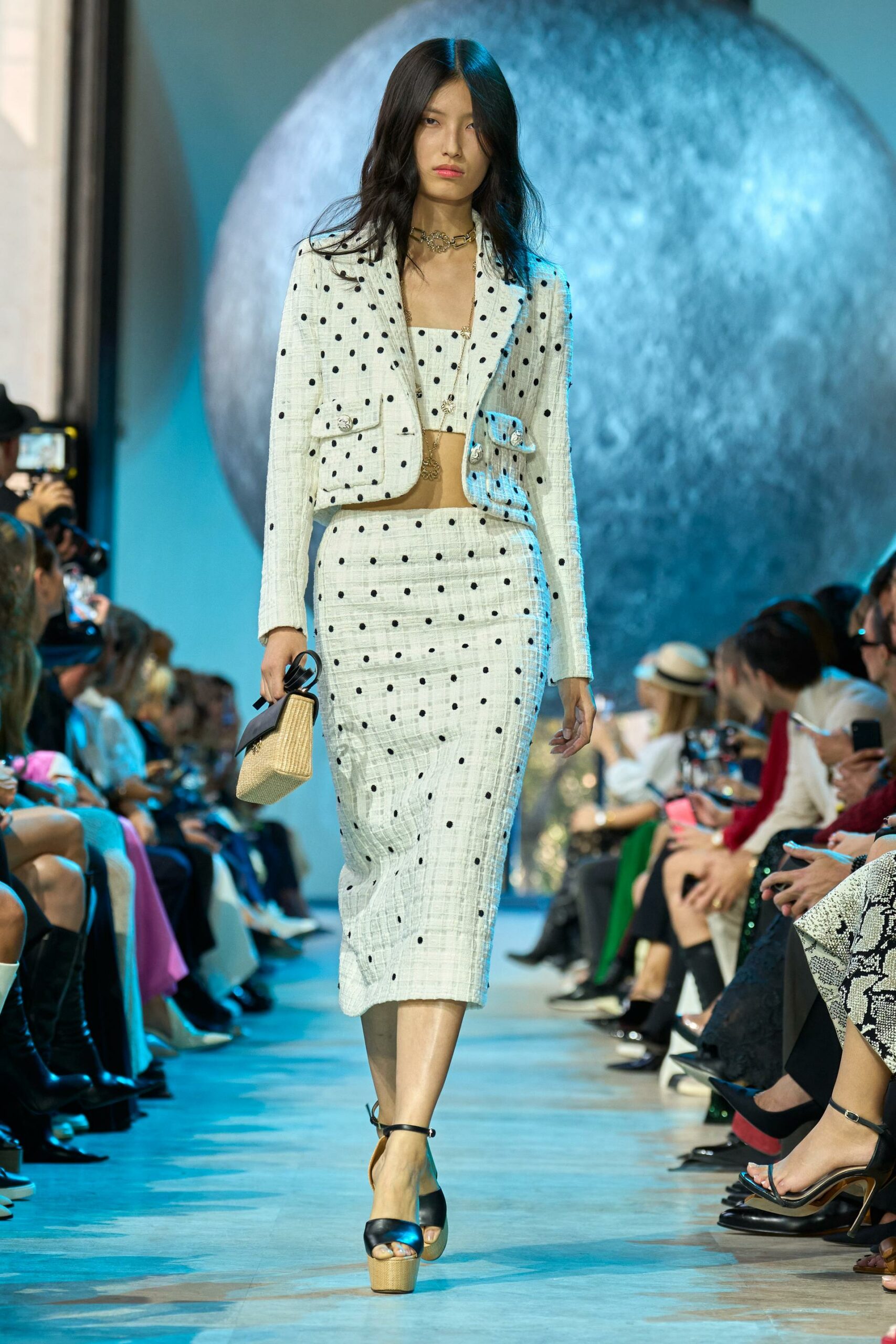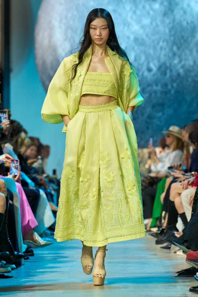 Les accessoires ne sont pas en reste, avec des plateformes en cuir raffia, des mini sacs à poignée supérieure et des bijoux extravagants en pierres précieuses qui complètent l’ensemble.