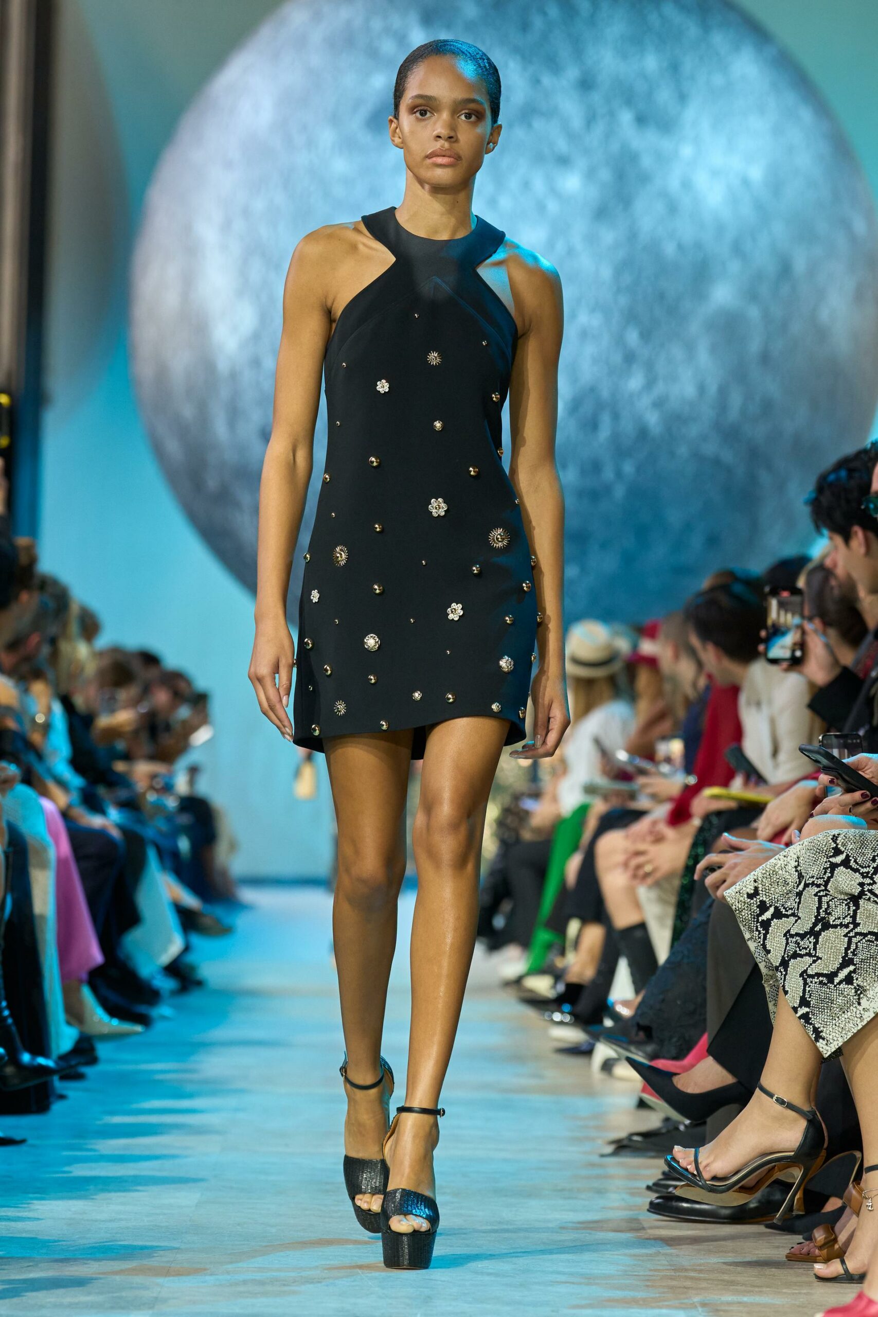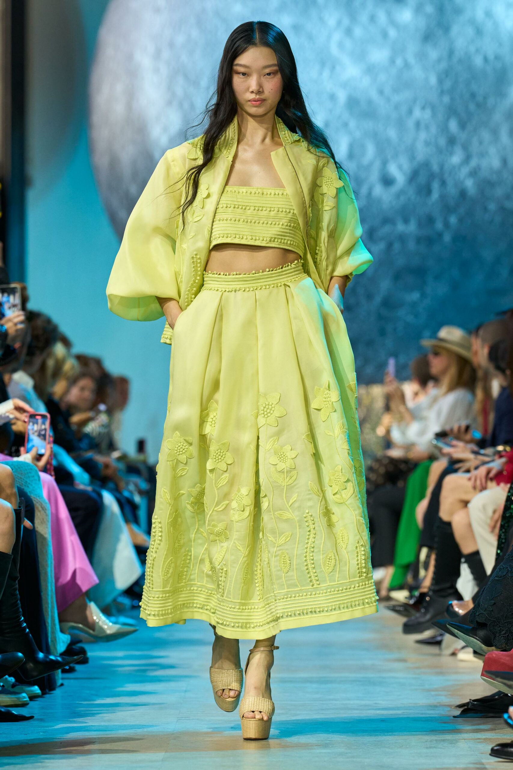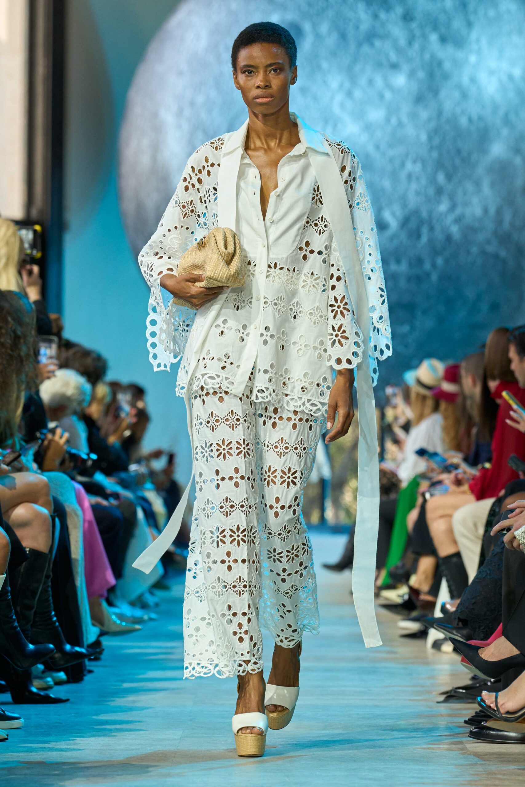 Les accessoires ne sont pas en reste, avec des plateformes en cuir raffia, des mini sacs à poignée supérieure et des bijoux extravagants en pierres précieuses qui complètent l’ensemble.