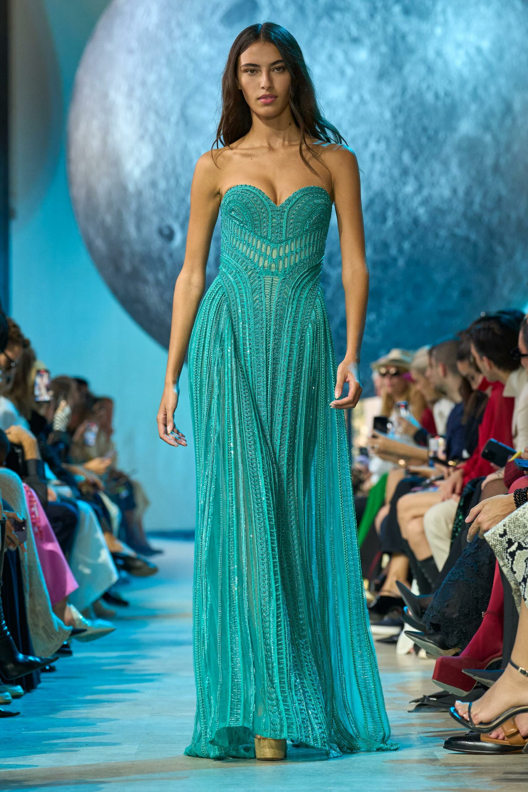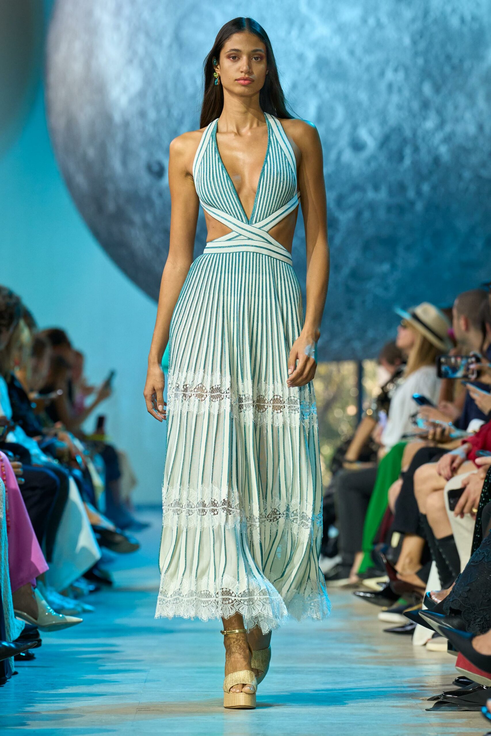 L’inspiration méditerranéenne est palpable, avec une femme ELIE SAAB qui, de nature chic et charismatique, se dirige vers des fêtes luxueuses qui s’épanouissent dans sa lueur nocturne. Elle se faufile avec aisance parmi les verres tintants et la foule détendue, se déplaçant entre les pistes de danse et les bords de piscine scintillants sous le reflet bleuté de la lune.