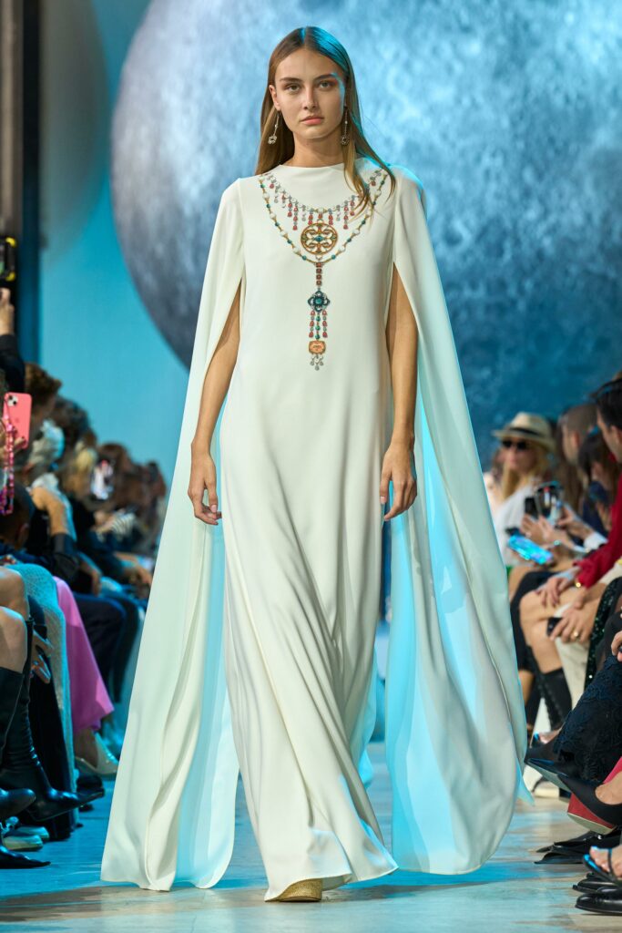 Les tenues de jour radiantes d’ELIE SAAB sont conçues pour des rassemblements sous le clair de lune, avec des robes d’été au dos nu et des ourlets festonnés en grande dentelle blanche anglaise. Les fleurs d’organza aux nuances d’agrumes fleurissent des ourlets monochromatiques des blousons en soie billowy, tandis que de grosses gemmes trompe-l’œil et des chaînes de platine ornent une kaftane blanche avec une cape élégante. Les perles en couleurs Spritz et Gin Blue dévalent des robes asymétriques aux découpes géométriques ludiques.
