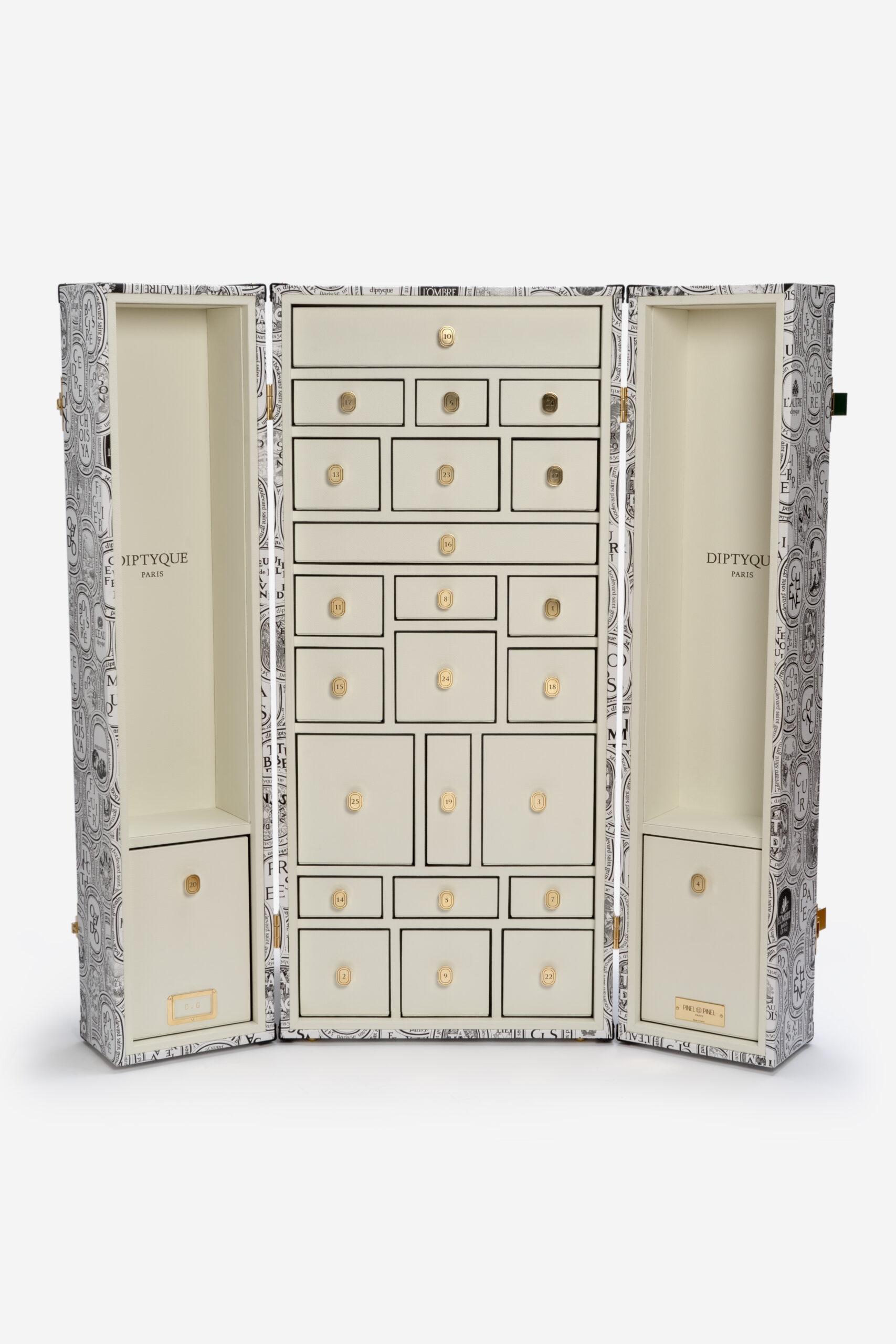 L’alliance de deux maisons de renom, Diptyque et Pinel et Pinel, est une célébration du savoir-faire français. Fred Pinel, armé de l’excellence de ses artisans, fait naître depuis 2004 des malles de luxe qui sont le fruit d’une quête incessante de perfection. C’est dans cet esprit que Diptyque a sollicité l’expertise de Pinel et Pinel pour donner vie à un concept révolutionnaire : un calendrier de l’Avent redéfini en malle d’exception, véritable cabinet de curiosités des temps modernes.