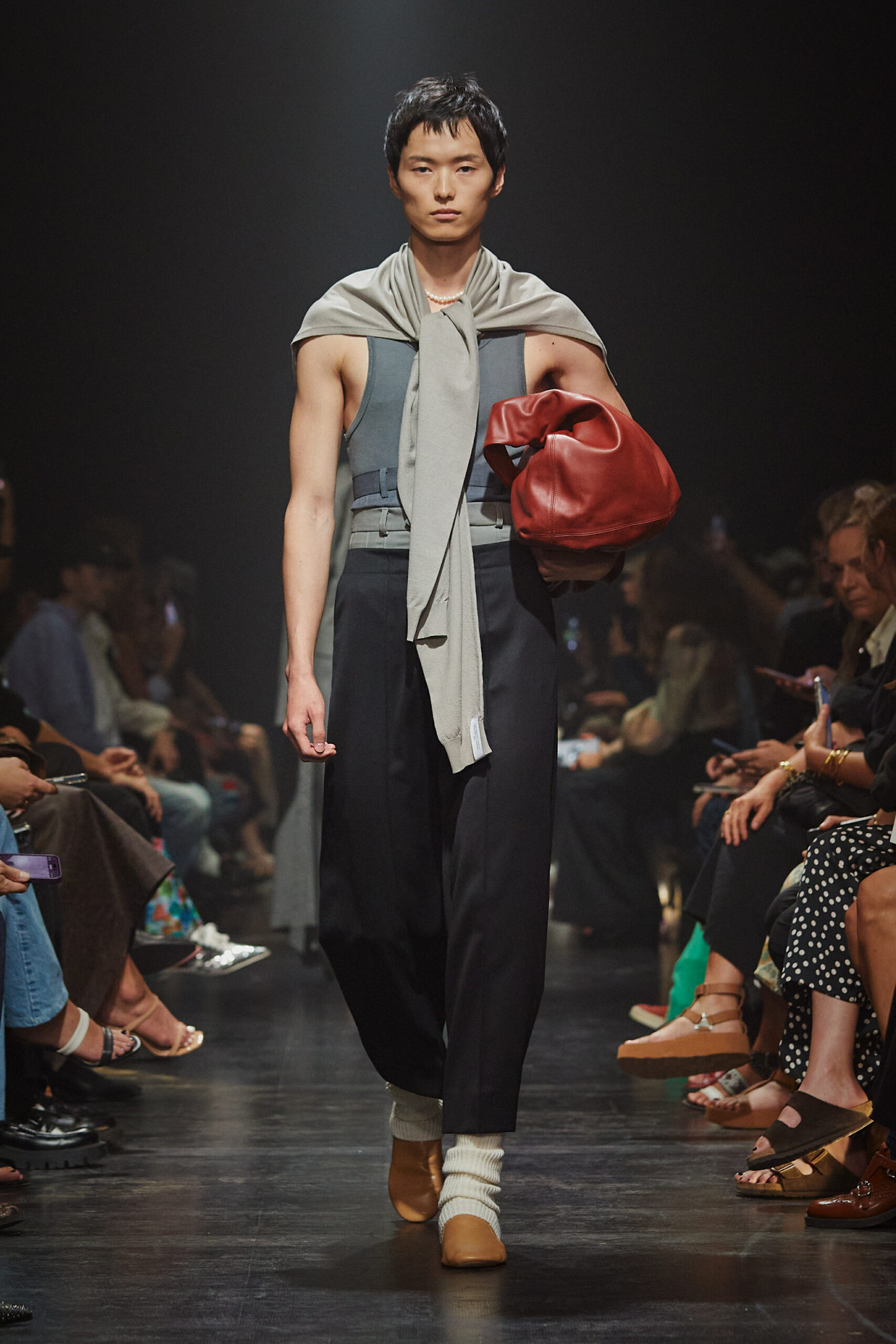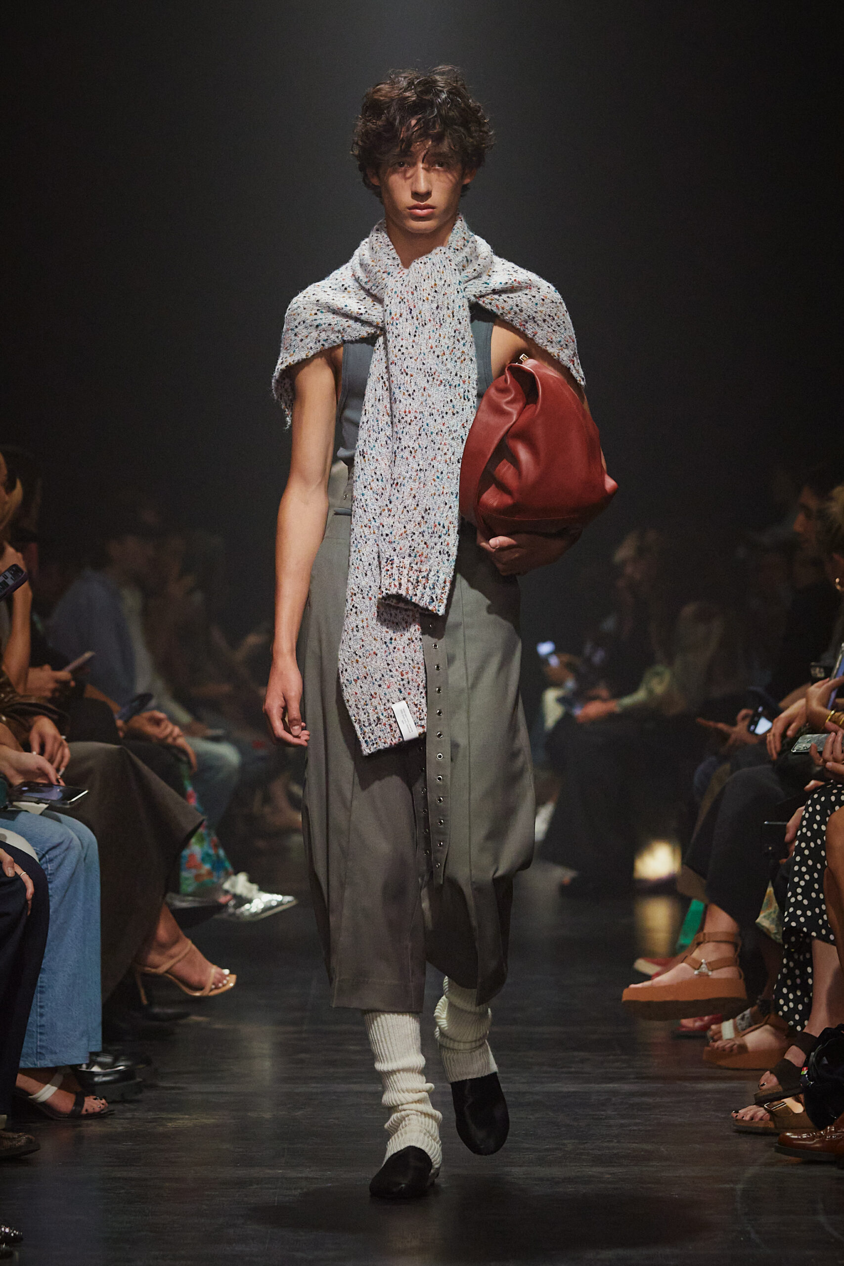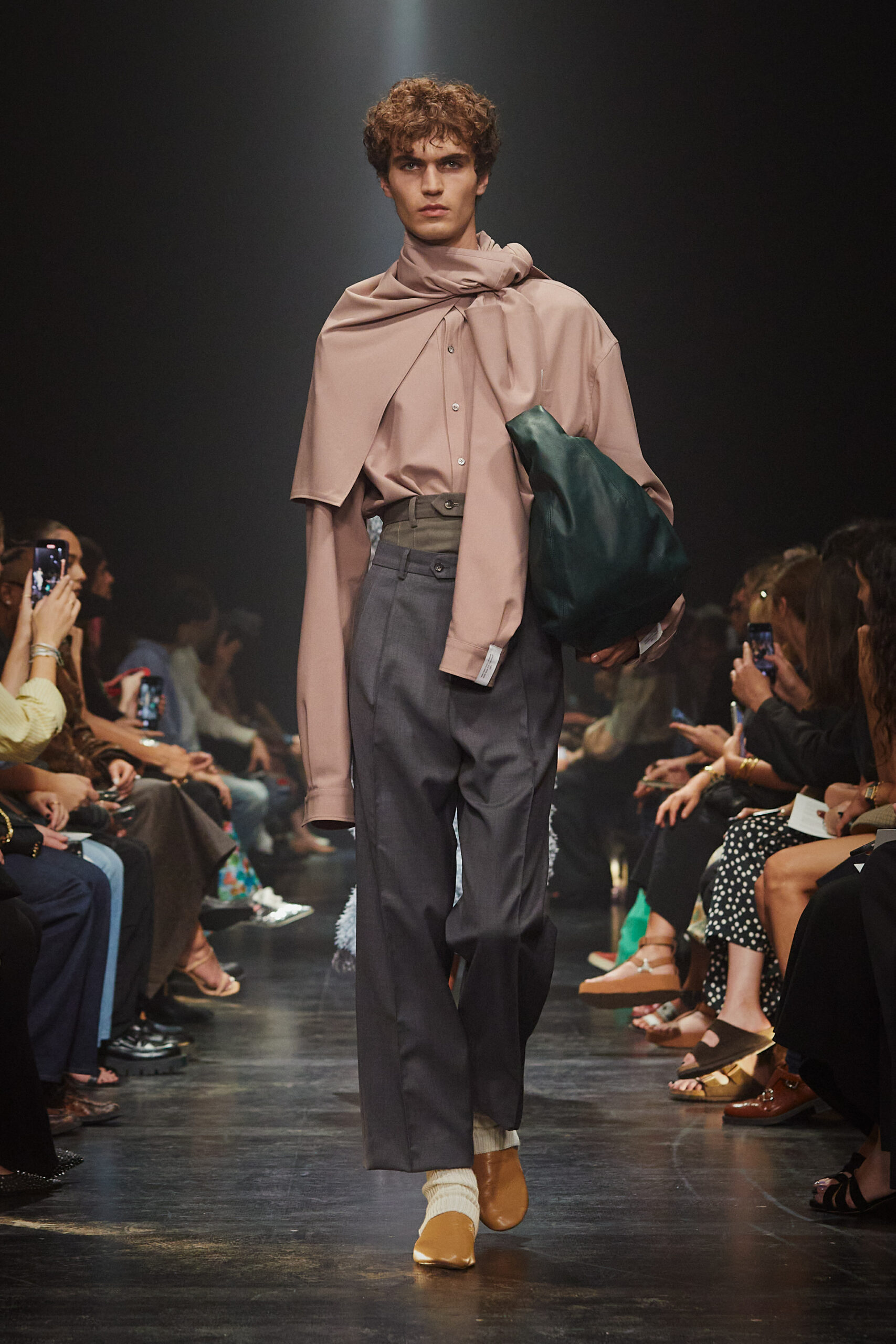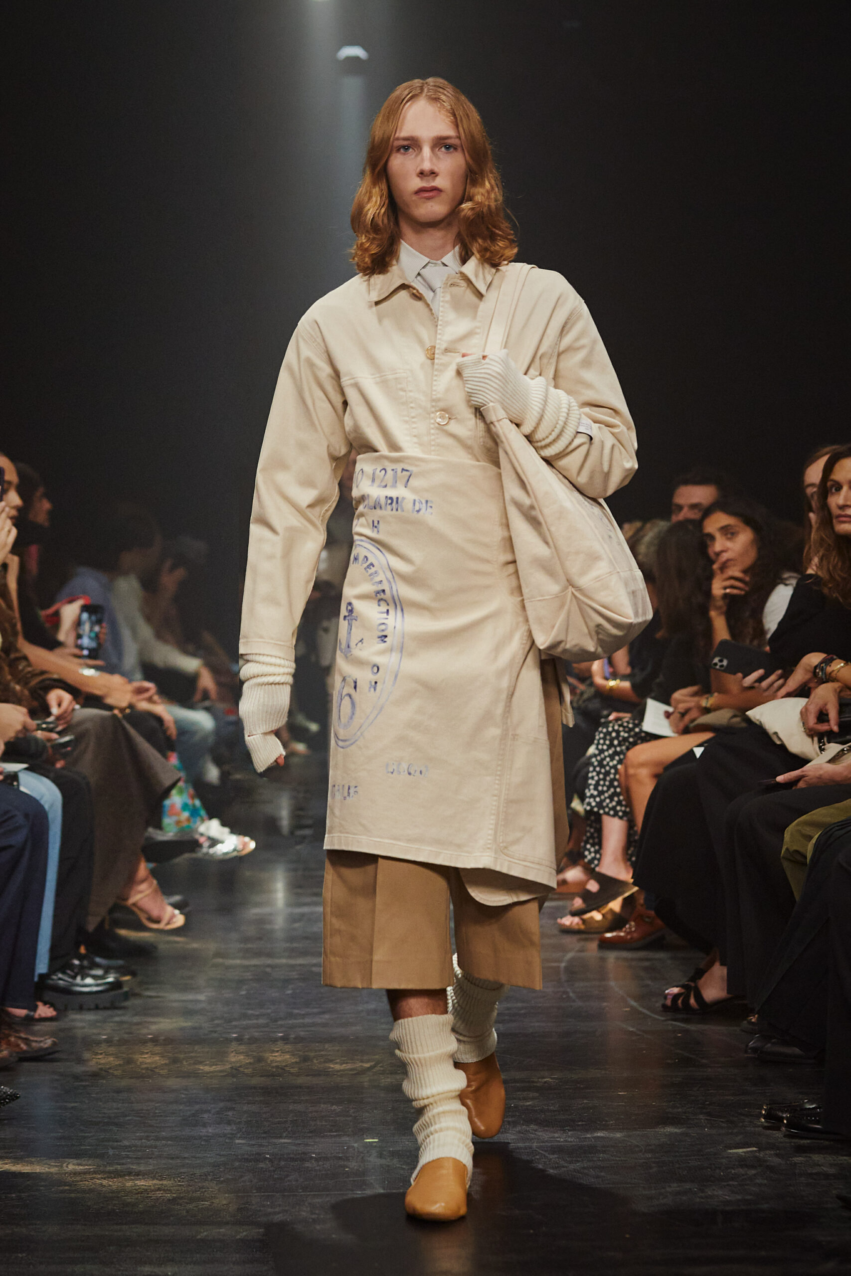Les matières employées puisent dans un registre artisanal au charme désuet : coton drill, twill de cavalerie, mailles, denim… À ces textures brutes font écho de plus délicats chiffons, dentelles crochetées ou soies pour un ensemble harmonieux et contrasté. Le créateur n’hésite pas à bousculer le vestiaire avec des touches de vinyle, cuir épais ou latex façon Mackintosh.