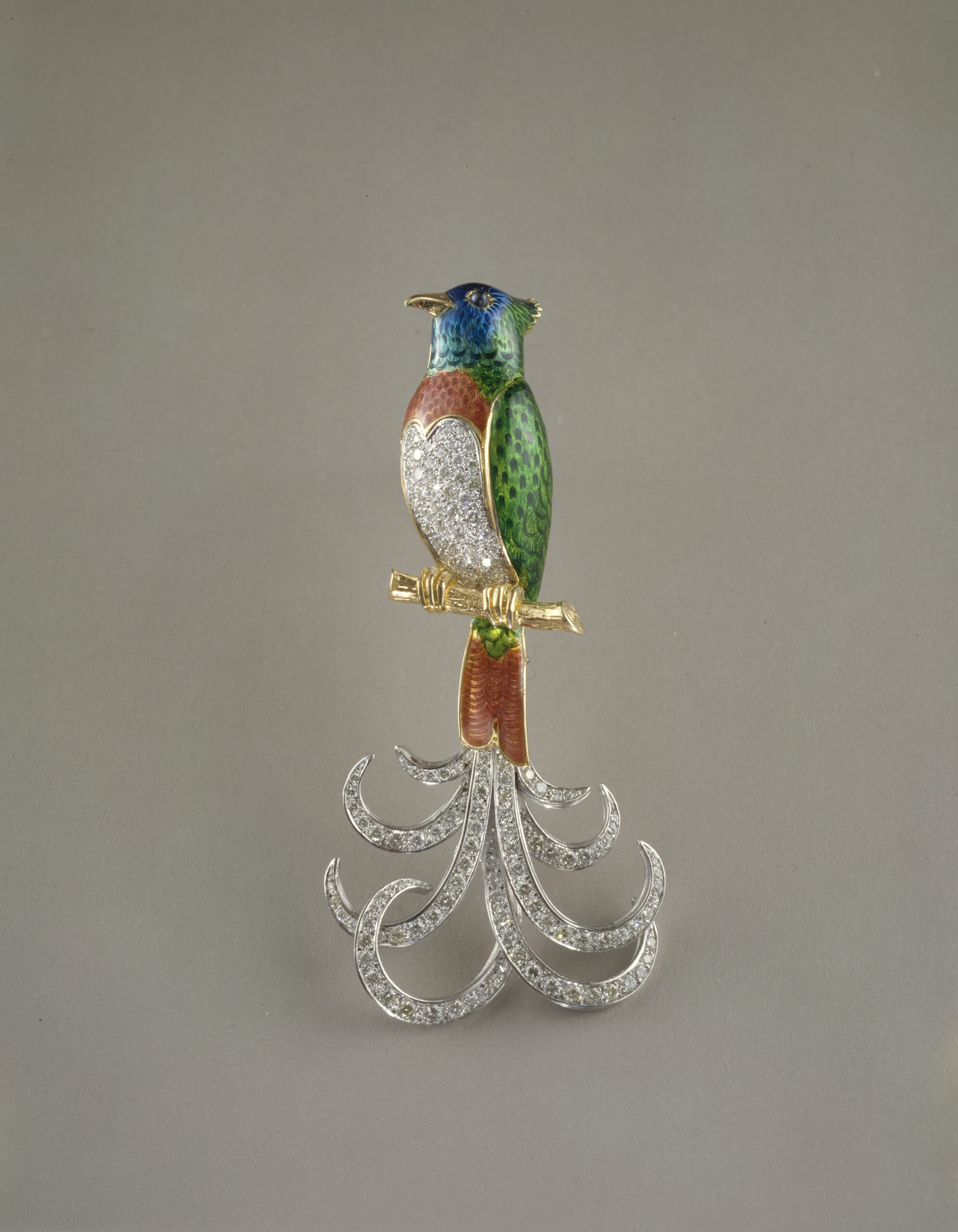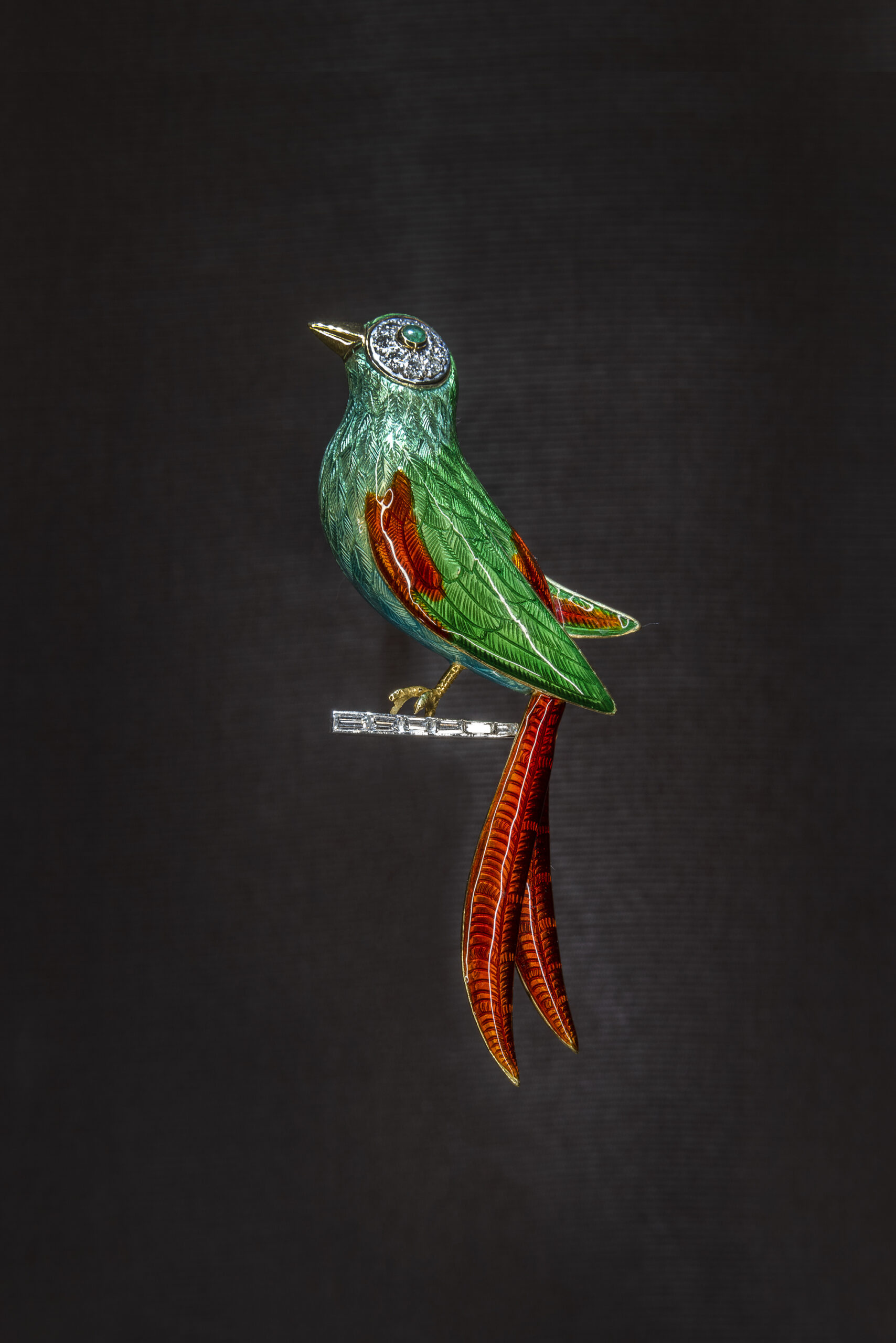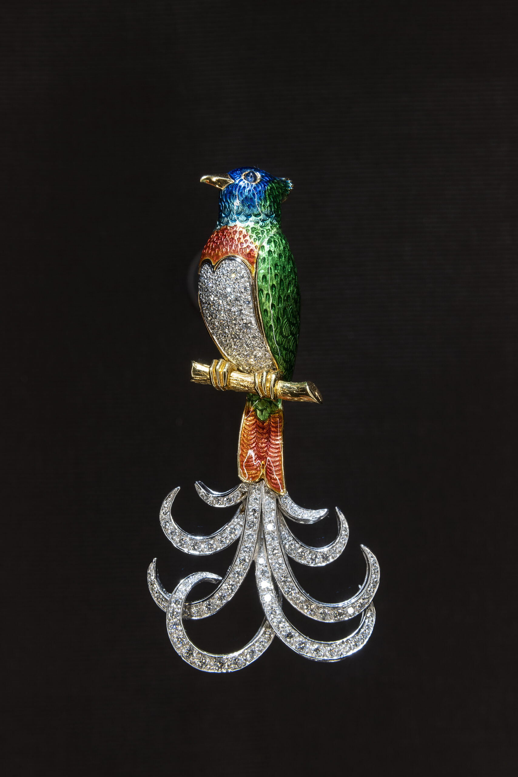 Entre les vitrines aux reflets dorés, quatre pièces d’archives illustrent l’inspiration naturaliste de Frédéric Boucheron. Une broche papillon de 1900 ayant appartenu à Elizabeth Taylor côtoie ainsi un oiseau multicolore des années 1950. De précieux témoins du patrimoine de la maison.