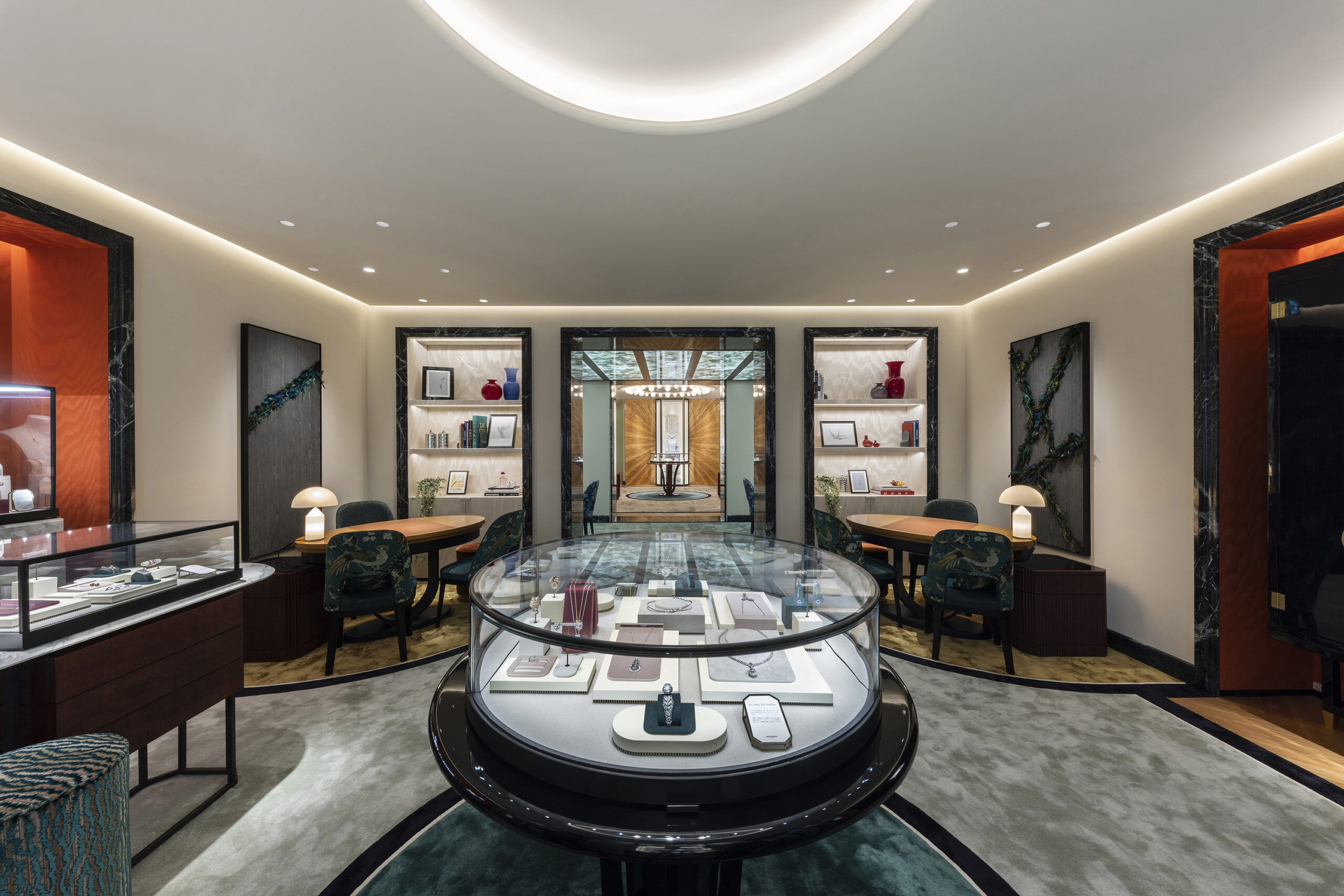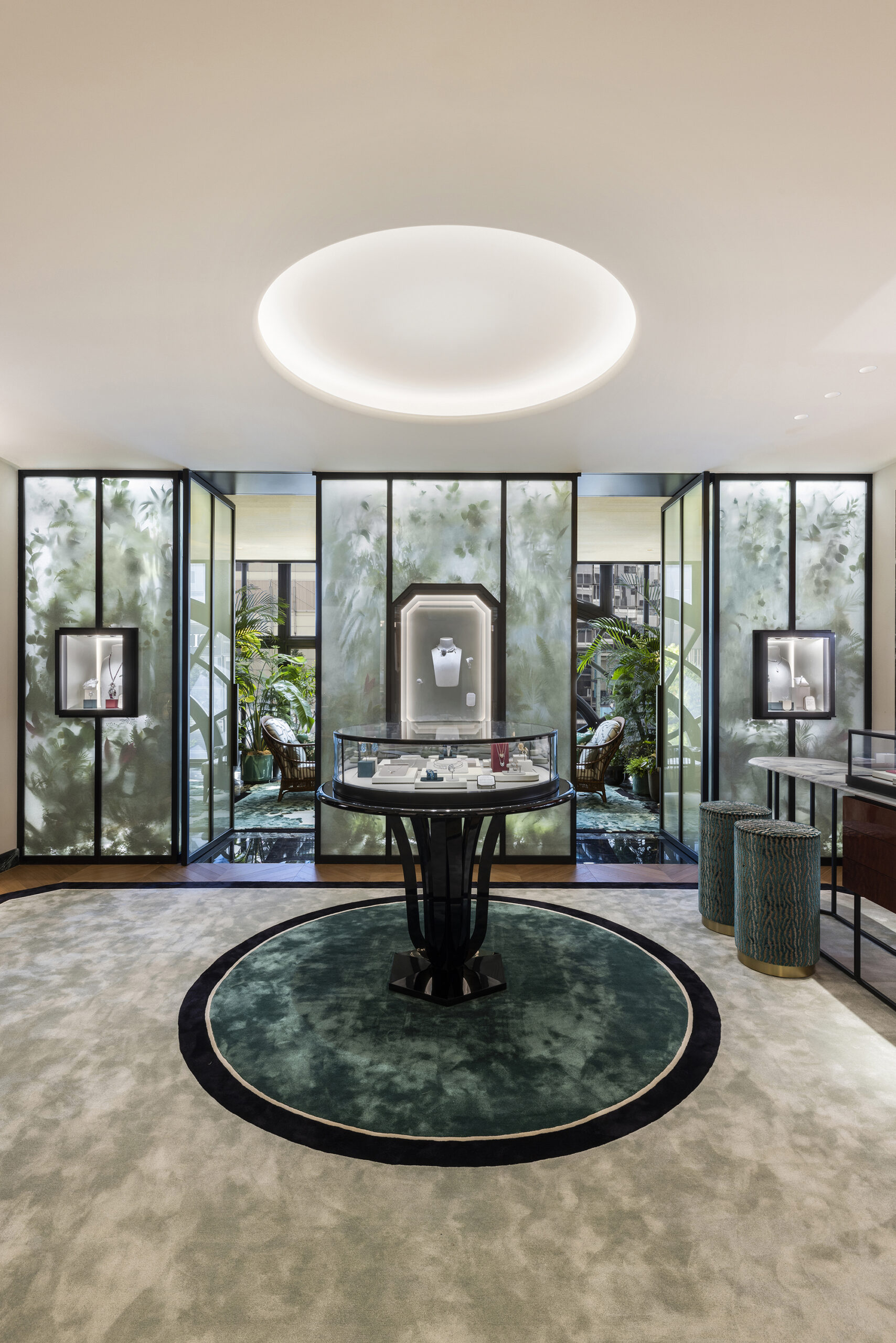 Dès le rez-de-chaussée, le décor transporte dans l’univers de la maison parisienne. On y retrouve ses collections emblématiques Quatre, Animaux de Collection ou Serpent Bohème, mises en scène au milieu d’une végétation luxuriante. Les murs tapissés de soie emmènent la nature à l’intérieur, prolongeant l’esprit jardin.