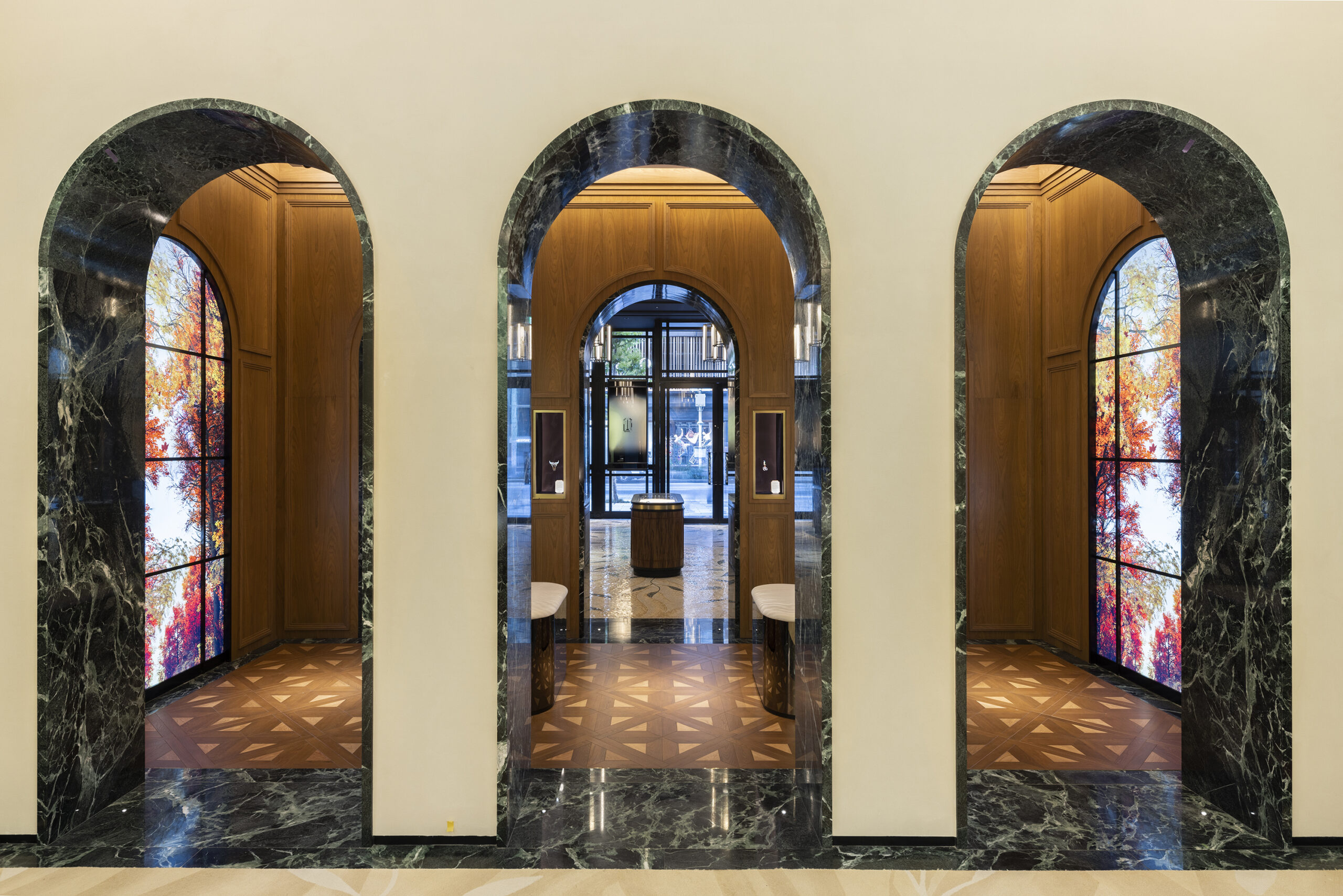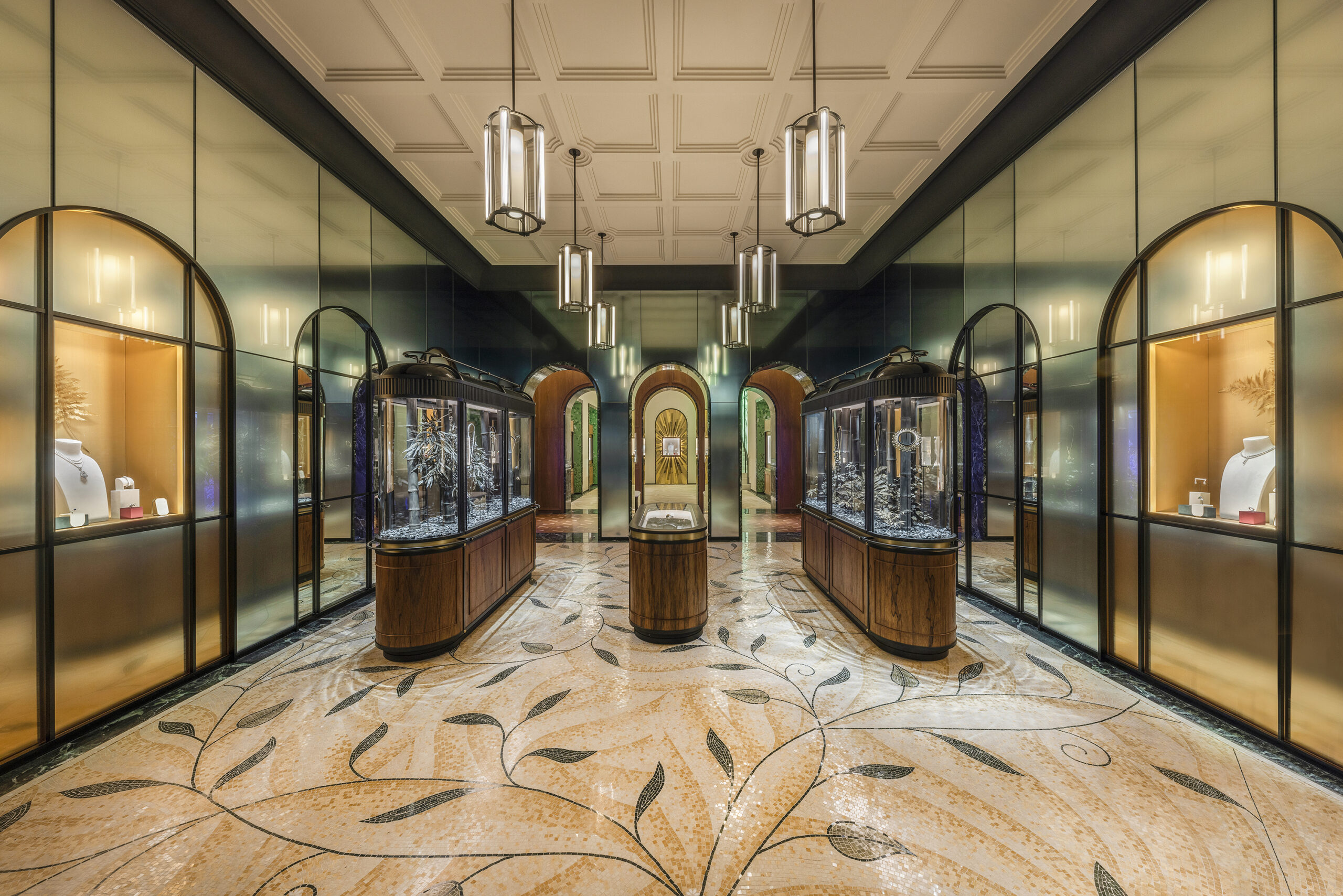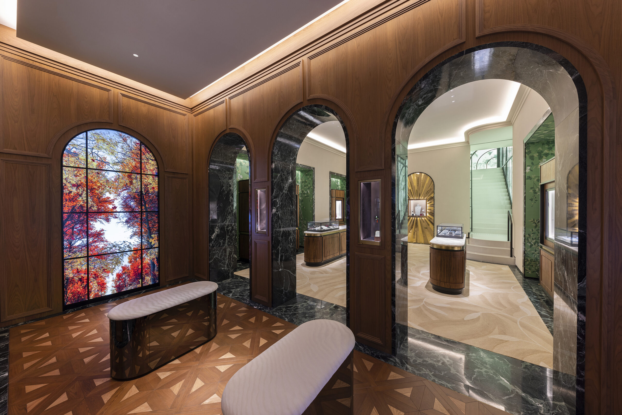 Dès le premier regard sur la façade, le visiteur est saisi par la magie du lieu. La devanture s’inspire des motifs Art nouveau de la verrière du flagship parisien, Place Vendôme. La journée, sa transparence révèle les étages intérieurs. La nuit, elle s’anime tel une forêt numérique grâce à des images de nature générées en temps réel.