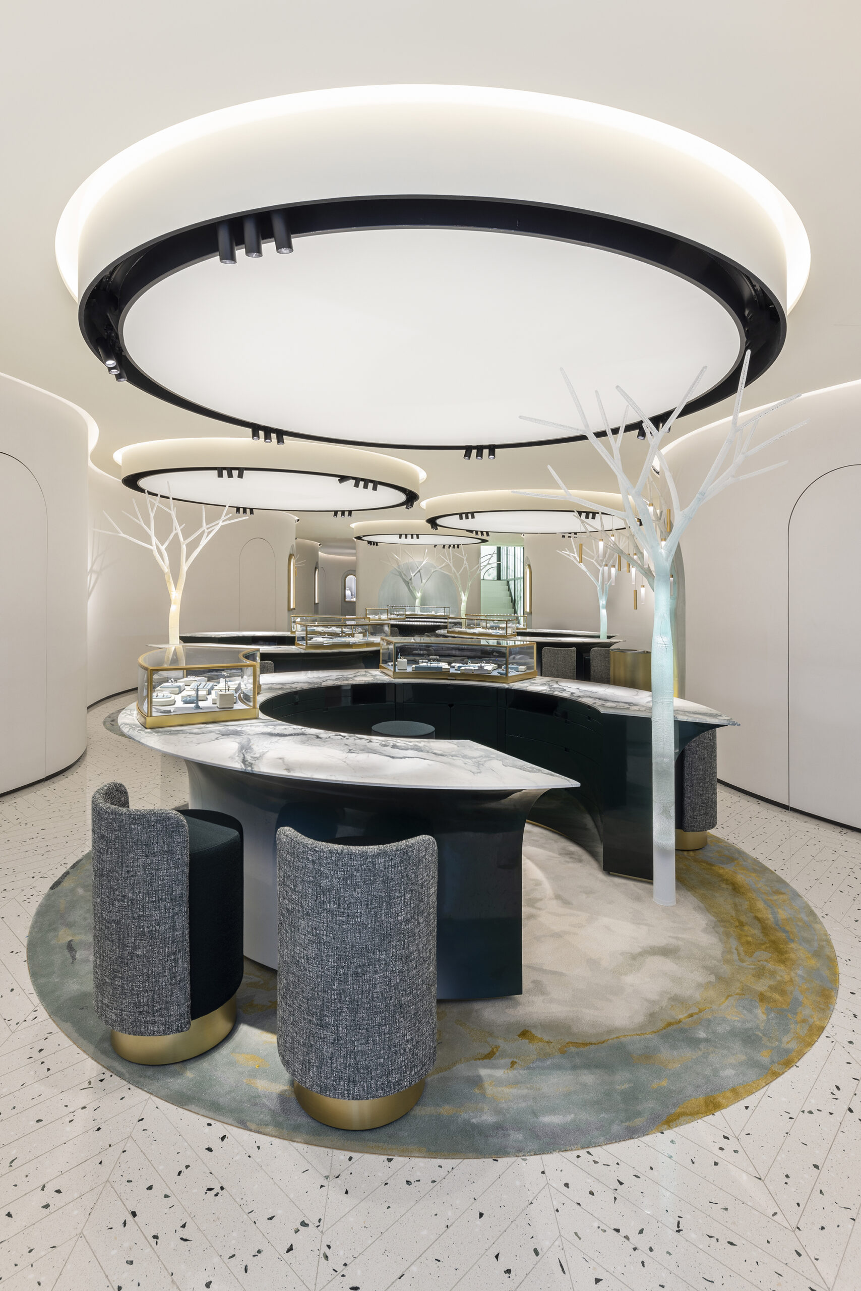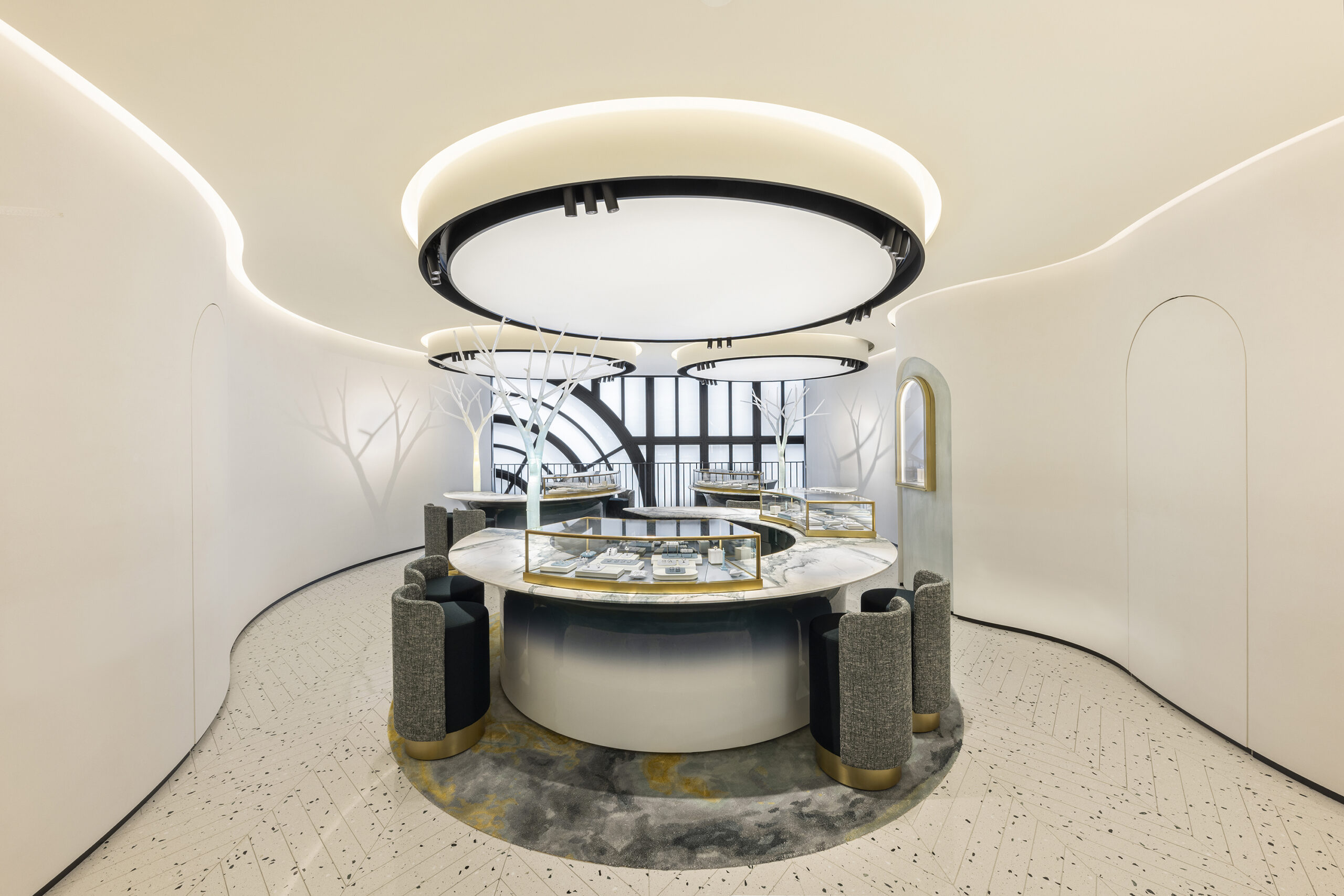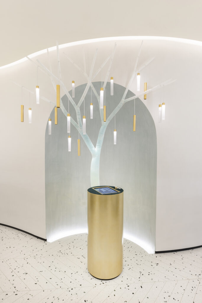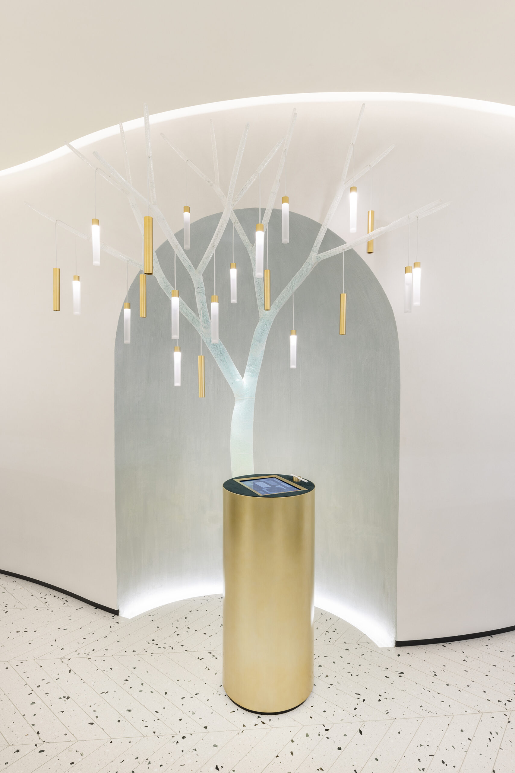 Dès le premier regard sur la façade, le visiteur est saisi par la magie du lieu. La devanture s’inspire des motifs Art nouveau de la verrière du flagship parisien, Place Vendôme. La journée, sa transparence révèle les étages intérieurs. La nuit, elle s’anime tel une forêt numérique grâce à des images de nature générées en temps réel.
