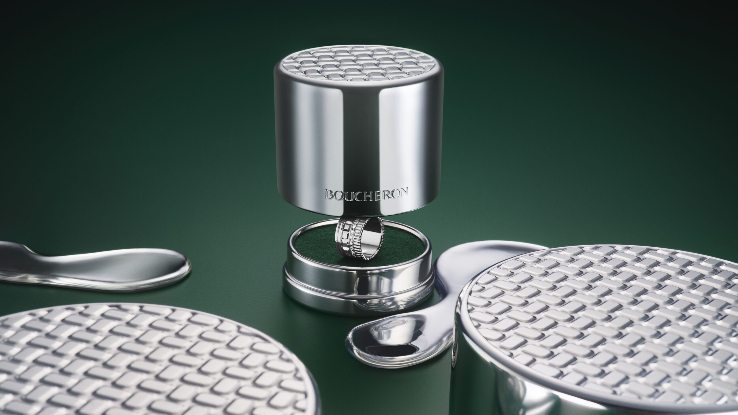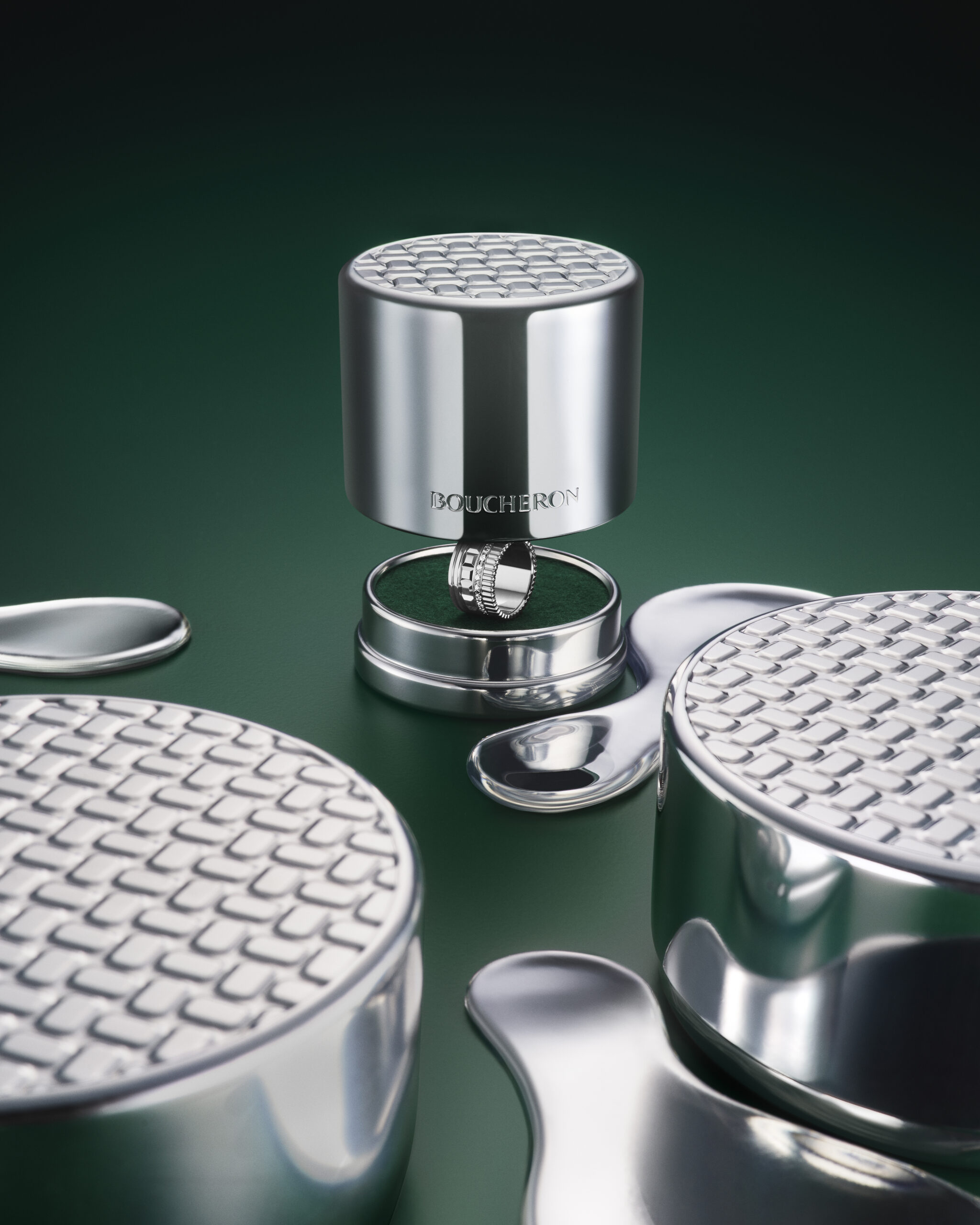 Dans cet écrin végétal, des objets rendent hommage à l’histoire joaillière franco-nippone. Les présentoirs s’inspirent des vitrines de Boucheron aux Expositions universelles où ses créations furent récompensées. Leurs intérieurs arborent des sculptures végétales de l’artiste Miyouki Nakajima, mêlant matières traditionnelles japonaises et savoir-faire français.
