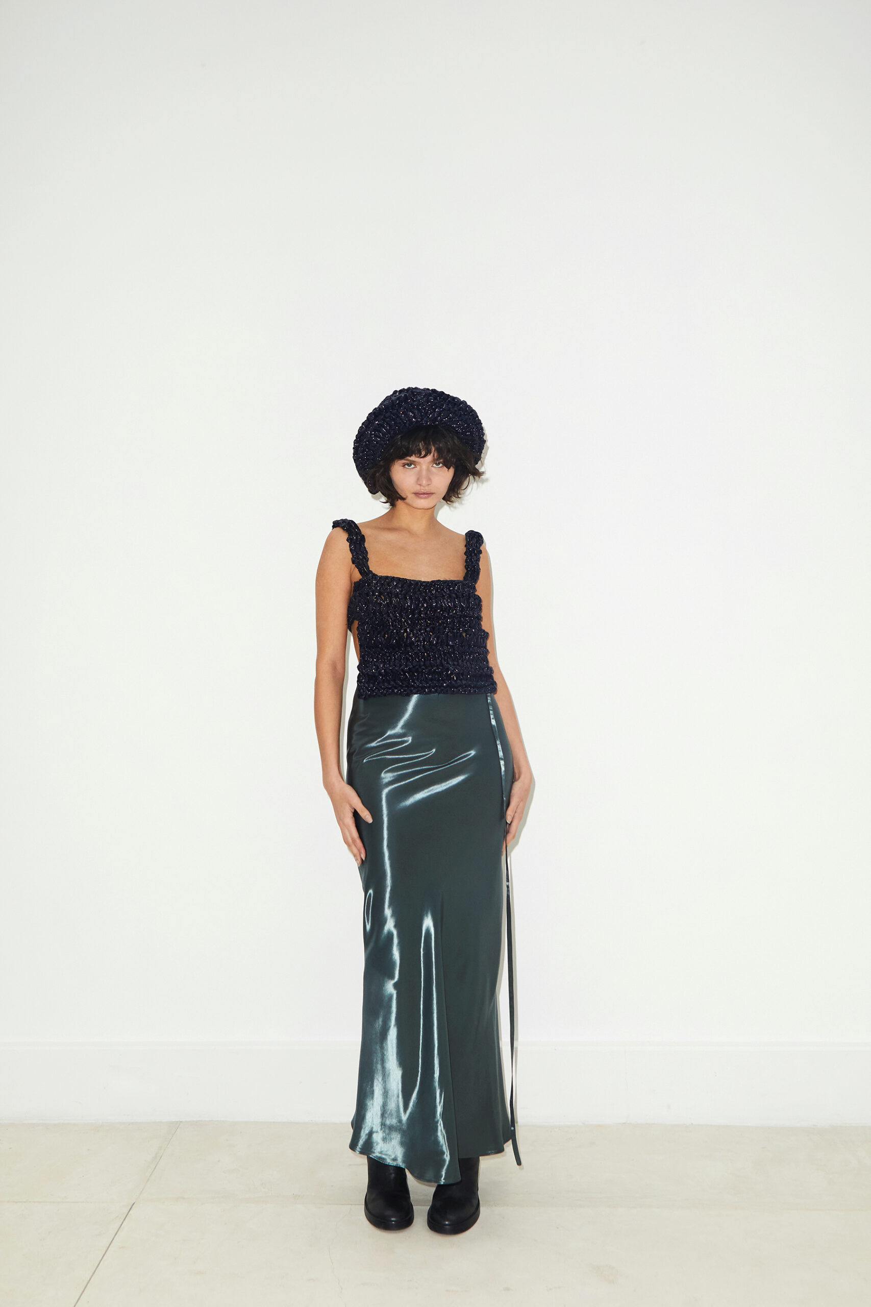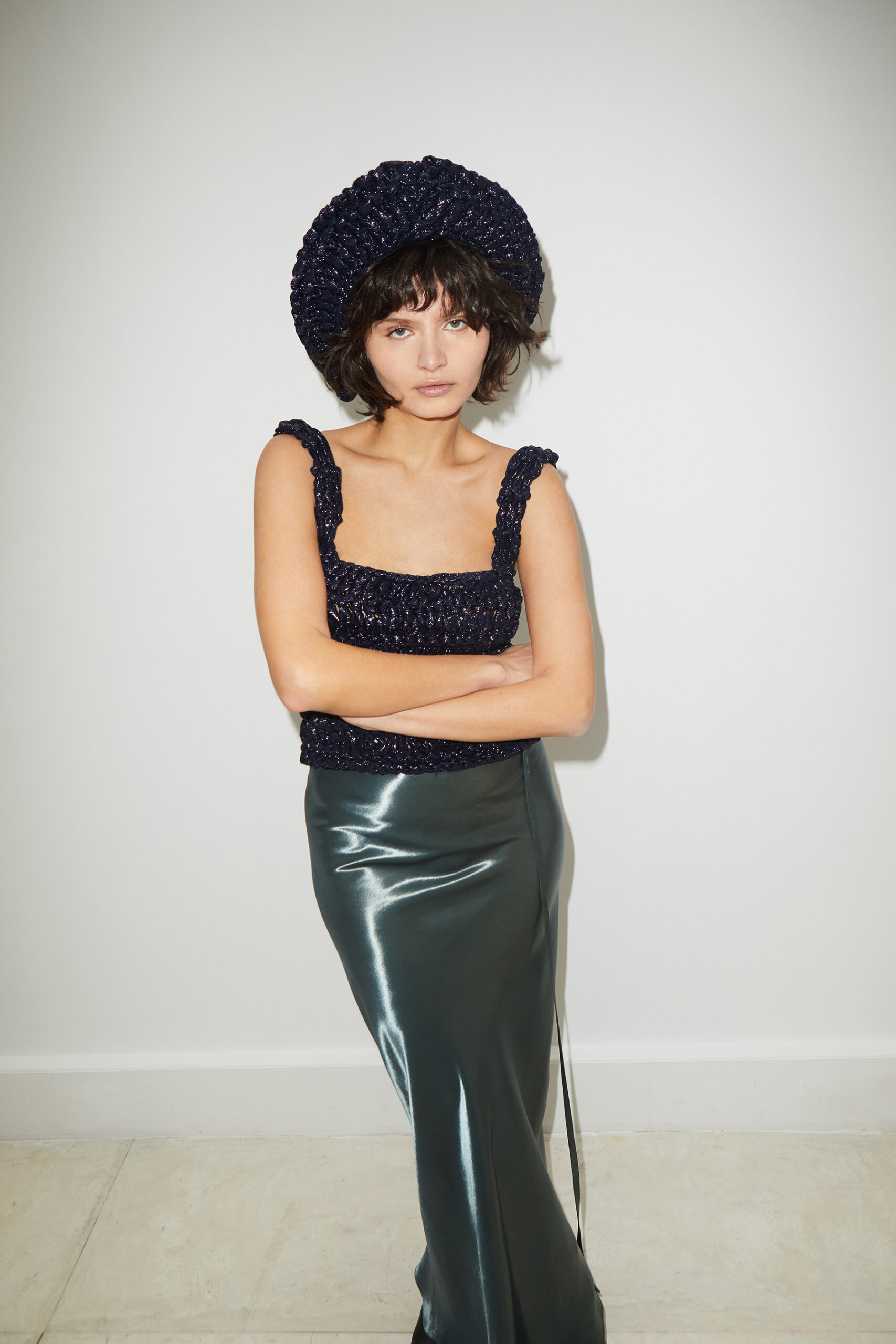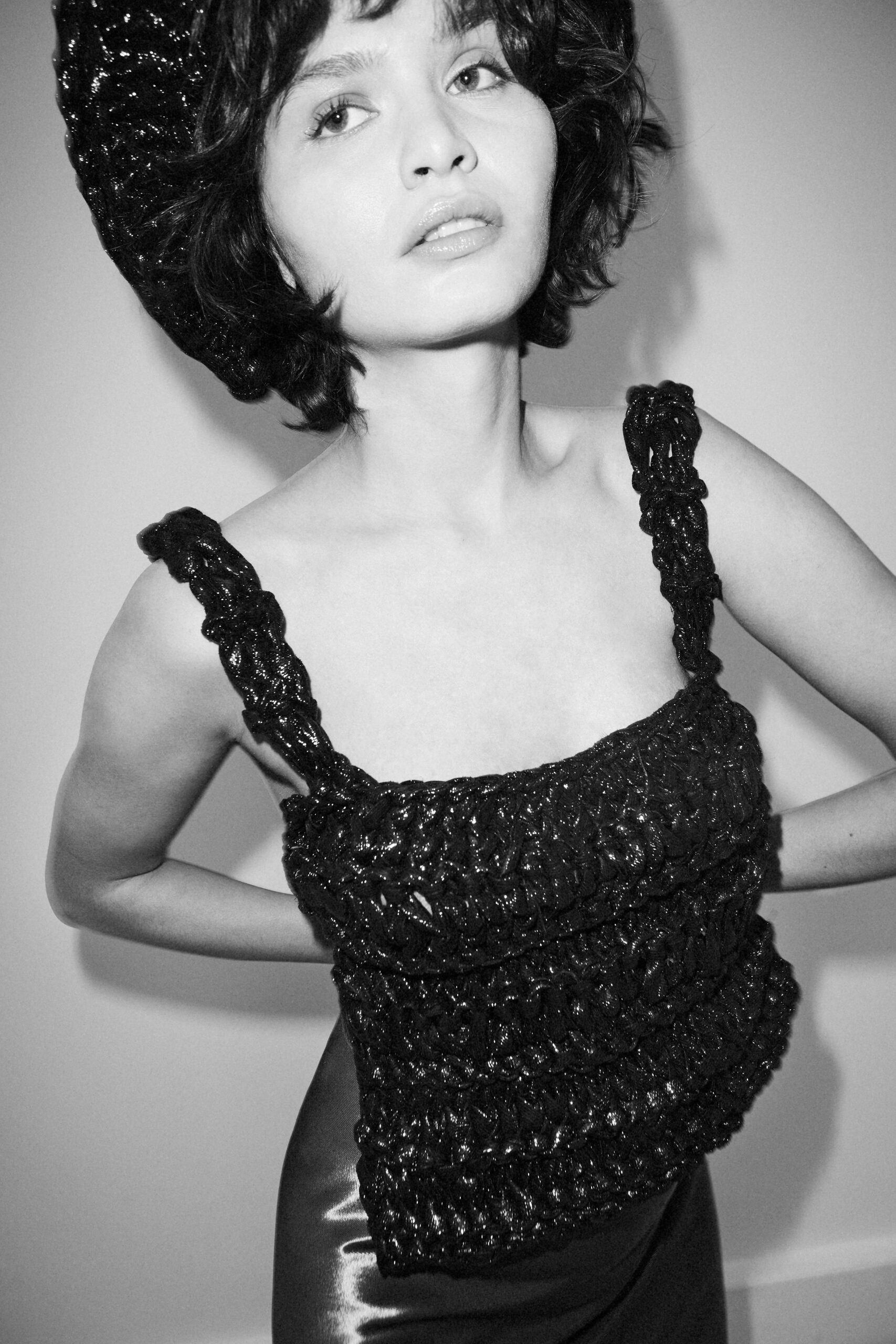 Arbellot, fidèle à son esthétique minimaliste, propose une palette de couleurs sobres qui met en valeur des textures riches et variées, rendant hommage à la fois à la robustesse industrielle et à la délicatesse raffinée. Les matériaux choisis jouent un rôle clé dans cette collection, servant de fondation à la création. On y retrouve du High Leather, de la soie Bucol, du crochet métallique, des tissus lamés et de petits cristaux qui dominent la scène, apportant une dimension tactile et visuelle intrigante.