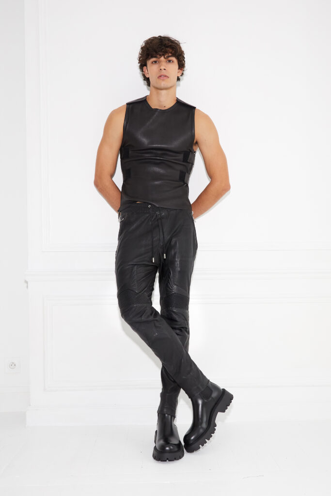 Des vestes modulaires associant textures métalliques et cuir verni sculptent des silhouettes sensuelles. La création phare « Béatrix » se décline en robes bustier noires ou blanches sublimant les corps.
