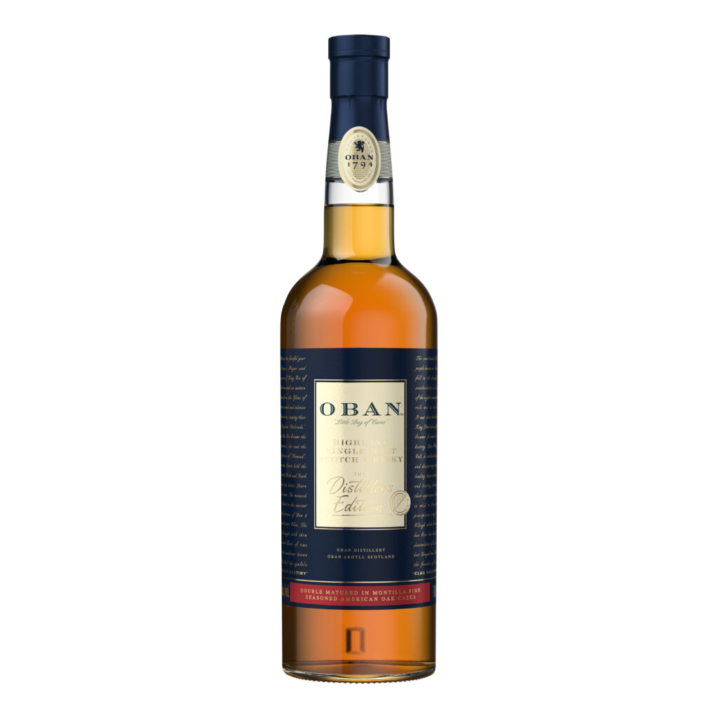 - Oban, à la double maturation en fût de Montilla Fino, s’affiche à 43% de volume d’alcool et 85€.