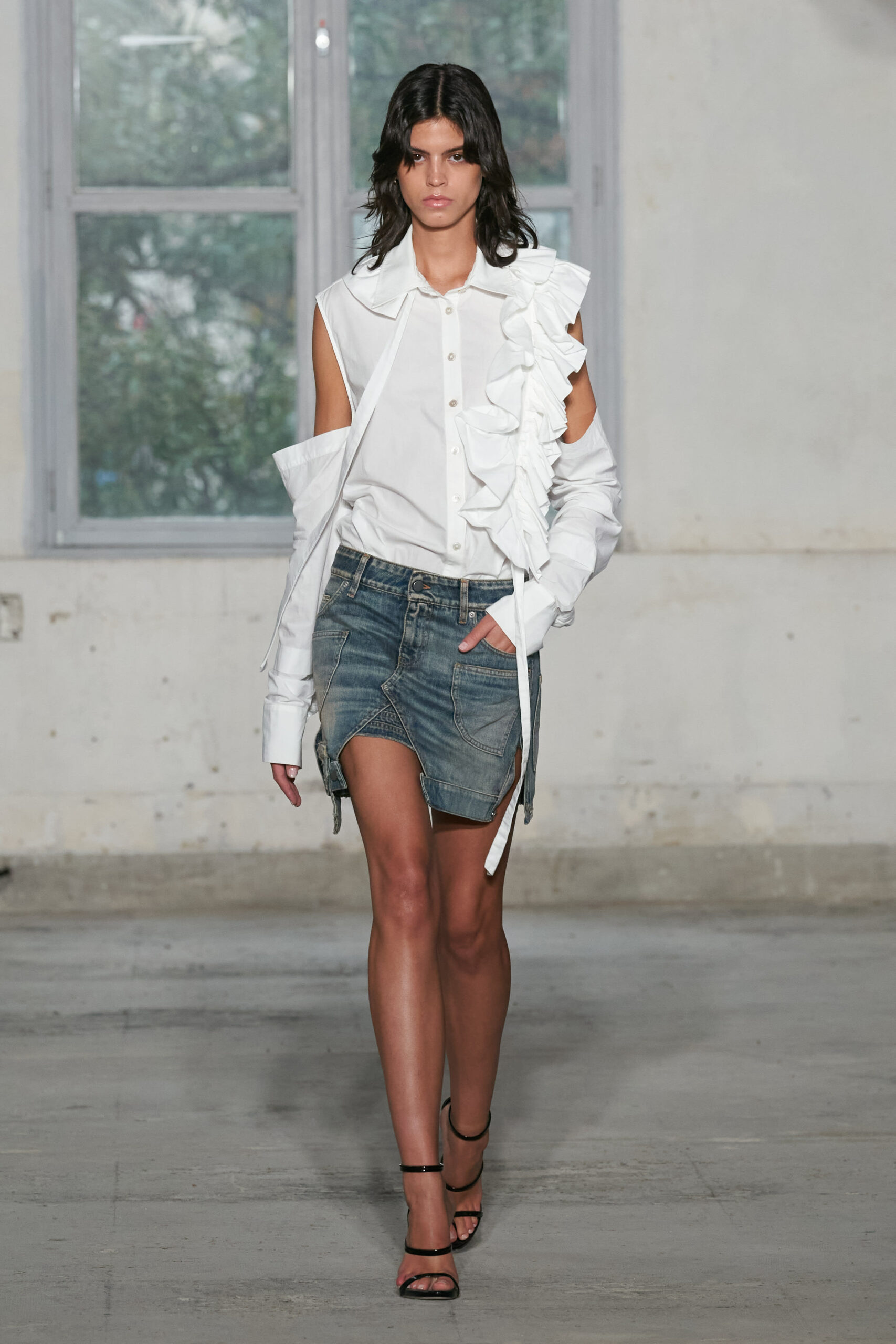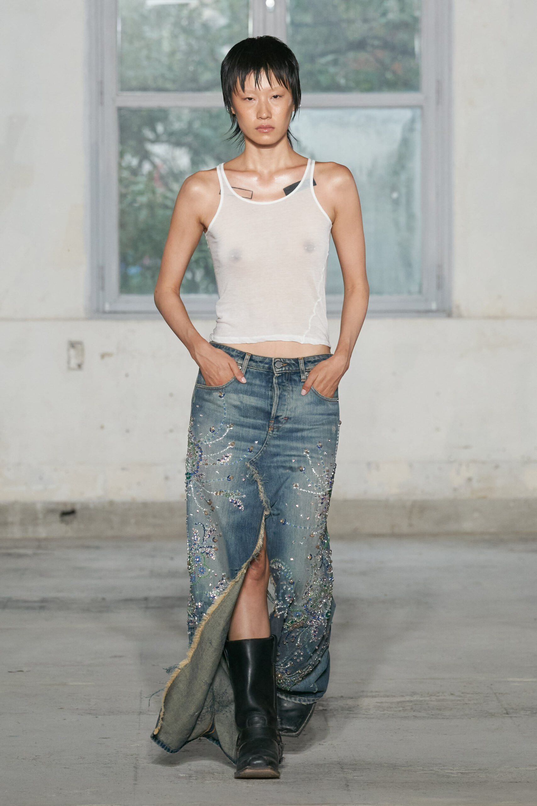 - Un total look jean, avec une jupe midi et un bermuda brodés de fils dorés dans les moindres détails : la preuve que l’artisanat traditionnel peut se marier avec une esthétique urbaine.