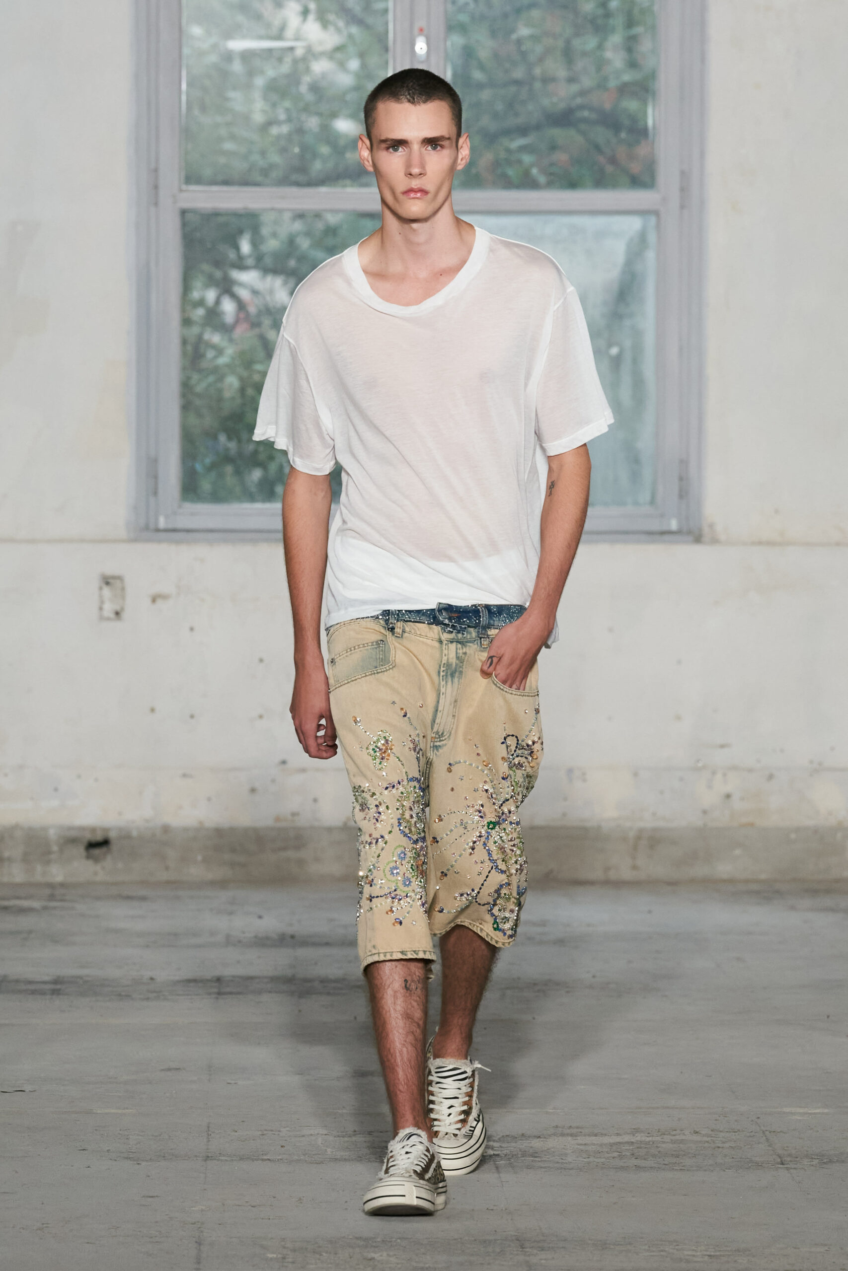 Même les basiques sont sophistiqués, avec des tee-shirts et débardeurs à la coupe épurée sublimant la silhouette. Le jeu des transparences dévoile avec subtilité le galbe du corps. Sportifs mais élégants, les volumes amples contrastent avec des détails précis, comme ces collections de jeans brodées de fils dorés jusqu’en Inde.