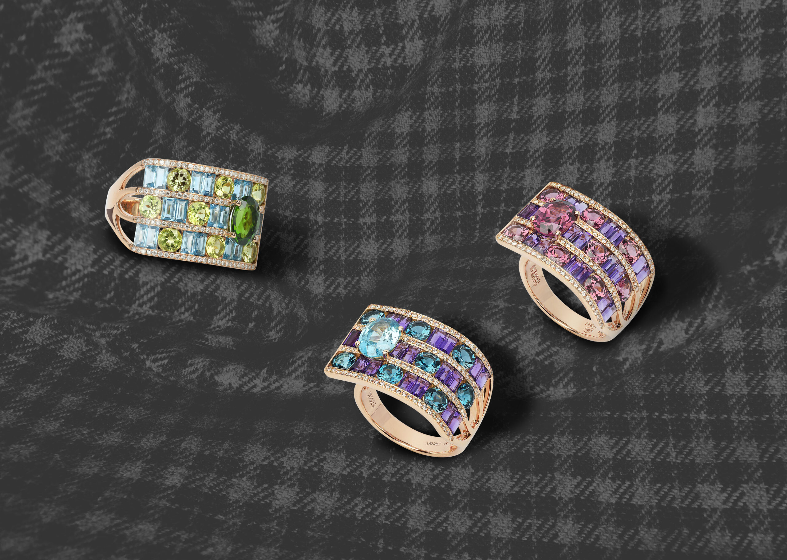 Le choix des pierres précieuses dans cette collection révèle une considération approfondie des contrastes et des harmonies. Par exemple, une bague en or rose 750/1000e peut être composée d’une tanzanite de centre, encadrée par des améthystes, des topazes bleues London et des diamants. Le prix de ces bagues, telle la référence R1929 avec tanzanite, est conseillé à 7 650 €. Chaque création est une interprétation unique de l’éclat et de la couleur, alignée avec une géométrie variable qui rompt avec les designs conventionnels.