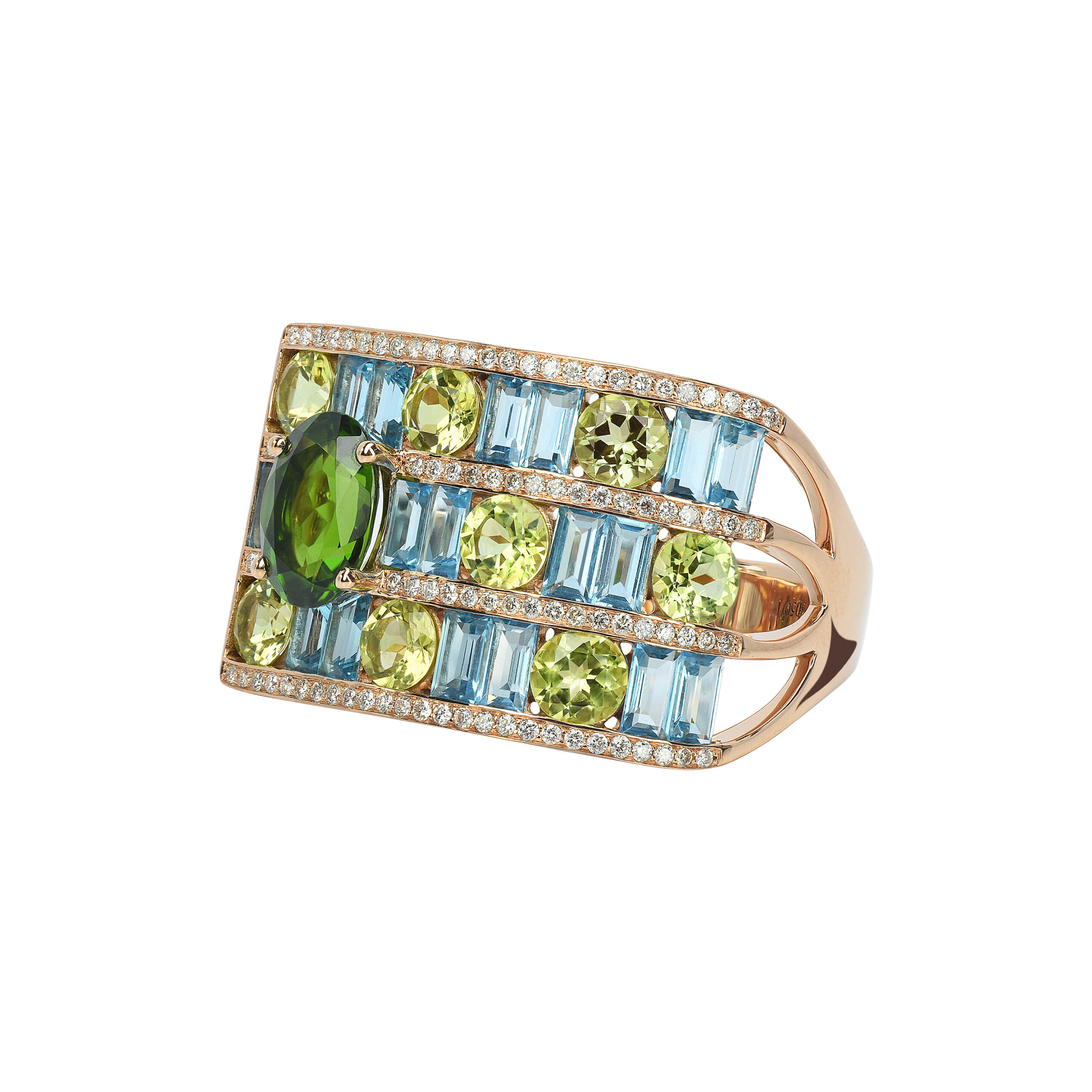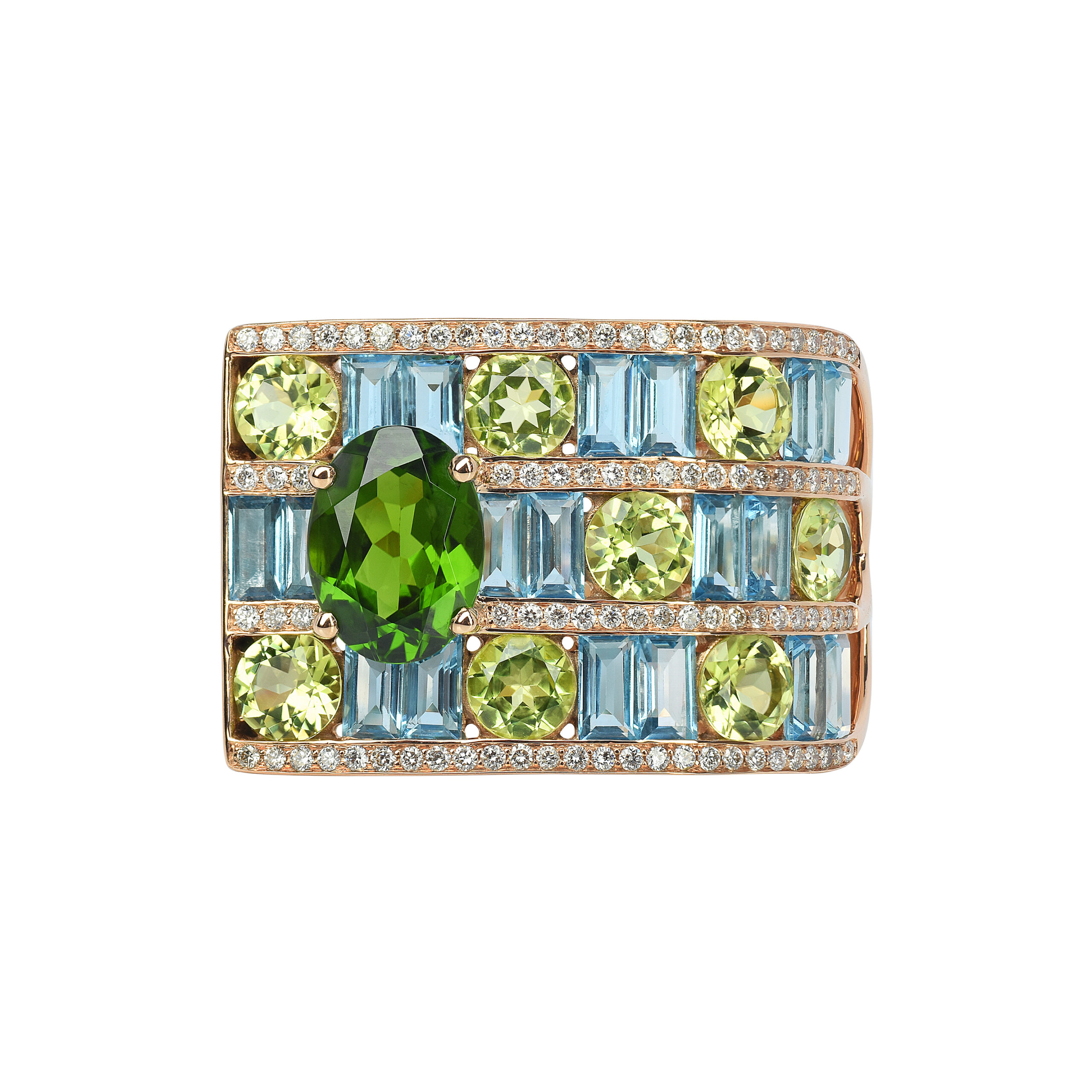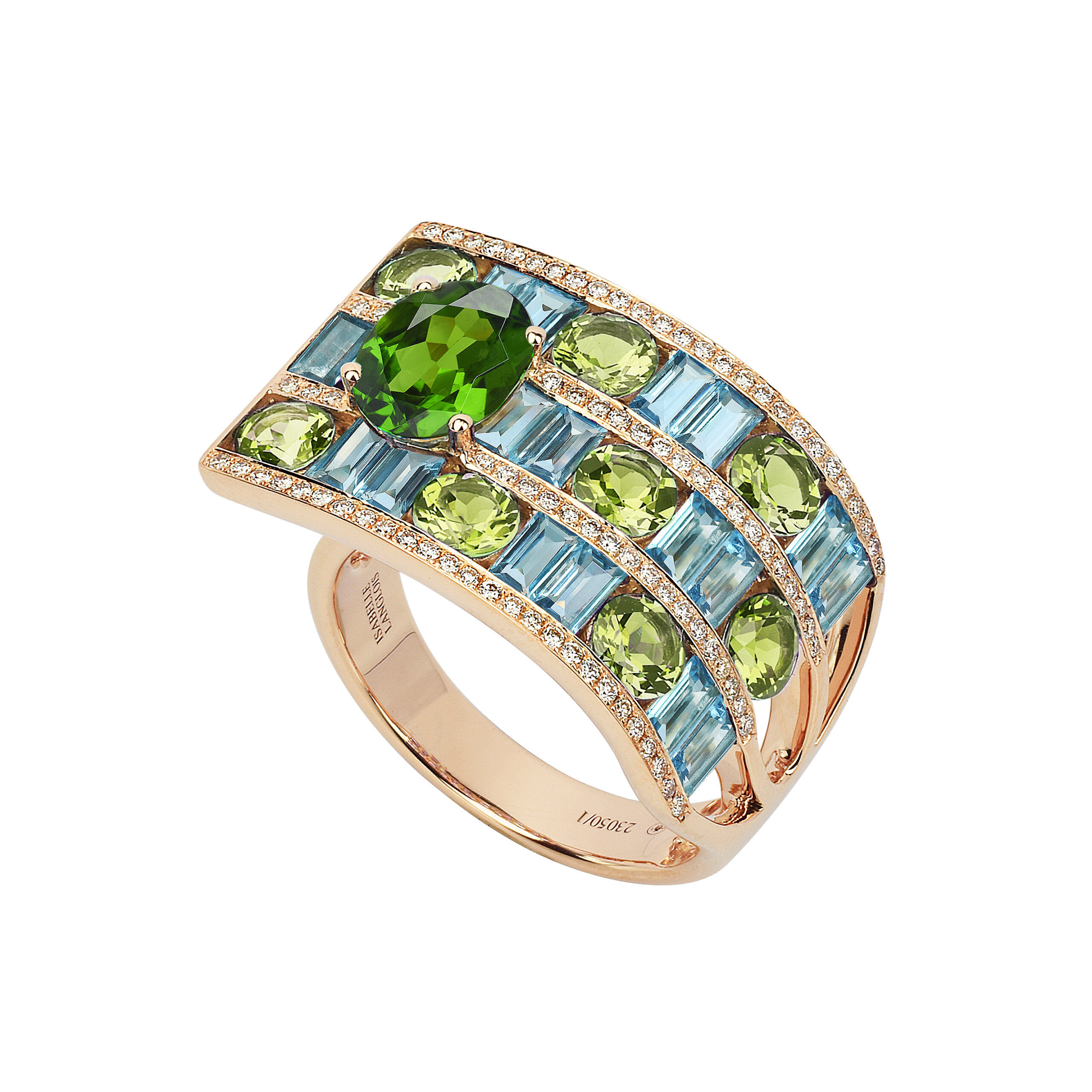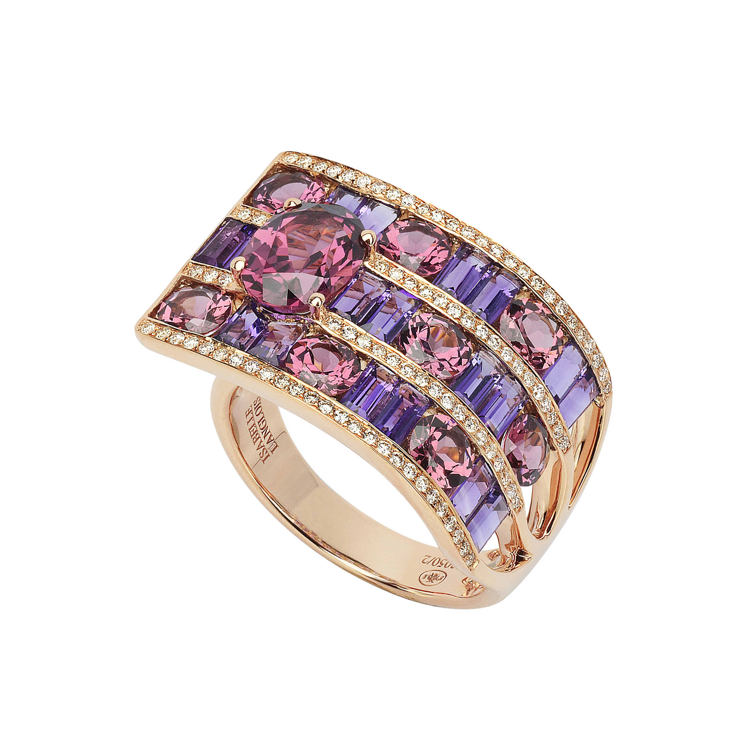 Le savoir-faire d’Isabelle Langlois se manifeste également dans l’attention aux détails. Les pierres de couleur sont bordées de fines lignes de diamants, ajoutant une lueur supplémentaire à leur éclat intrinsèque. Une pierre facettée de taille ovale sert de point d’orgue à ce festival de couleur et de lumière.