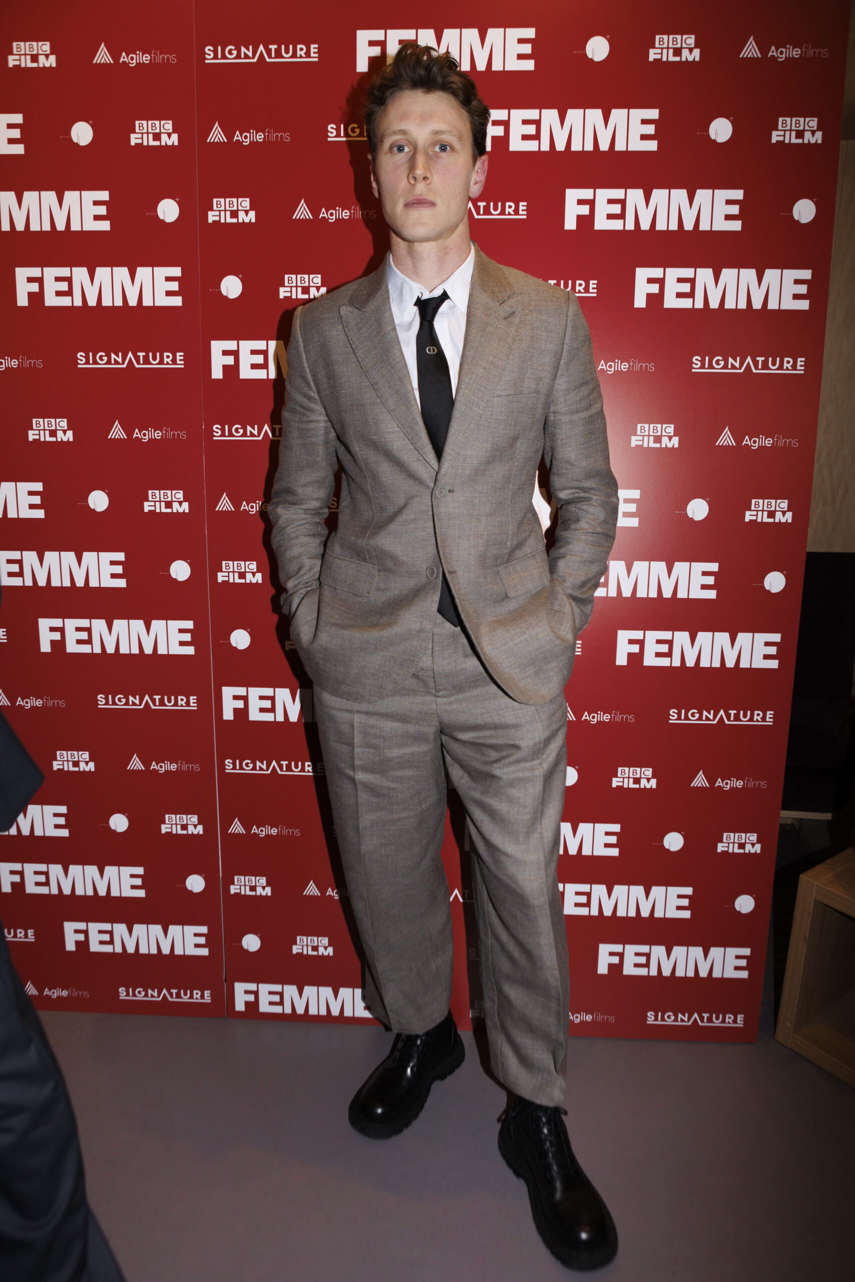 GEORGE MACKAY WORE A DIOR MEN’S COLLECTION BROWN WOOL PEAK LAPEL SUIT, A CLASSIC WHITE COTTON SHIRT, A BLACK SILK CD EMBROIDERED TIE AND BLACK LEATHER LACE-UP ANKLE BOOTS.