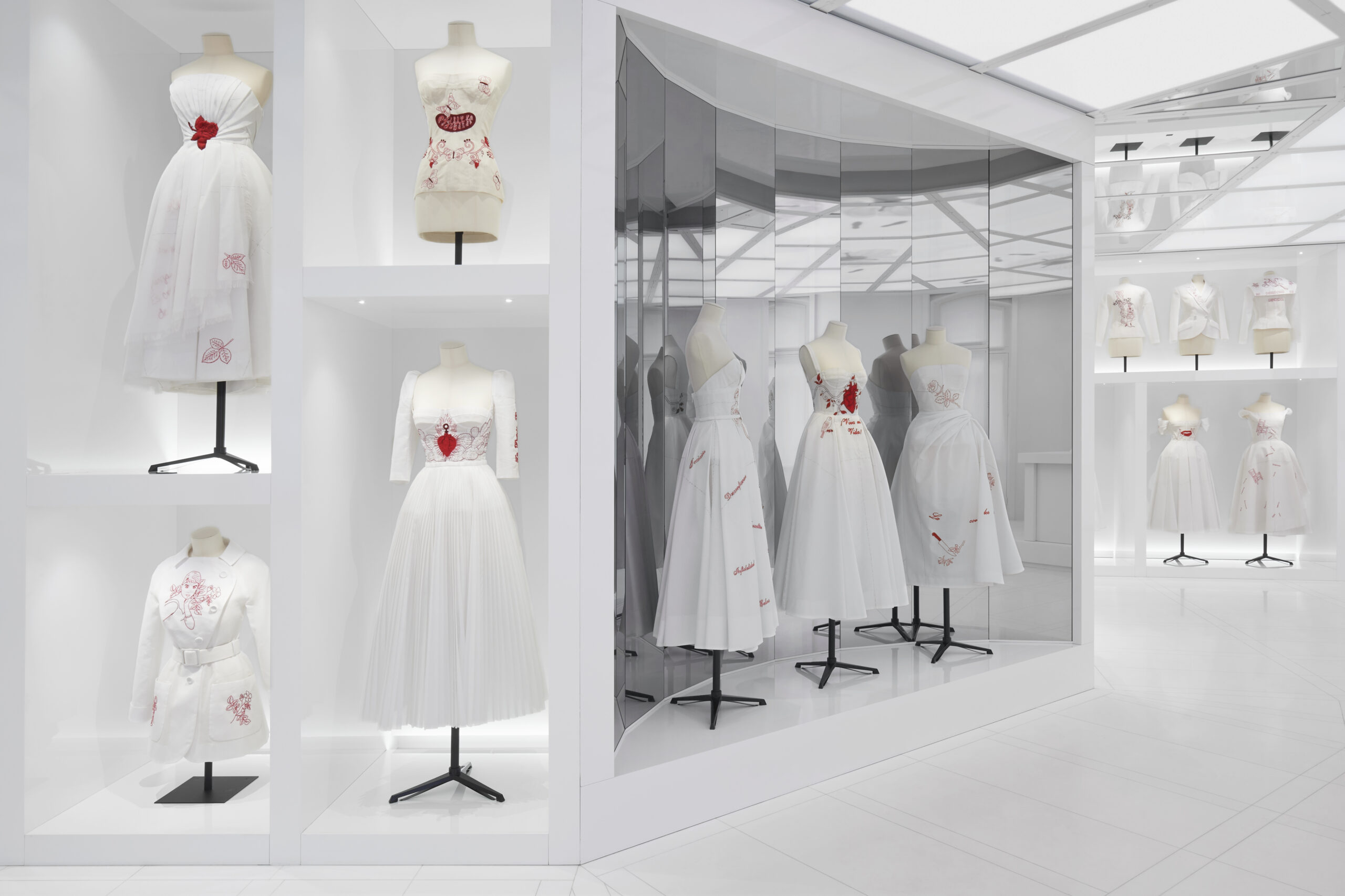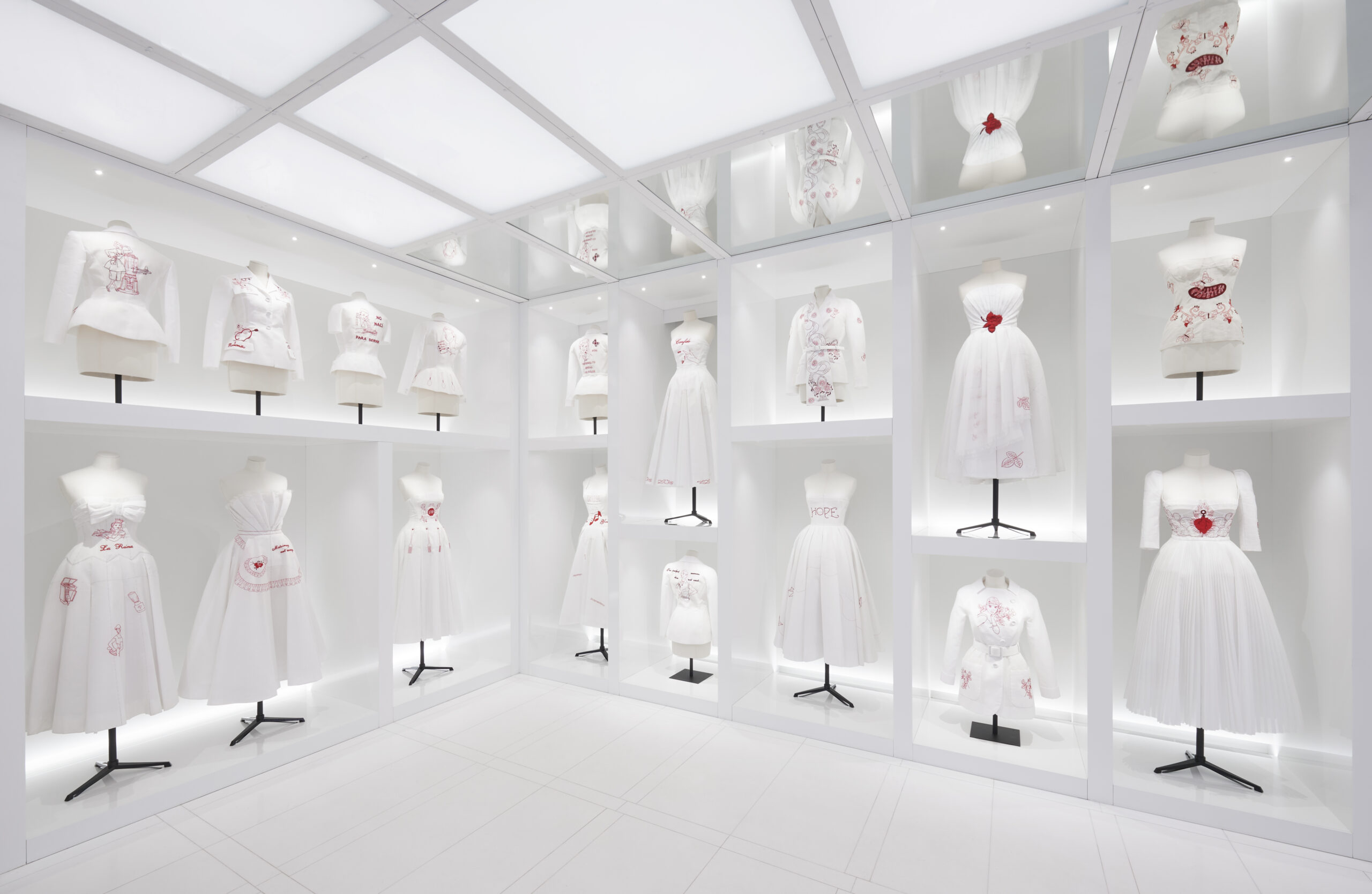 Aujourd’hui, Maria Grazia Chiuri poursuit ce dialogue en collaborant avec plusieurs figures féminines, dont les œuvres sont exposées. Successivement, les univers singuliers de Lillian Bassman, Elina Chauvet, Judy Chicago, Maya Goded, Constance Guisset et d’autres se dévoilent, offrant un voyage poétique dans l’histoire de la maison.