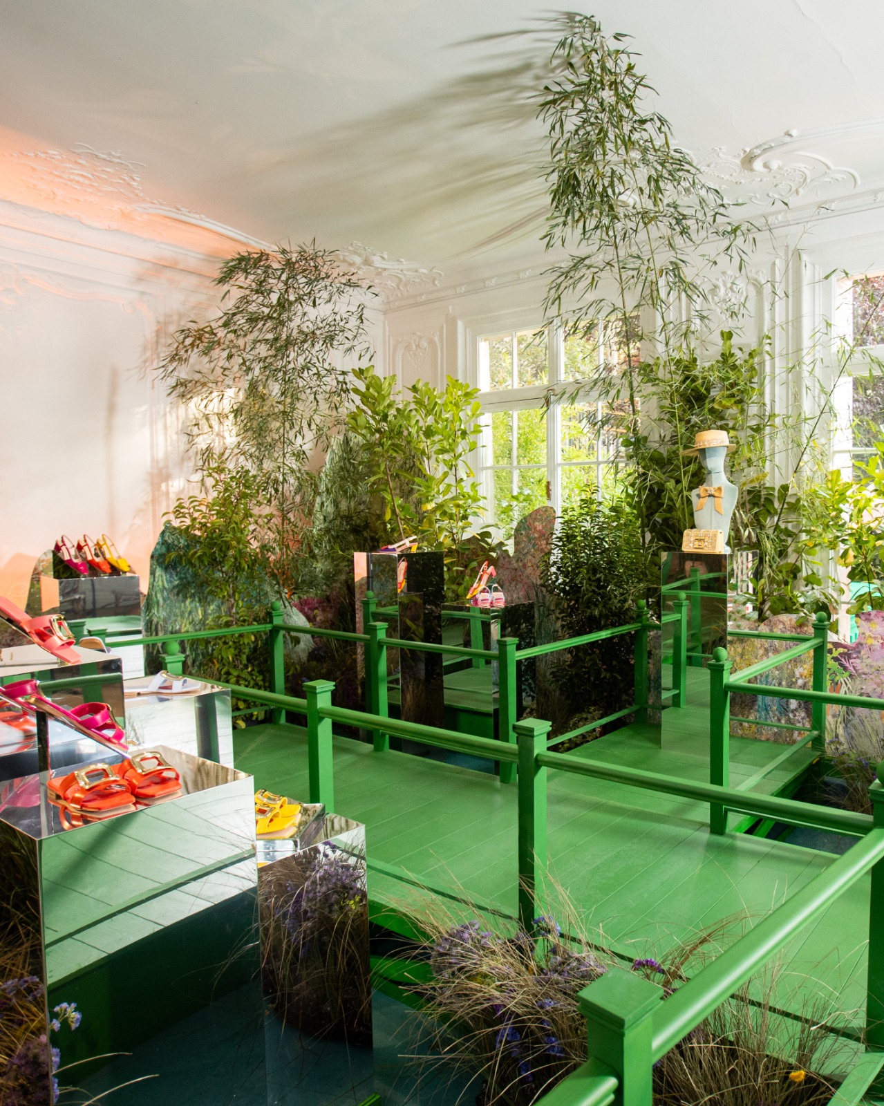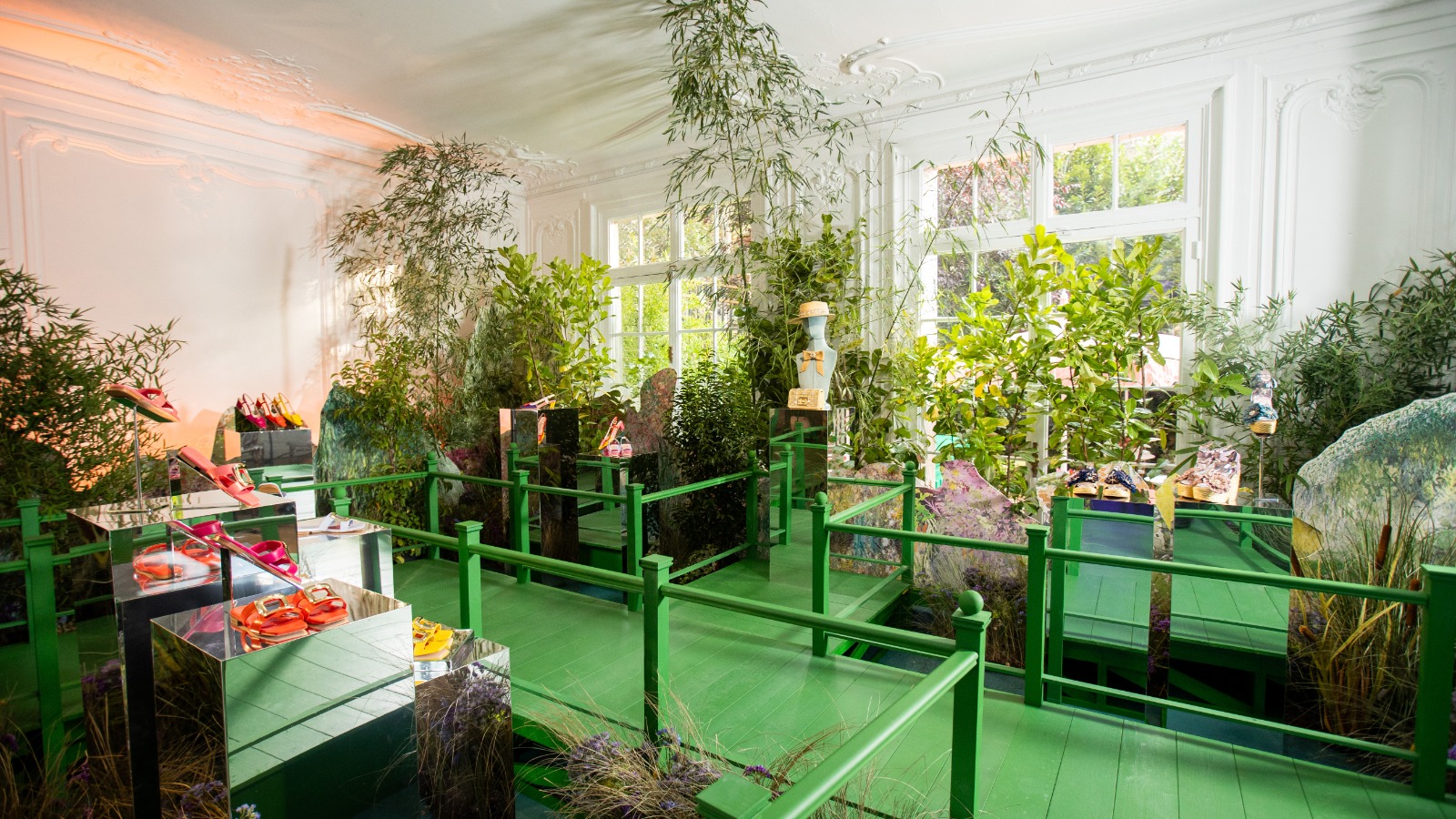 La découverte débute au rez-de-chaussée, dans un monde naturel baptisé « THE CRAFT OF COLOUR ». Ce décor est un hommage aux jardins de Claude Monet à Giverny, dans lequel des nuances printanières de couleurs sont mises à l’honneur. Parmi les créations dévoilées, on trouve le sac à épaule Viv’ Choc, aux couleurs vives de bleu, de jaune et de rose, suspendu au-dessus d’étangs de nénuphars. Les créations de cette collection printanière font écho aux œuvres d’art de Monet, en proposant des pièces artisanales aux nuances d’aquarelle, sur une toile de cuir.