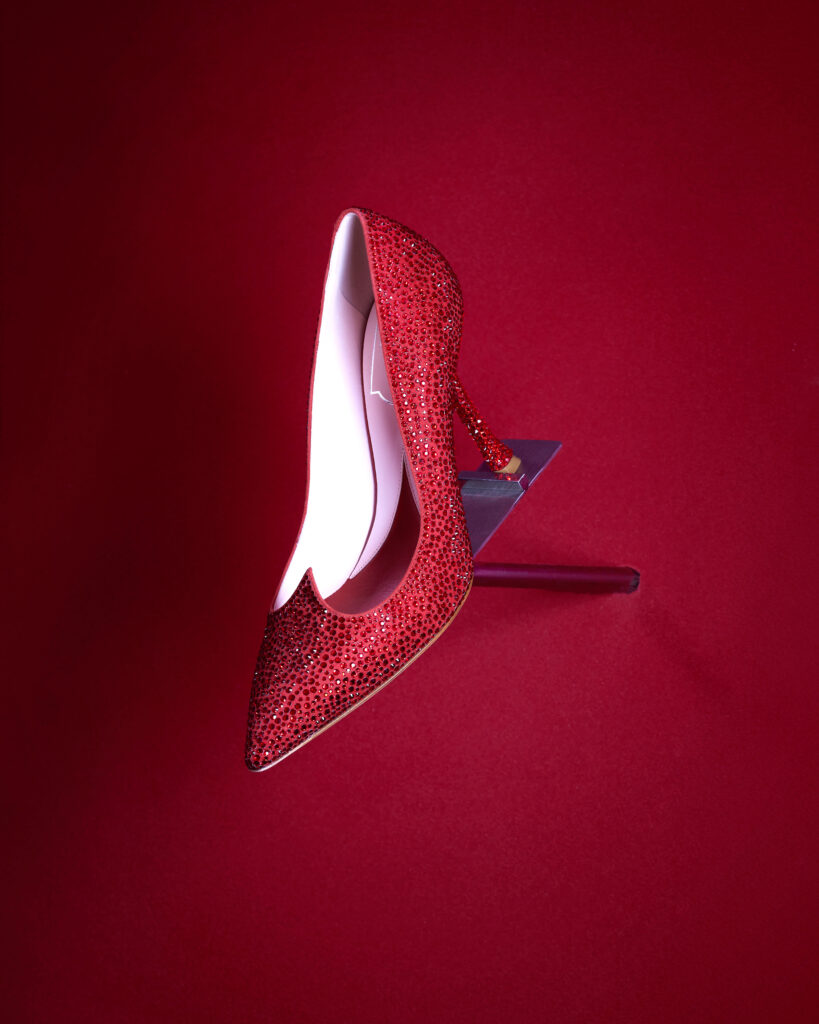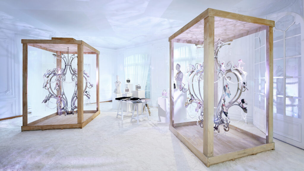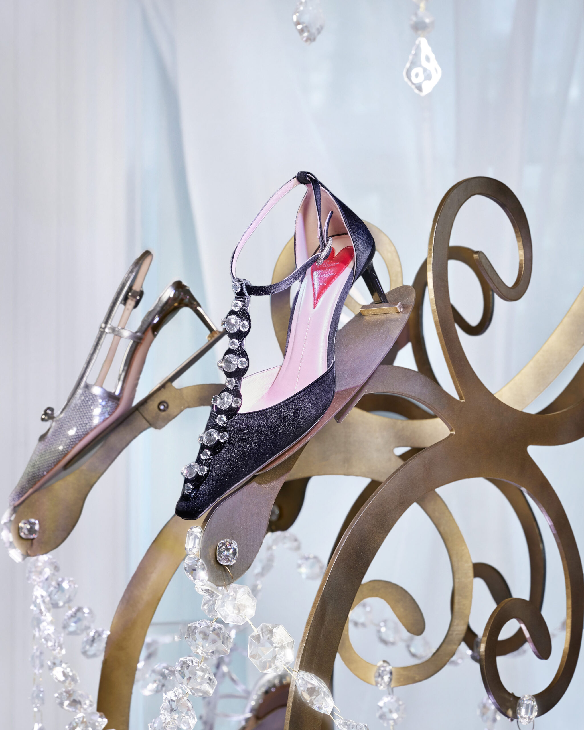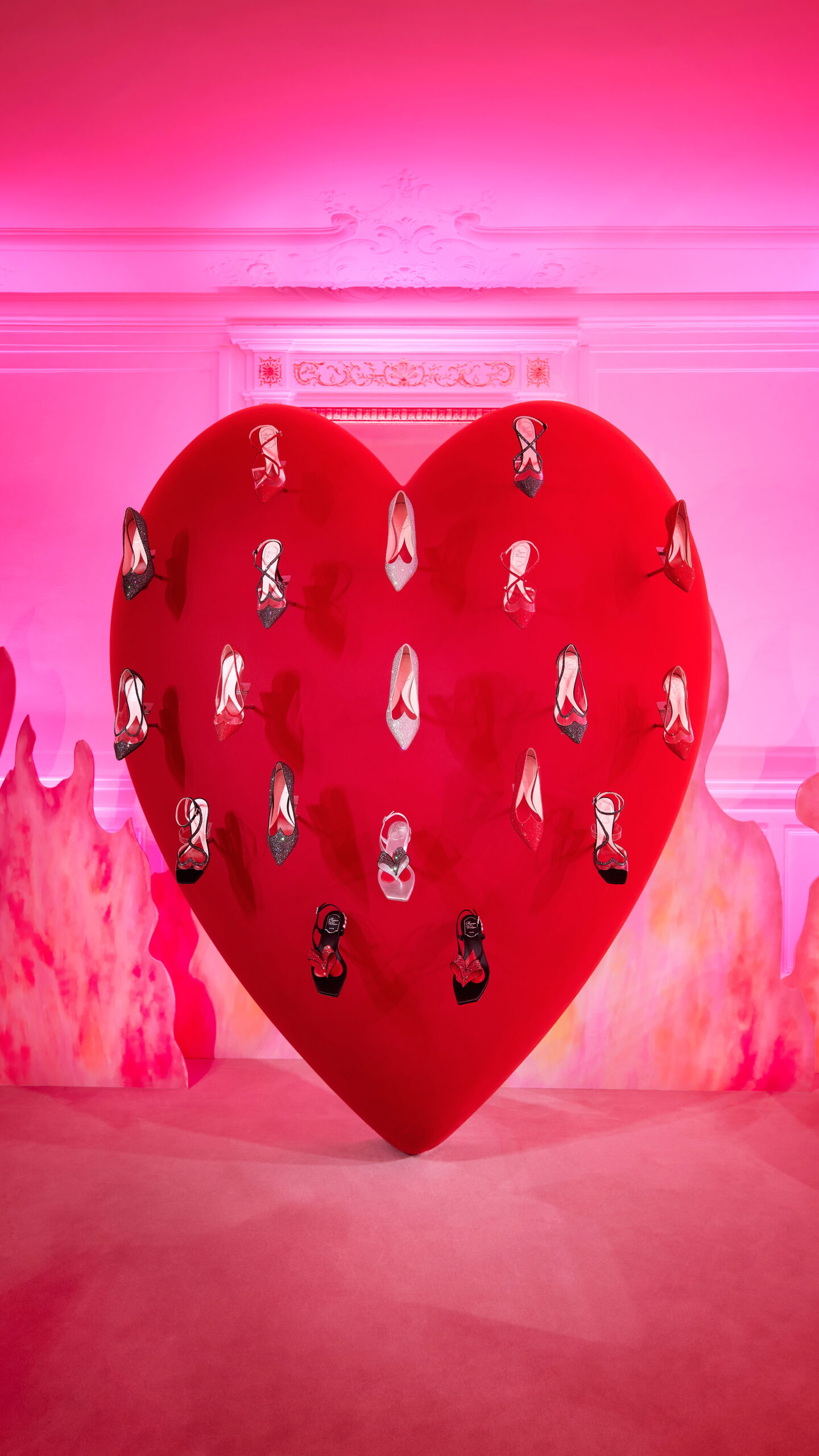 Dans le registre de la passion et de l’amour, l’étage supérieur se dévoile en nuances de rouge et de rose. Le soulier « I Love Vivier » y est revisité en une construction de cuir ajouré, agrémenté d’une bride arrière et d’un talon aiguille. Des sandales et des escarpins, couverts de strass écarlates, incarnent l’éclat et le romantisme de cet espace dédié à l’amour.