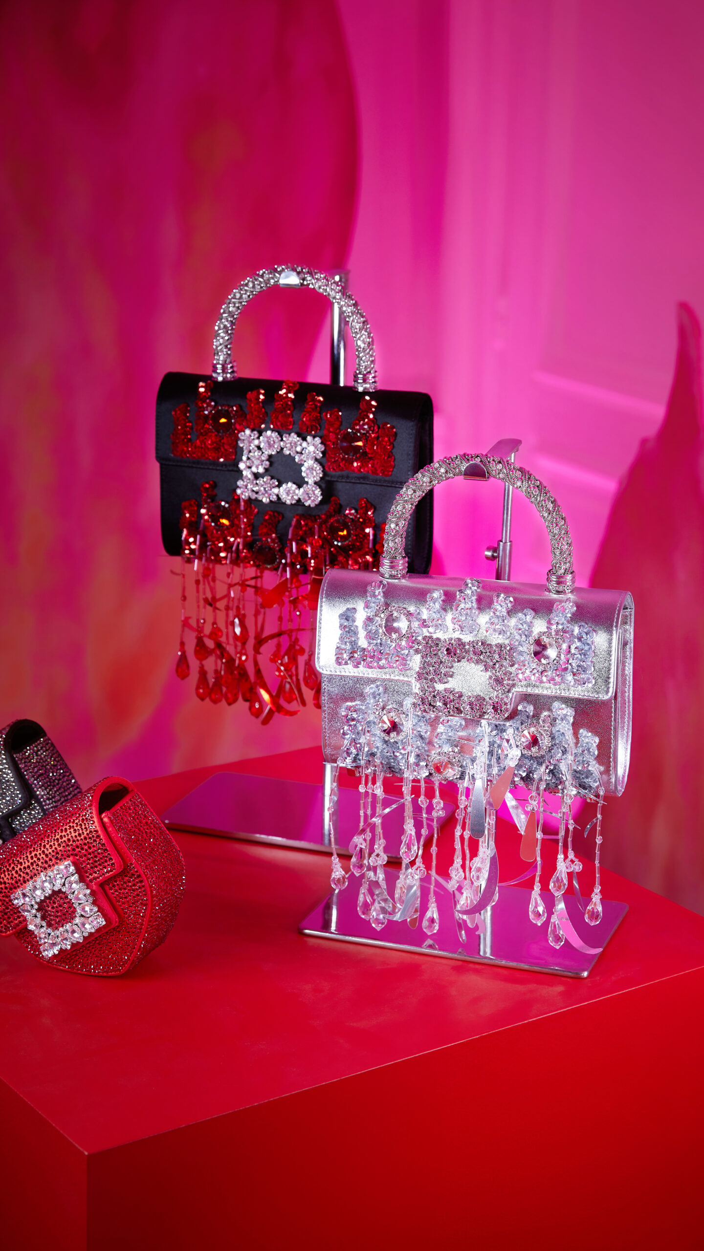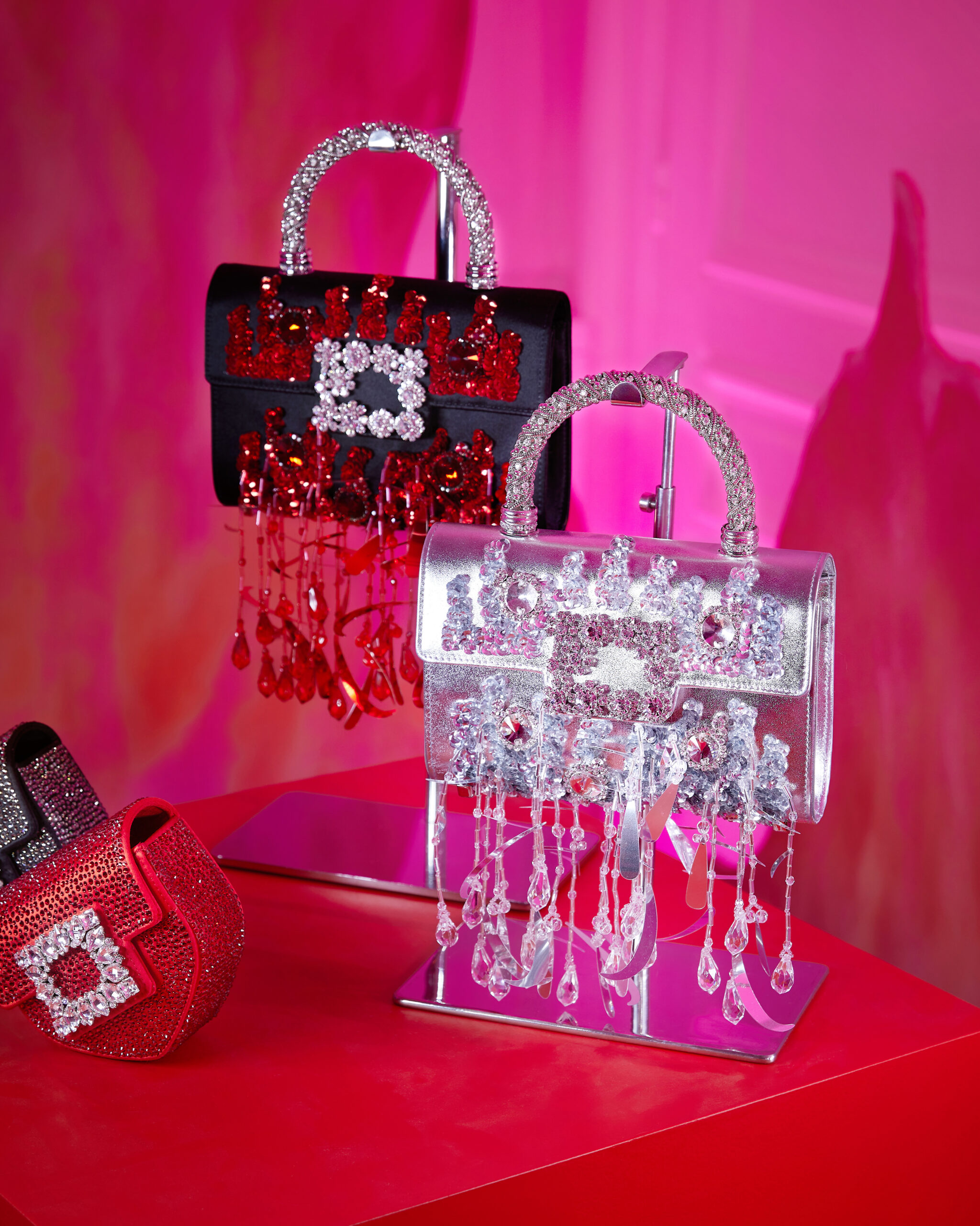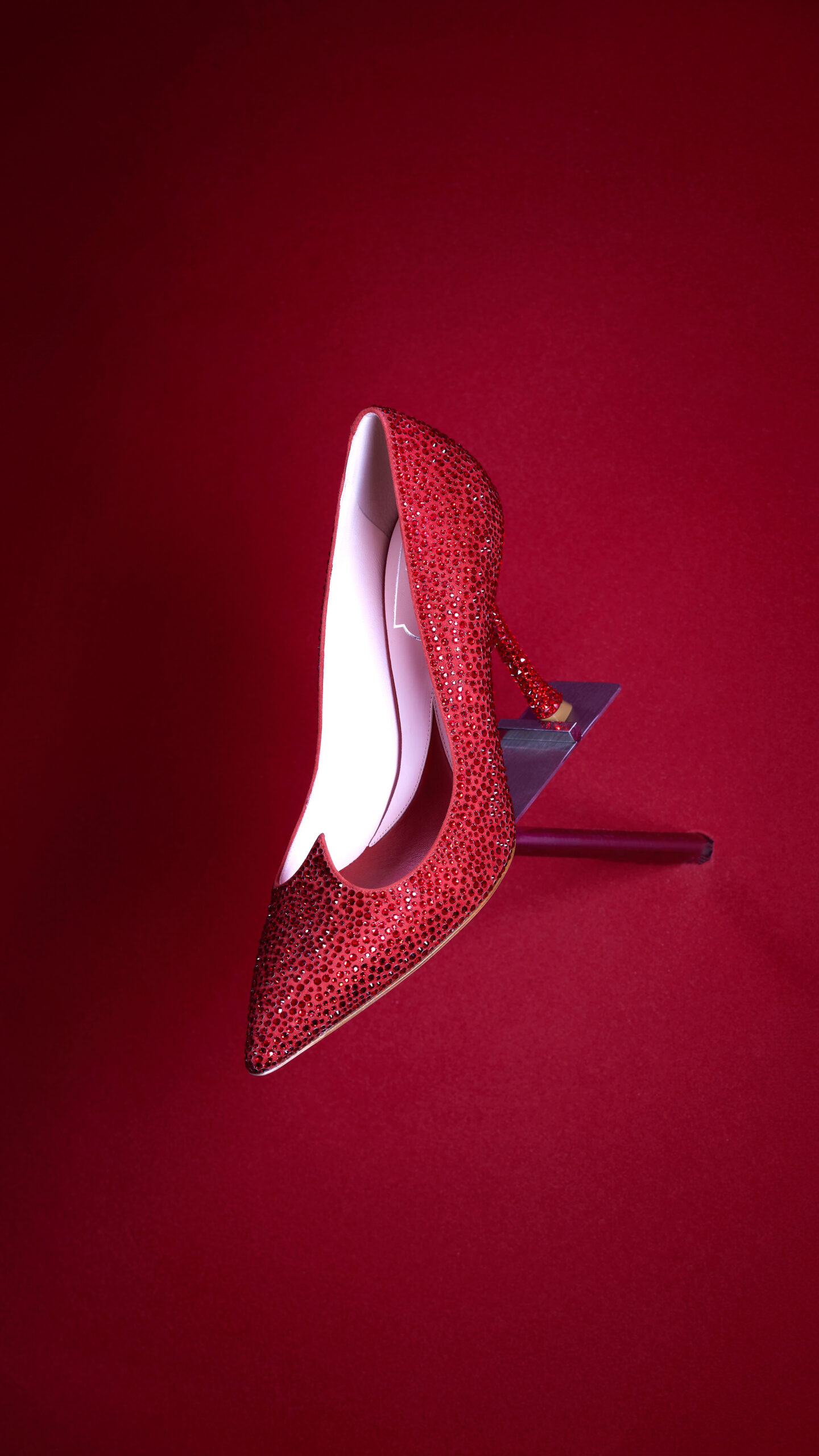 Dans le registre de la passion et de l’amour, l’étage supérieur se dévoile en nuances de rouge et de rose. Le soulier « I Love Vivier » y est revisité en une construction de cuir ajouré, agrémenté d’une bride arrière et d’un talon aiguille. Des sandales et des escarpins, couverts de strass écarlates, incarnent l’éclat et le romantisme de cet espace dédié à l’amour.