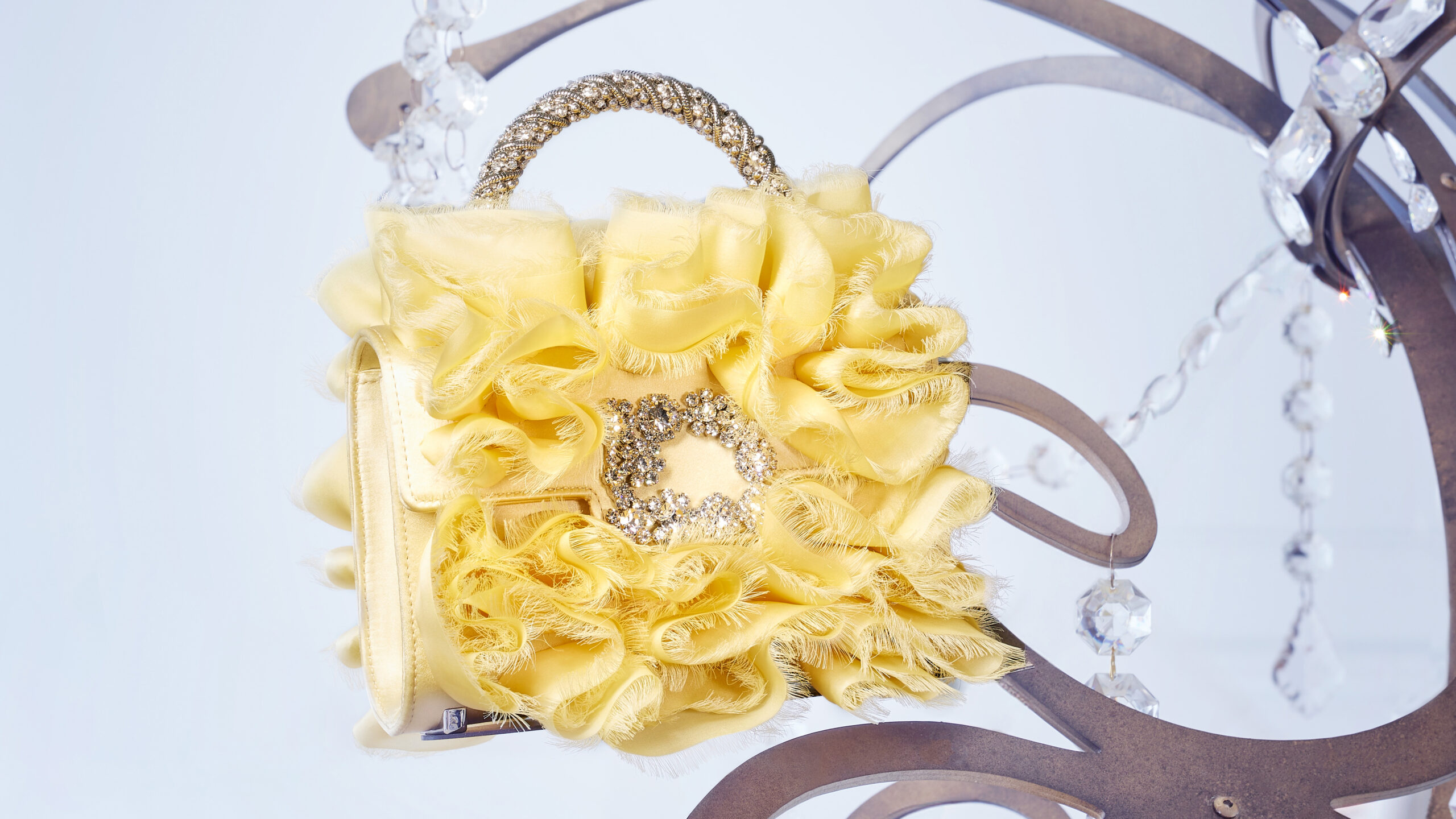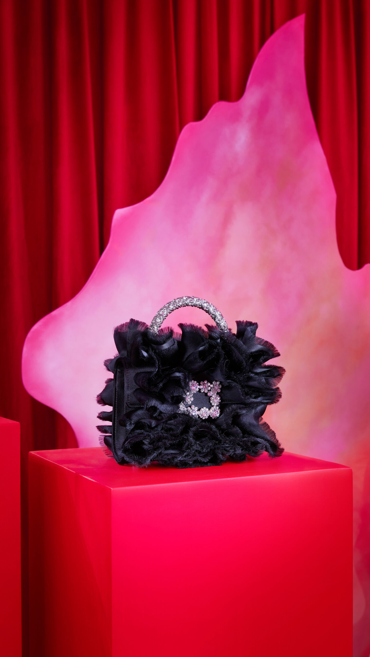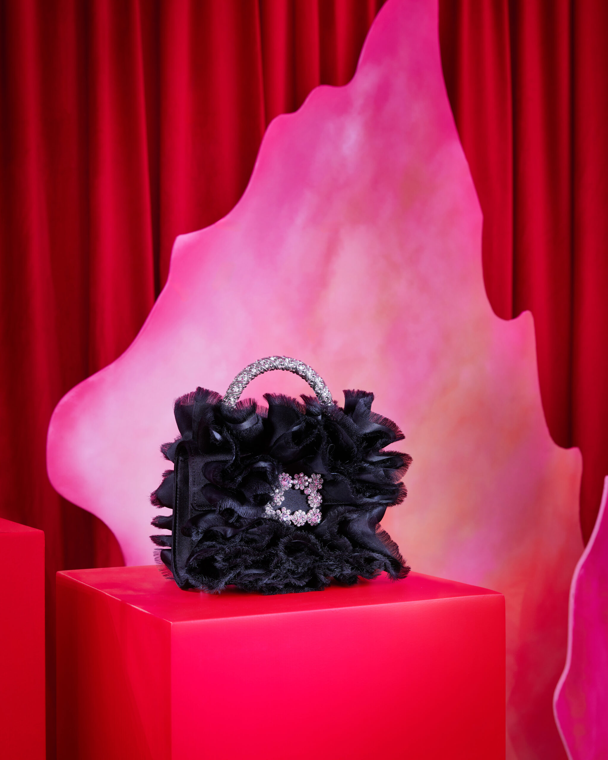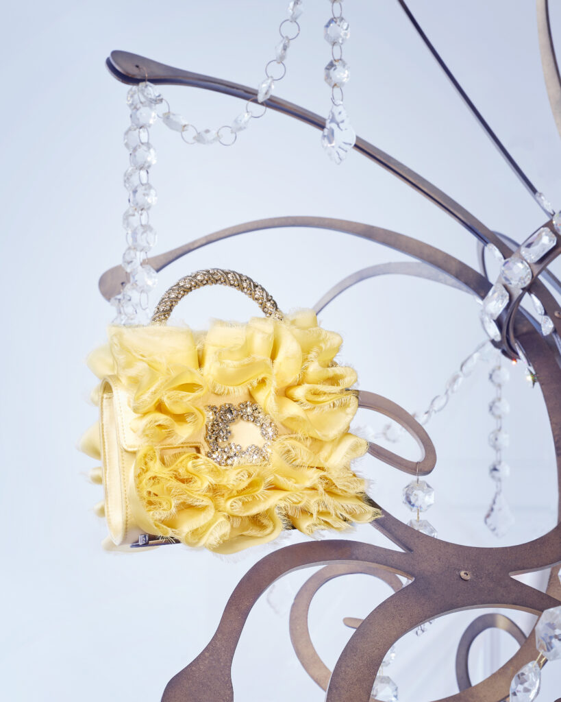 Le quatrième et dernier étage, sous le thème « AN AIR OF PRECIOUSNESS », propose un décor où la préciosité du luxe est magnifiée. Des sacs du soir en velours panné ou en organza à volants, incrustés de fleurs scintillantes, y sont présentés au milieu d’un tableau vivant de rideaux et de feuilles, évoquant la fin d’une tempête parfaite. Les bijoux de Roger Vivier, inspirés de la collection personnelle de Gherardo, apportent une note finale d’élégance et de raffinement.