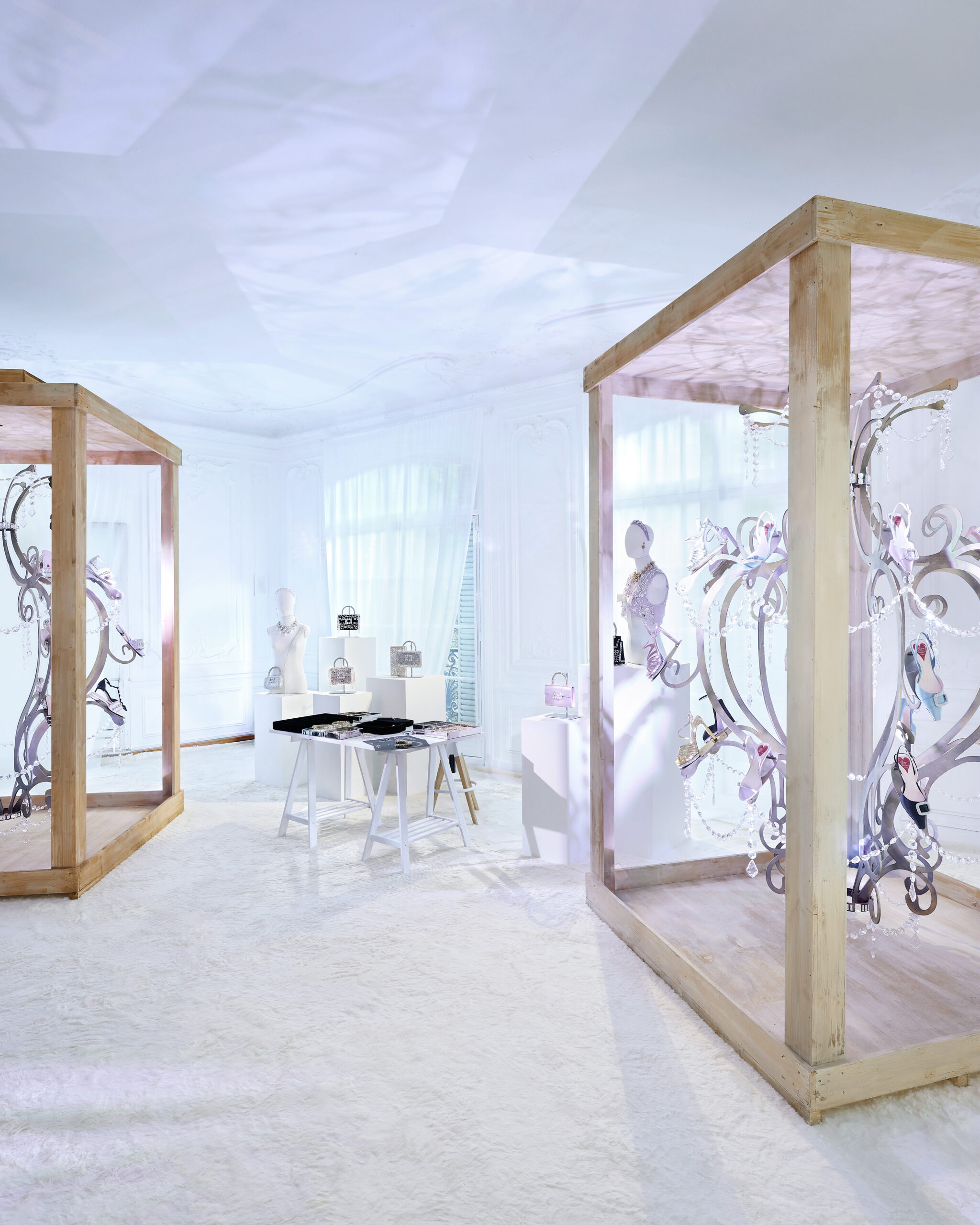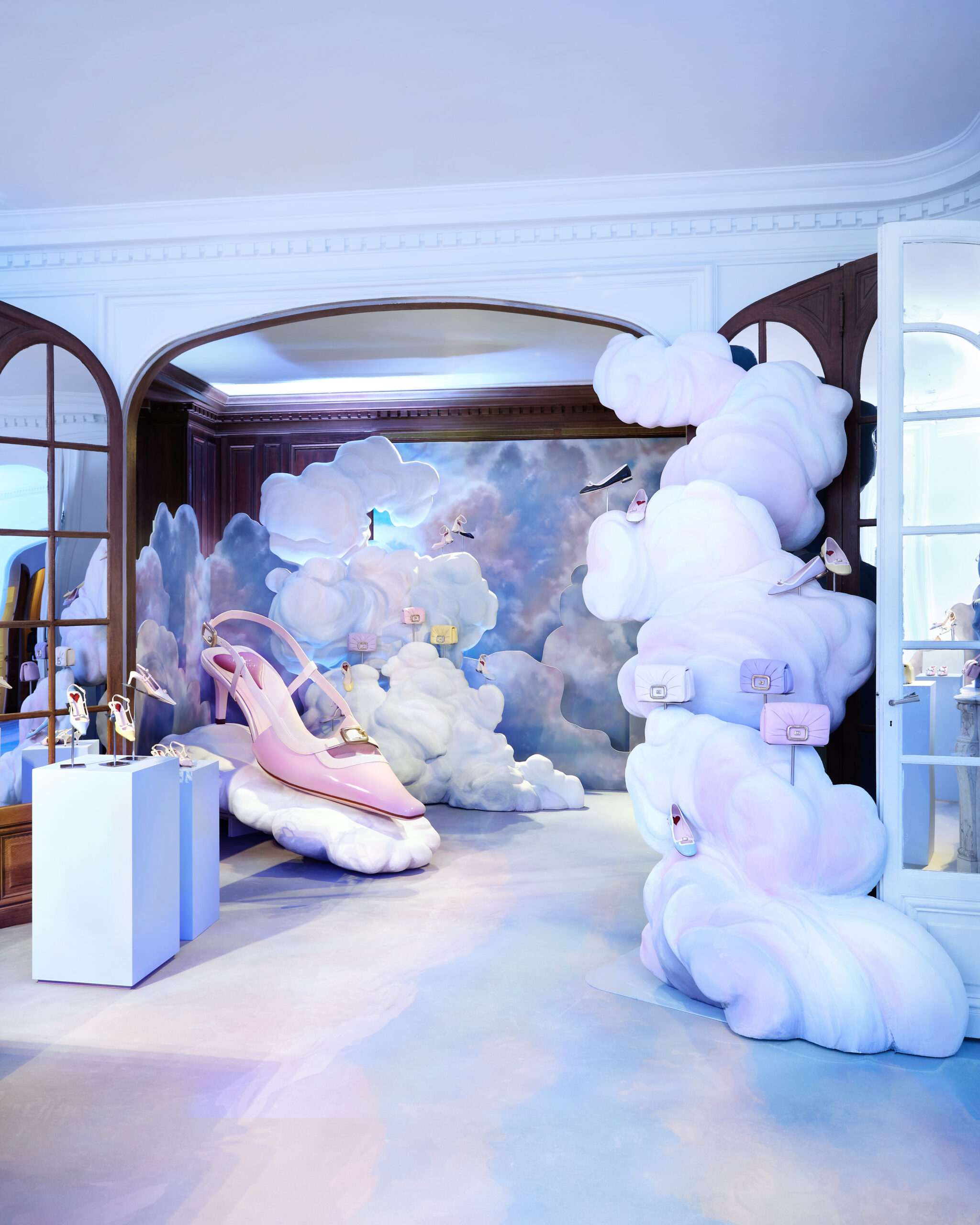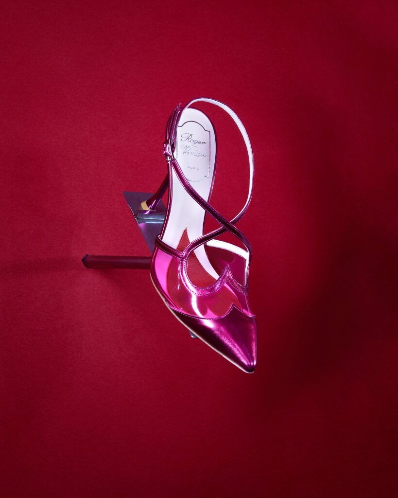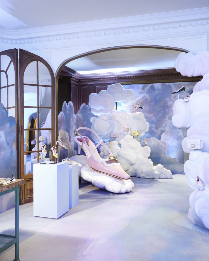 Gherardo Felloni et Leila Maria Fteita, aux inspirations plurielles allant de l’opéra à l’architecture, ont su créer une atmosphère théâtrale qui fait écho aux valeurs fondamentales de la Maison. Cet univers richement ornementé de quatre étages sert d’écrin aux créations de la saison, s’inspirant directement des quatre piliers esthétiques de Roger Vivier.