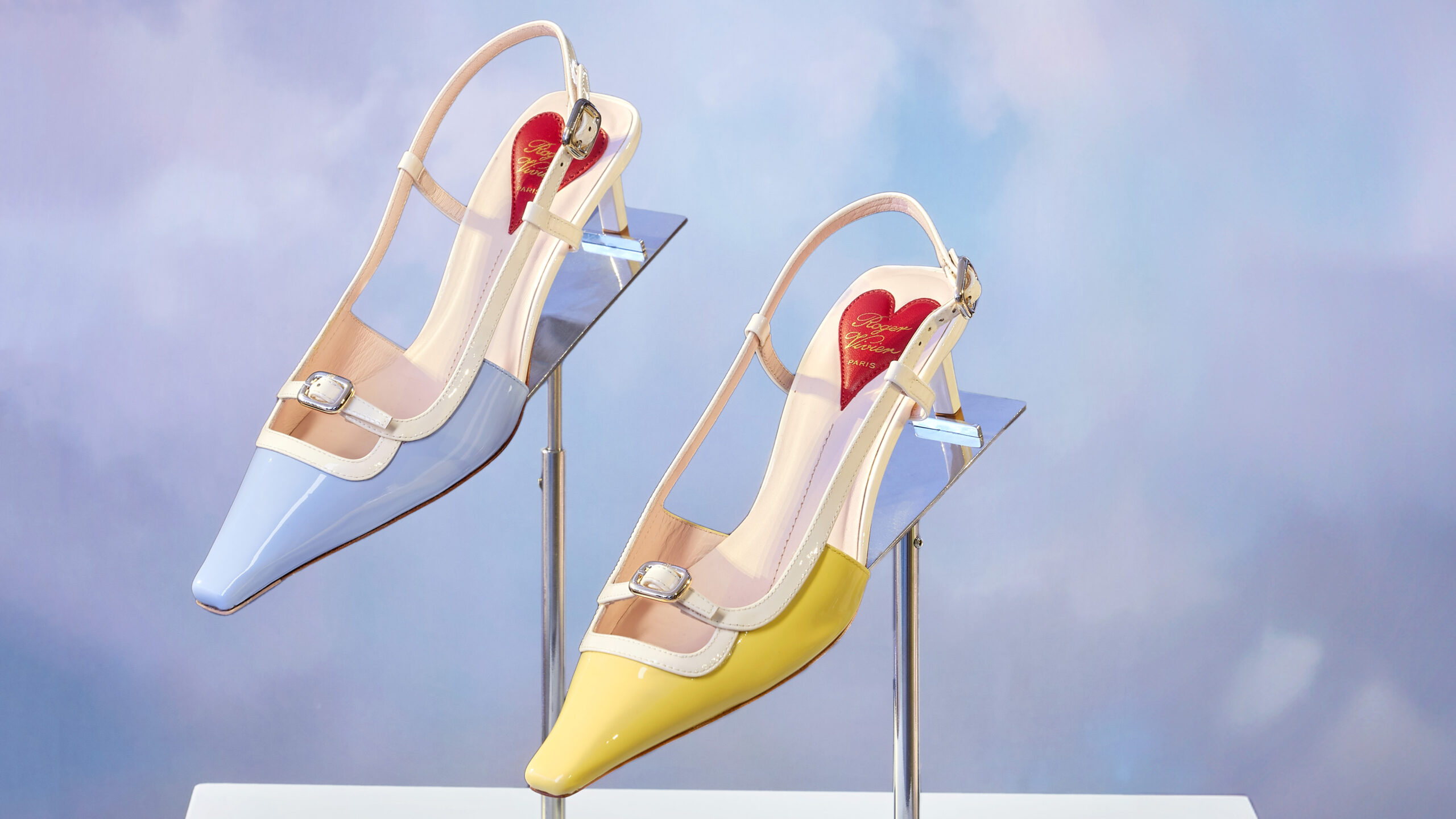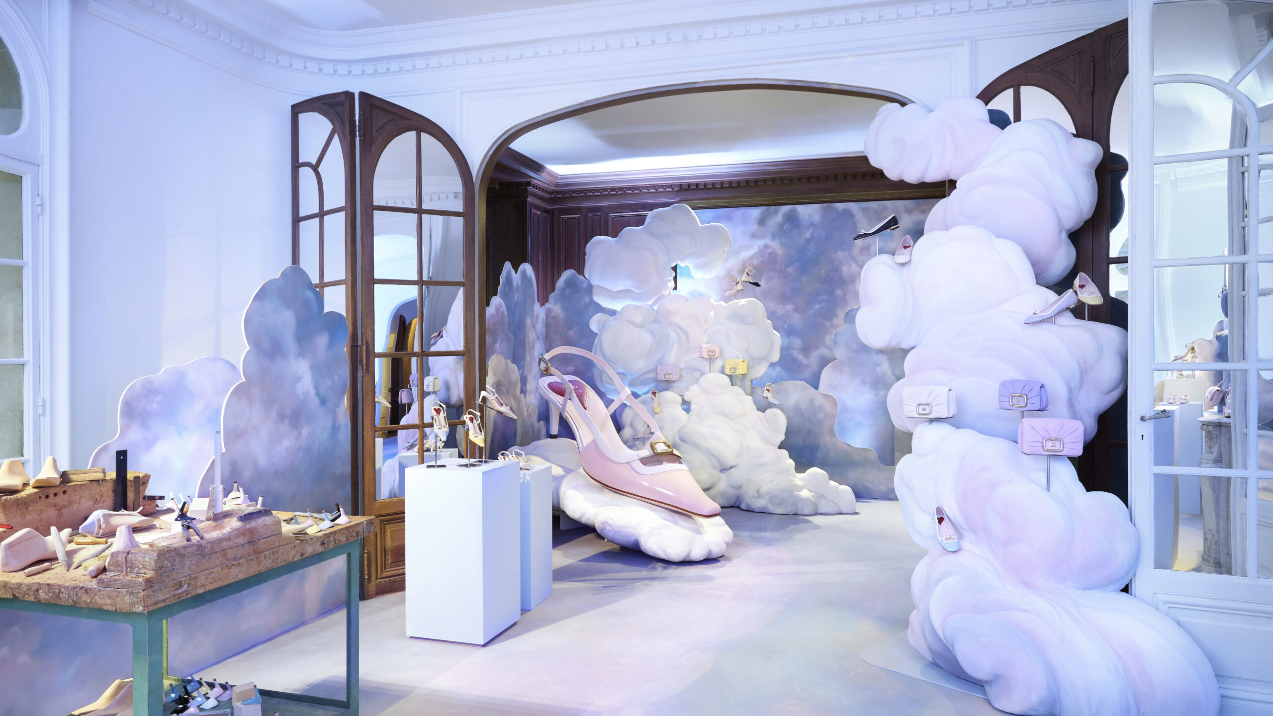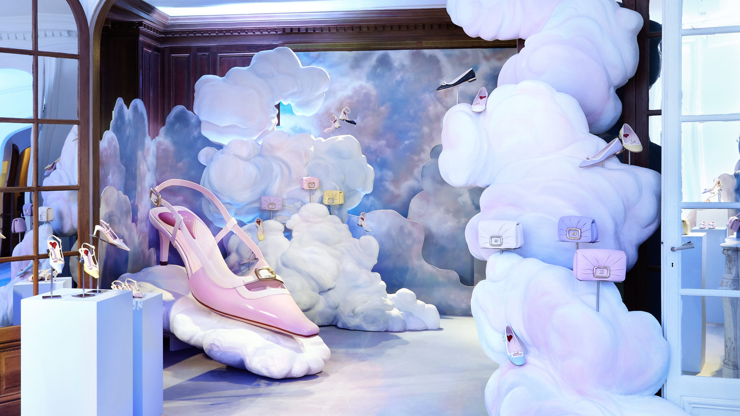 Au troisième niveau, la légèreté est à l’honneur. C’est un monde céleste, rempli de nuages moelleux et éclatant de couleurs pop, qui invite à la découverte du « Viv’ Canard », un design de chaussure rétro aux tonalités pastel. Le talon chaton moderne et les détails de boucles micro ajoutent une note contemporaine à cette pièce d’archive.