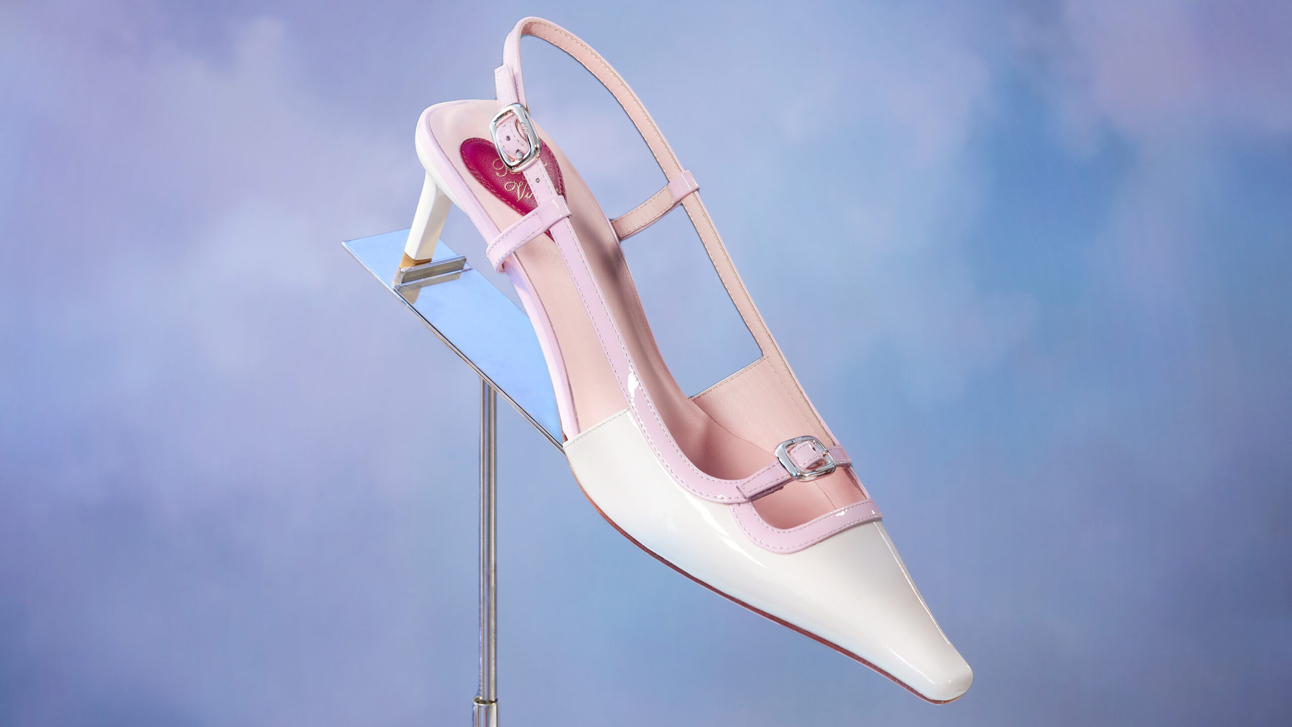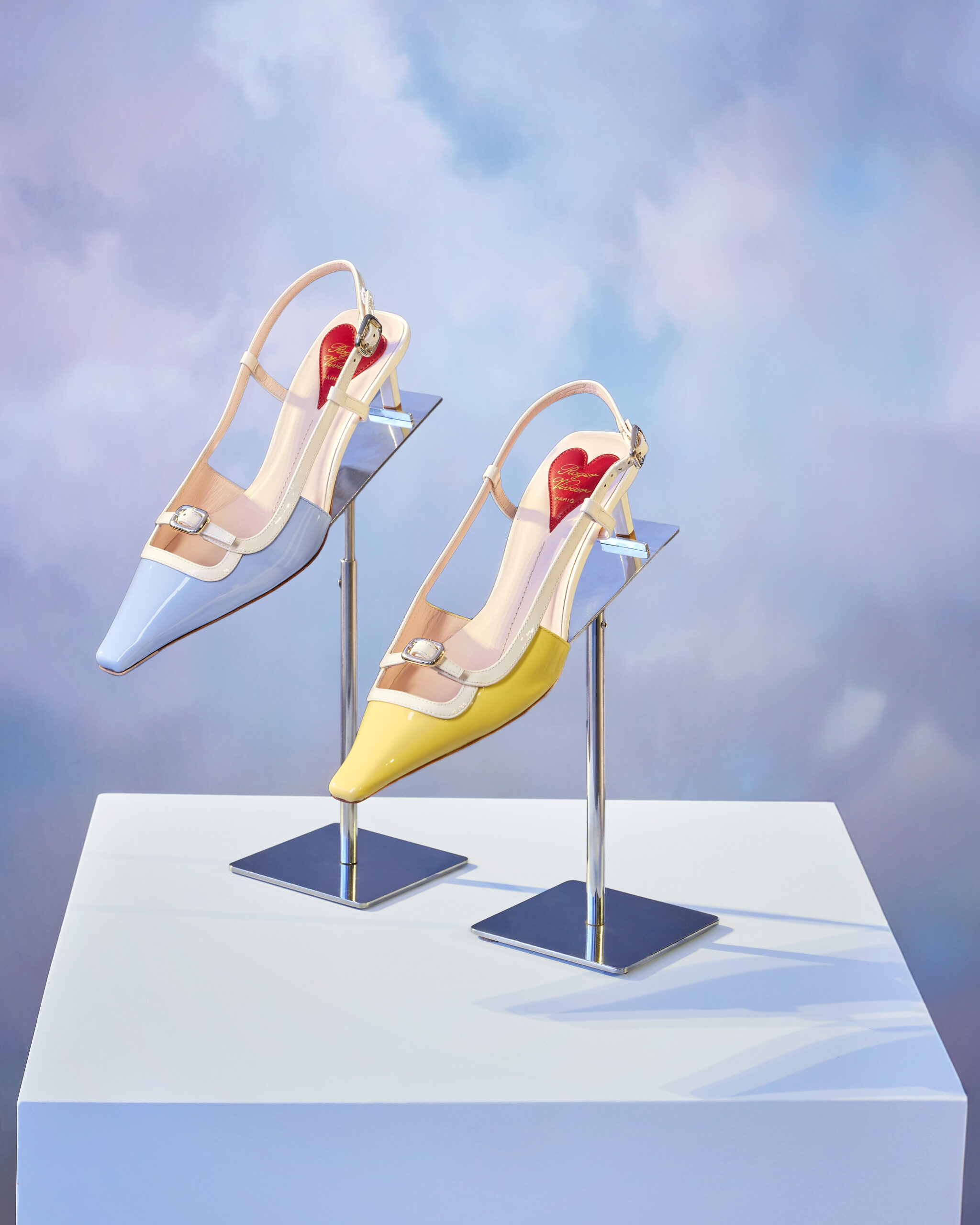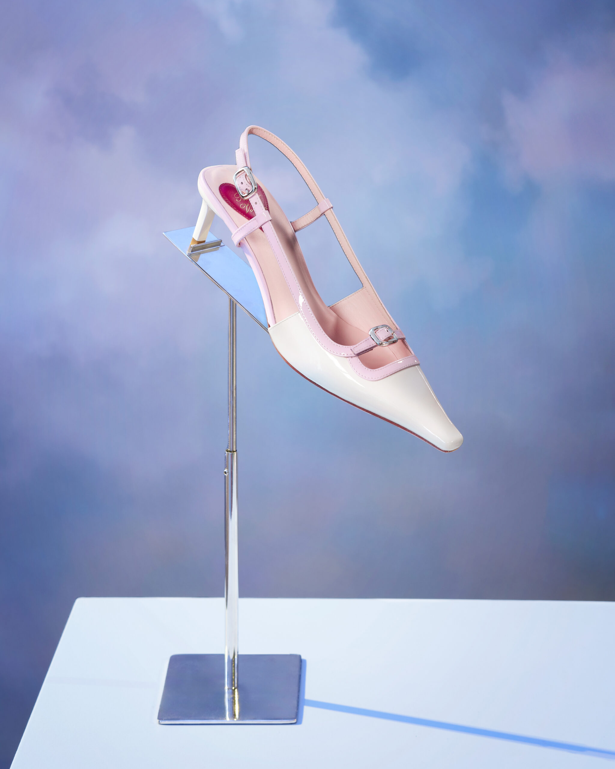 Au troisième niveau, la légèreté est à l’honneur. C’est un monde céleste, rempli de nuages moelleux et éclatant de couleurs pop, qui invite à la découverte du « Viv’ Canard », un design de chaussure rétro aux tonalités pastel. Le talon chaton moderne et les détails de boucles micro ajoutent une note contemporaine à cette pièce d’archive.