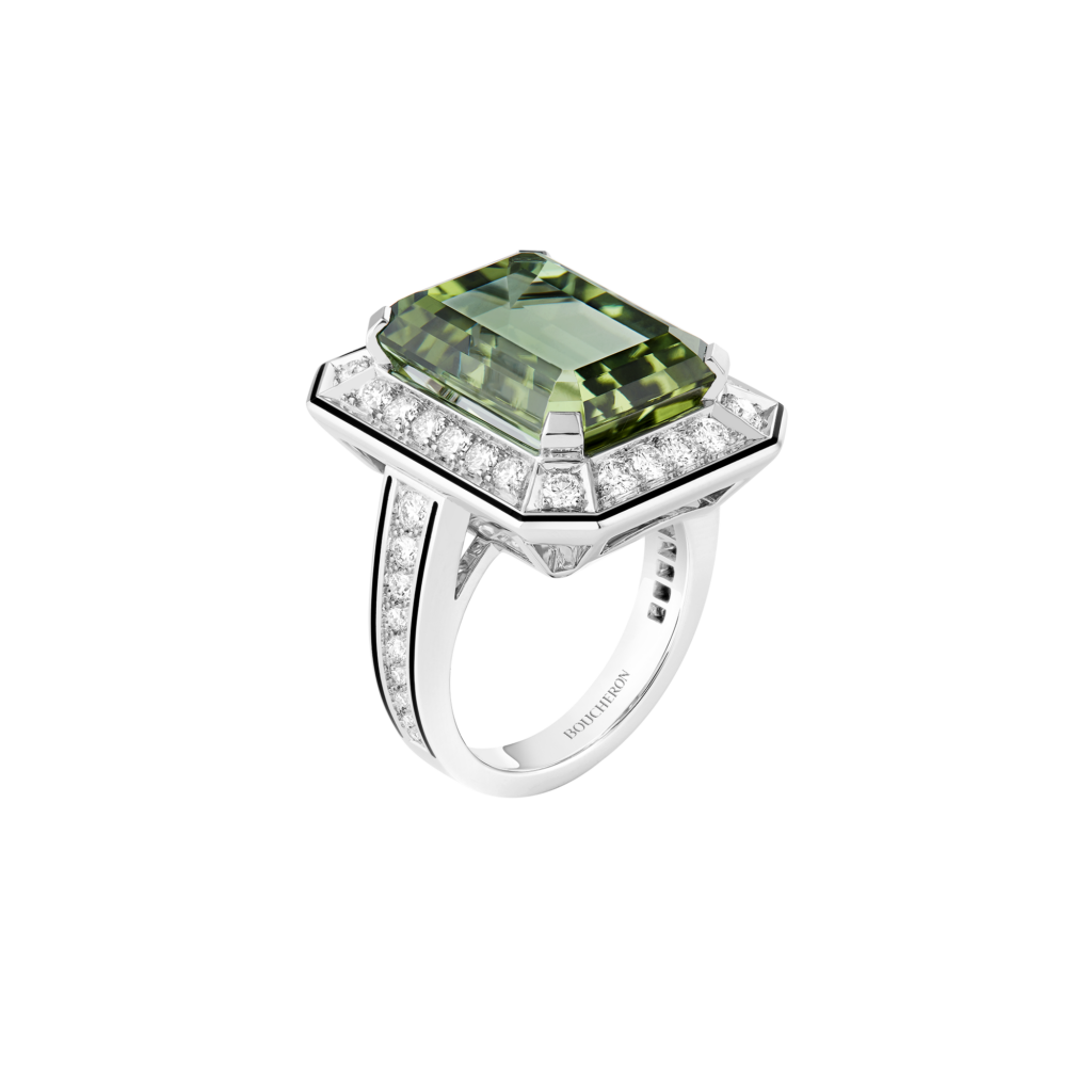 Salma Hayek-Pinault était parée des pendants d’oreilles Vendôme, pavés de diamants sur or blanc, ainsi que de la bague Vendôme Liseré, sertie d’une tourmaline verte de 14,31 carats, pavée de diamants sur or blanc, avec laque noire.