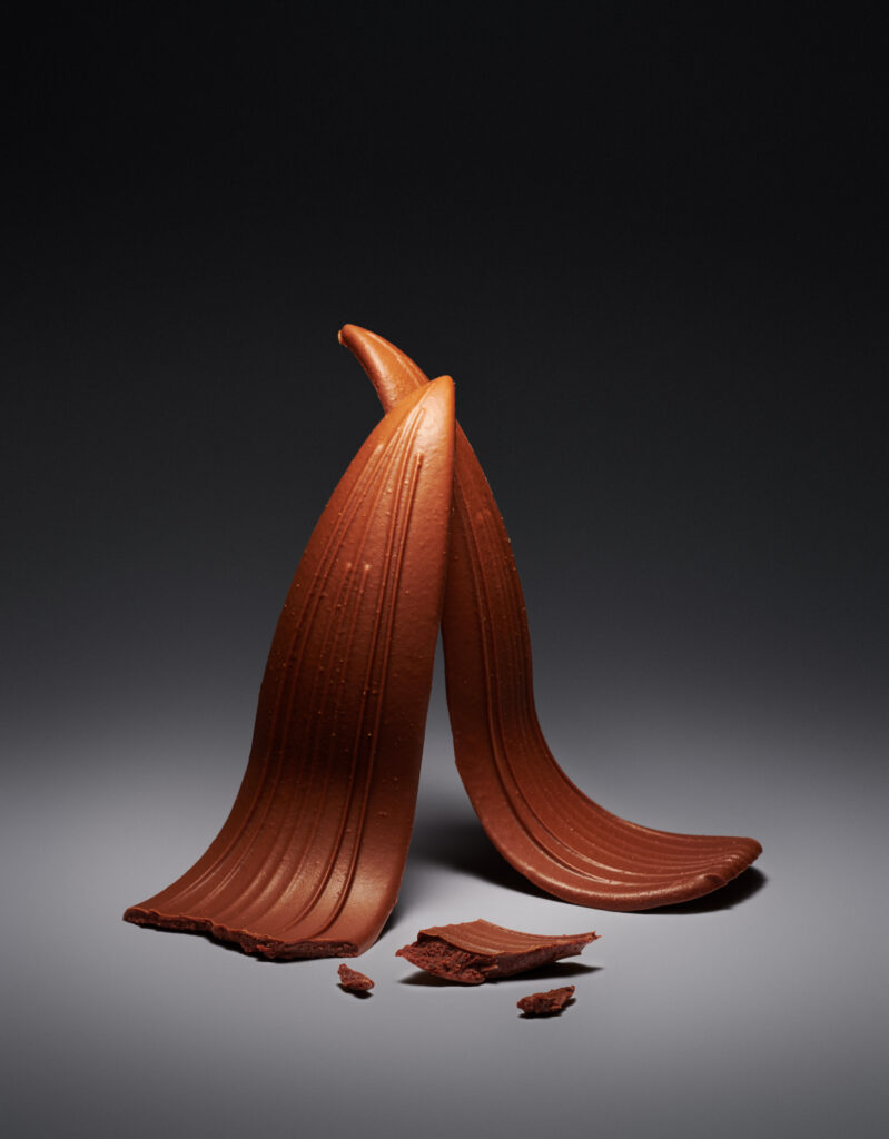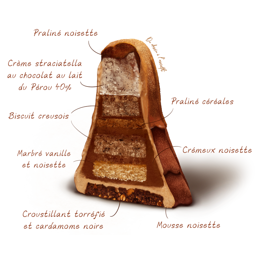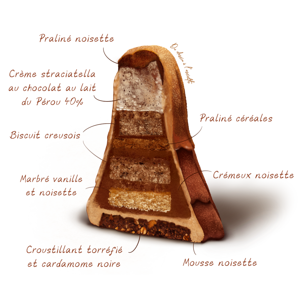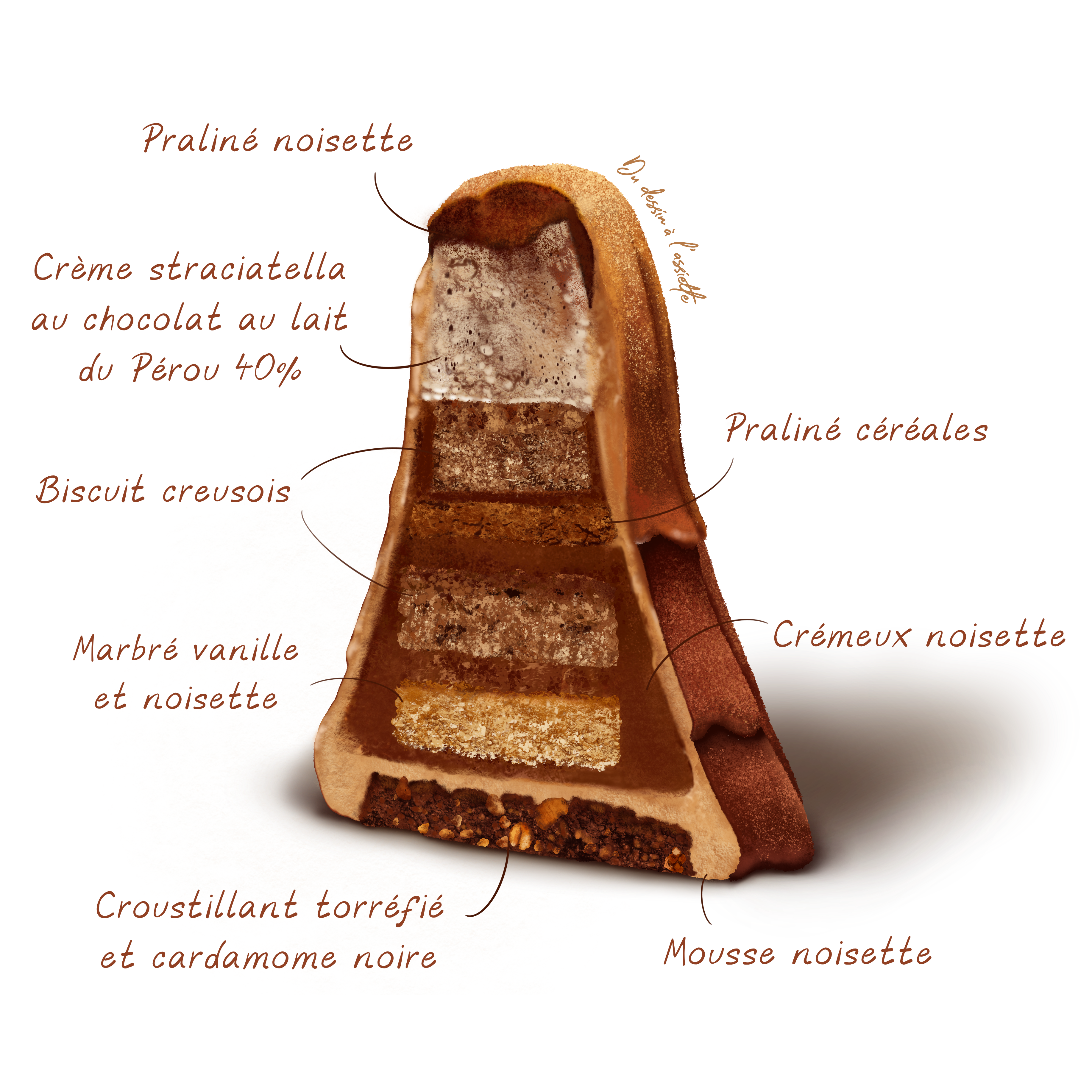 Nimbée dans un écrin de pétales de chocolat craquant et de praliné noisette du Piémont, cette bûche évoque le traditionnel sapin de Noël au travers de son cœur généreux. Chaque composante, du biscuit creusois au crémeux noisette aux notes fumées, incarne l’essence même de l’hiver, enveloppant les convives dans un cocon de saveurs nostalgiques et raffinées.