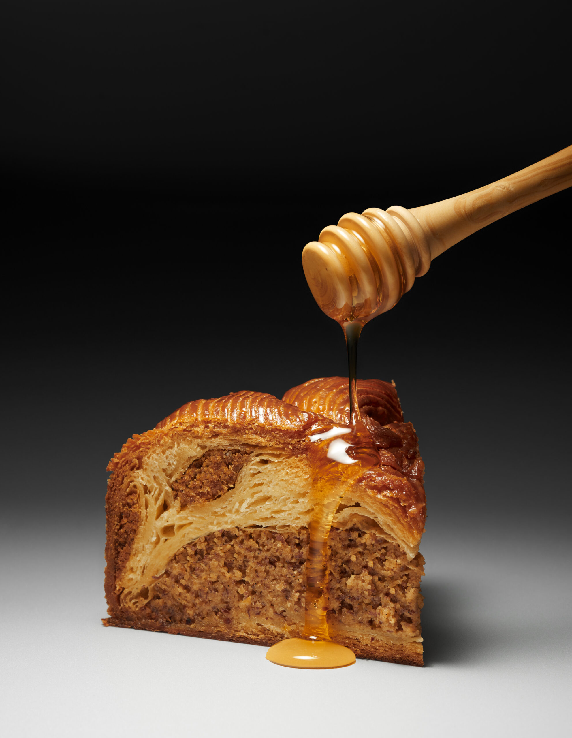 Parfumée à la noisette et au zeste de citron, la pâte feuilletée de cette galette donne naissance à une crème de frangipane exquise. Elle est rehaussée par le miel de Luzerne de Normandie et couverte d’une opaline de Miel Peninsula, cultivé dans les ruches du potager de l’hôtel.