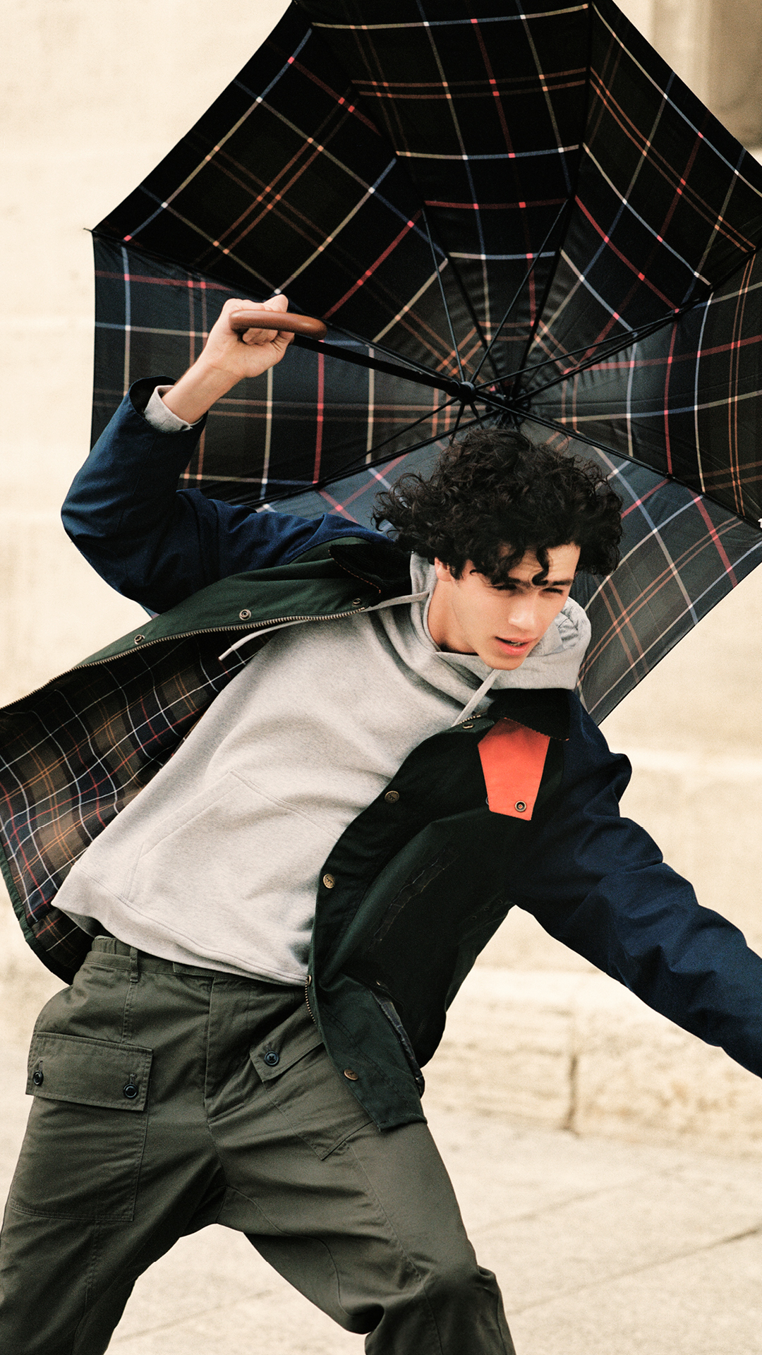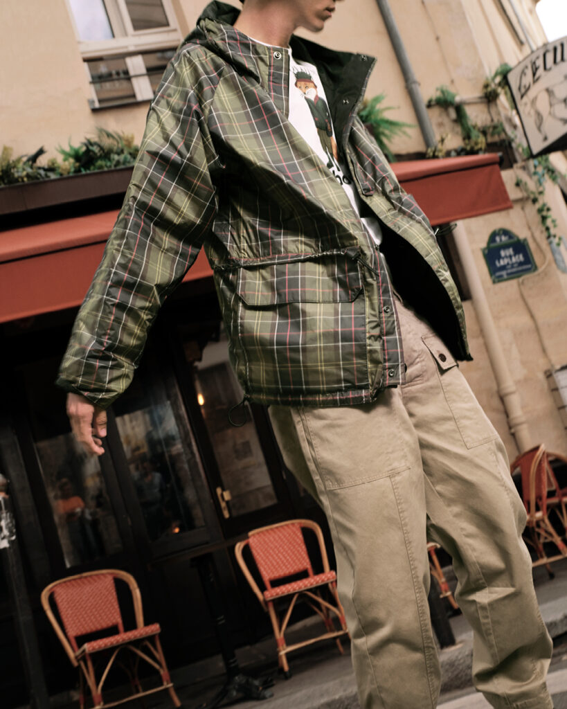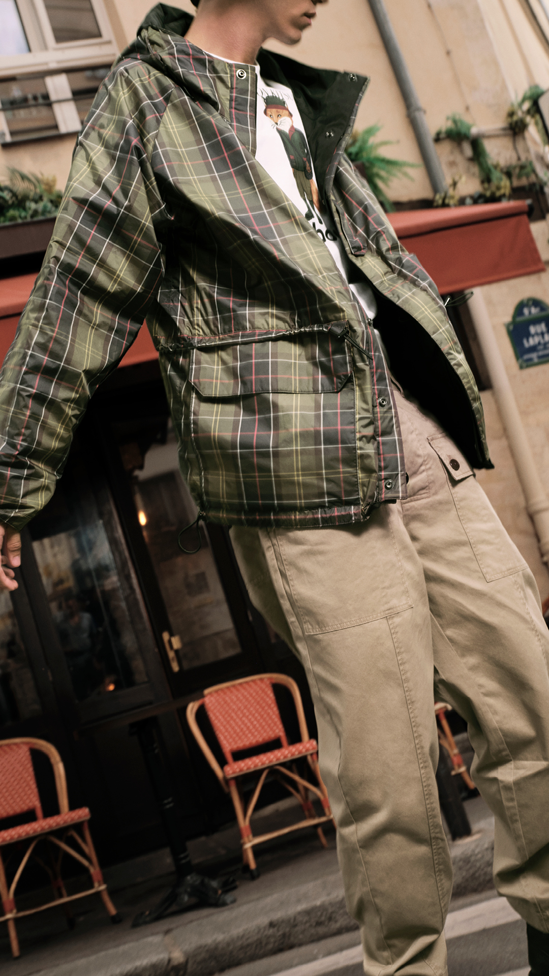 Ian Bergin, Directeur Créatif Homme chez Barbour, et la maison Kitsuné dépeignent une vision où l’irrévérence se fond avec le classicisme, où chaque pièce est pensée pour le quotidien sans jamais négliger l’excellence. La Veste Militaire Réversible Waterproof, par exemple, est une réinterprétation brillante du vêtement fonctionnel, qui devient un véritable accessoire de mode grâce à son design réversible.
