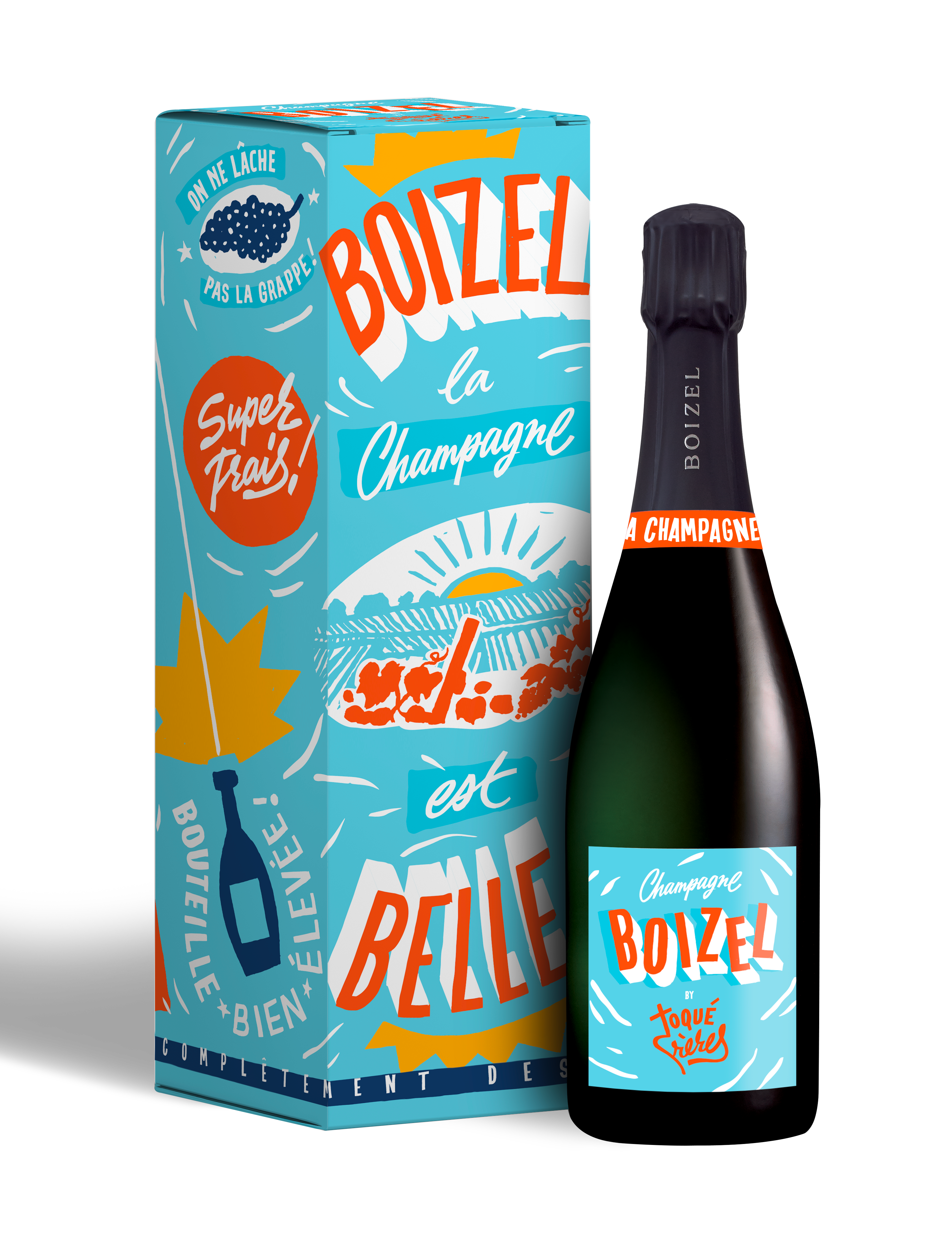 La Maison Boizel, connue pour ses champagnes raffinés depuis 1834, rencontre ici les Toqué Frères, un duo d’artistes connus pour leur art urbain et leur approche vintage. Les frères ont mis leur talent au service du design du coffret Brut Réserve de Champagne Boizel, donnant naissance à une esthétique colorée, vivante, et optimiste, qui fait écho à l’énergie positive de l’œuvre. Ce sont des couleurs pop et acidulées, des jeux de mots ludiques qui décorent l’étiquette et l’étui de cette cuvée spéciale.