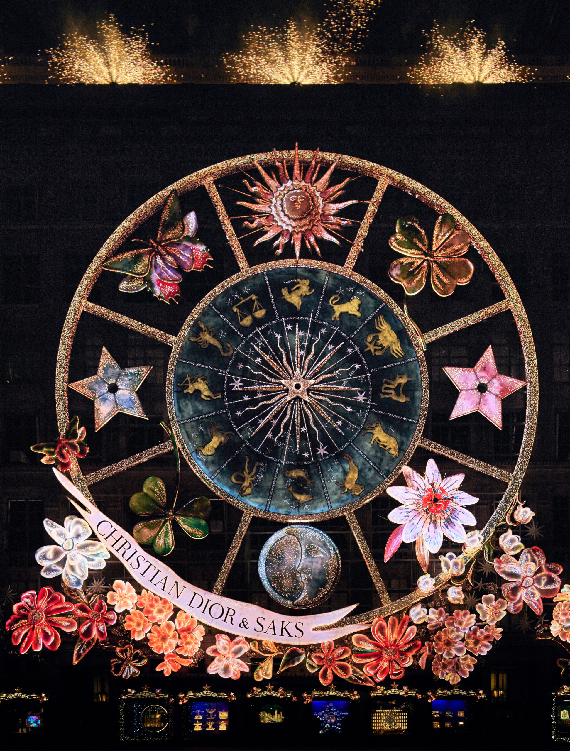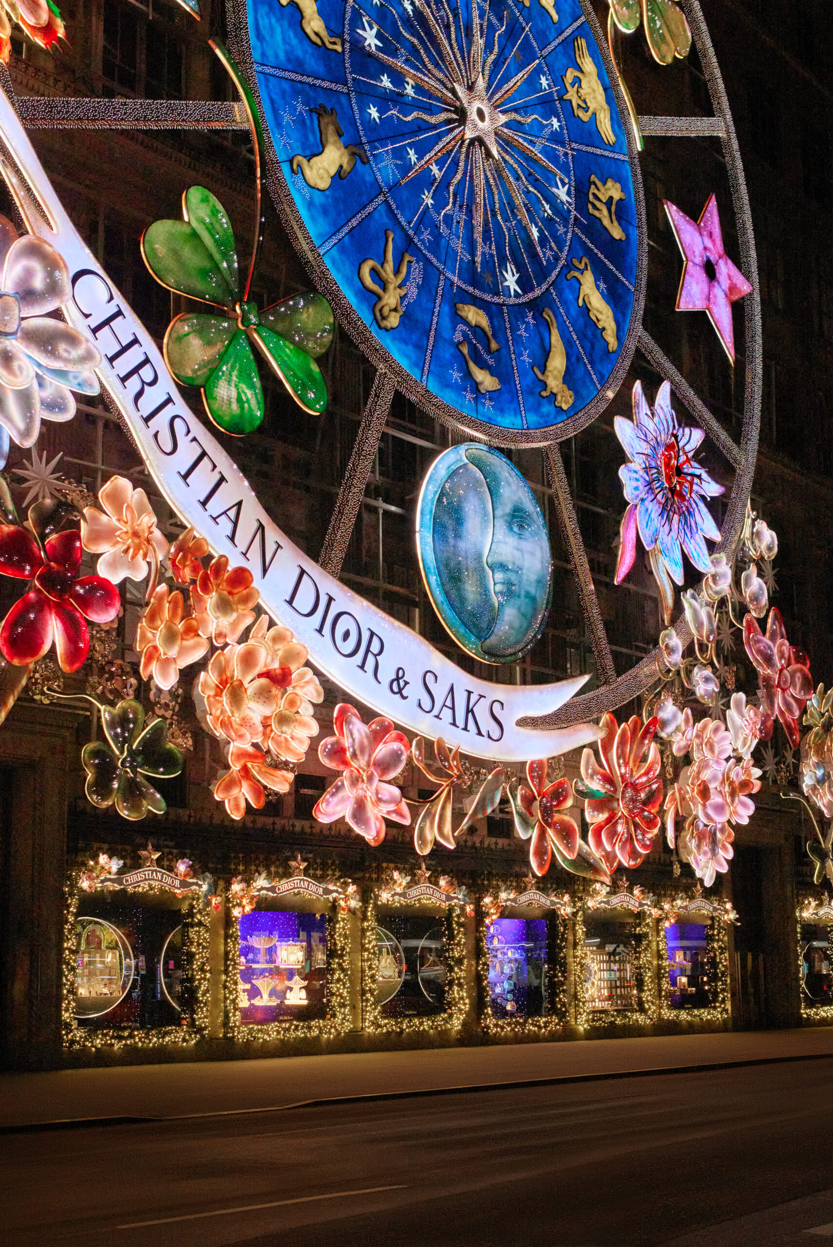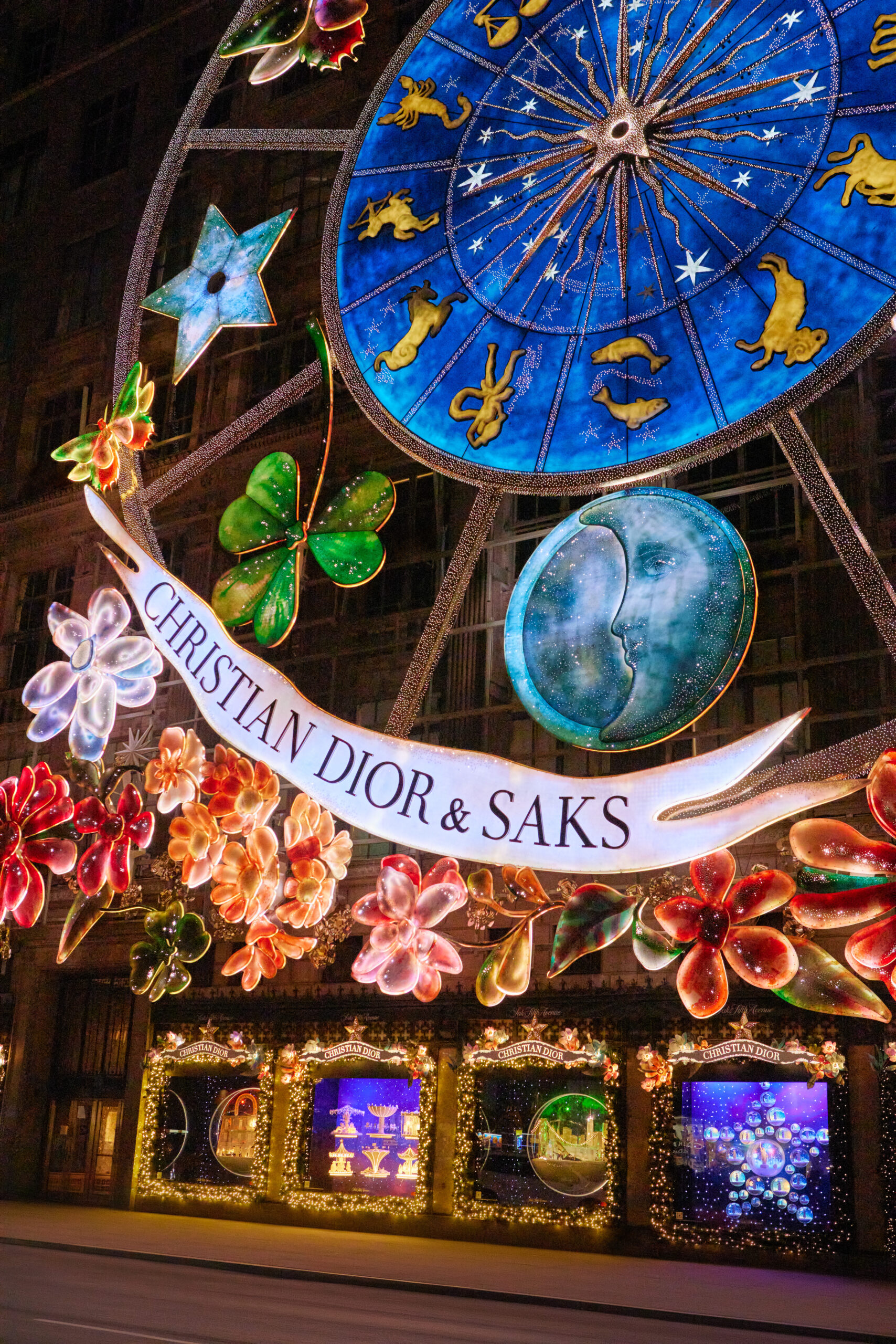 Du 20 novembre 2023 au 5 janvier 2024, la façade de Saks Fifth Avenue devient l’écrin d’une installation fabuleuse, mettant en lumière les codes emblématiques de Dior. Une roue de la Fortune géante, ornée d’étoiles, de trèfles et des signes du zodiaque, crée un décor féerique, animé chaque soir par des jeux de lumière spectaculaires. Cette mise en scène, pensée par Maria Grazia Chiuri et l’artiste Pietro Ruffo pour le défilé Dior croisière 2024, réinterprète l’essence créative de Dior dans une chorégraphie céleste.