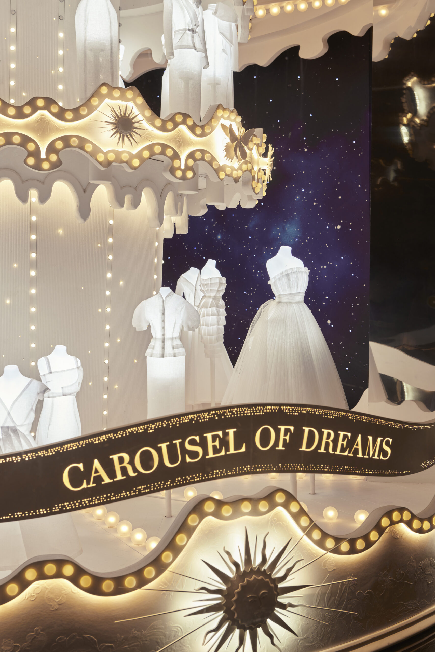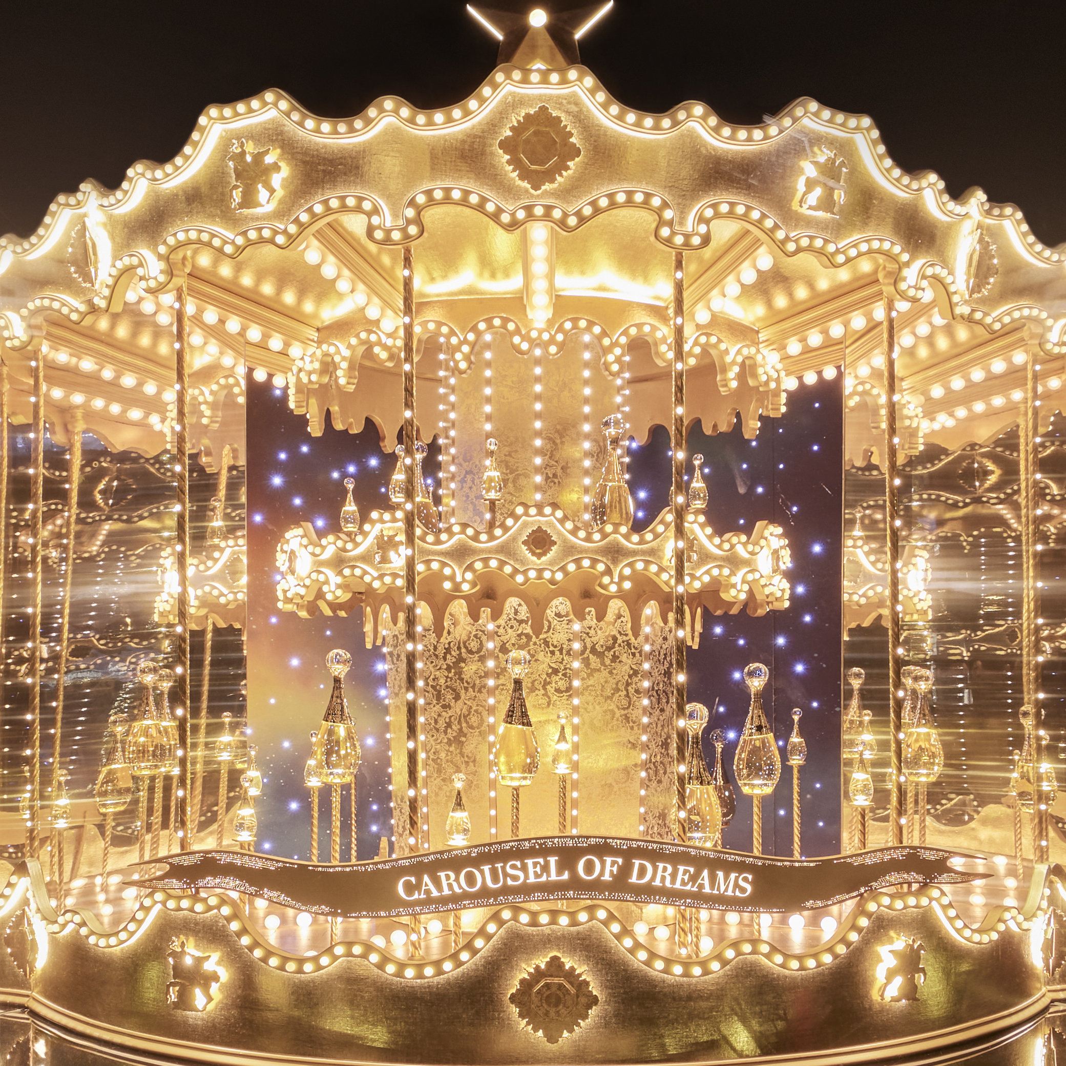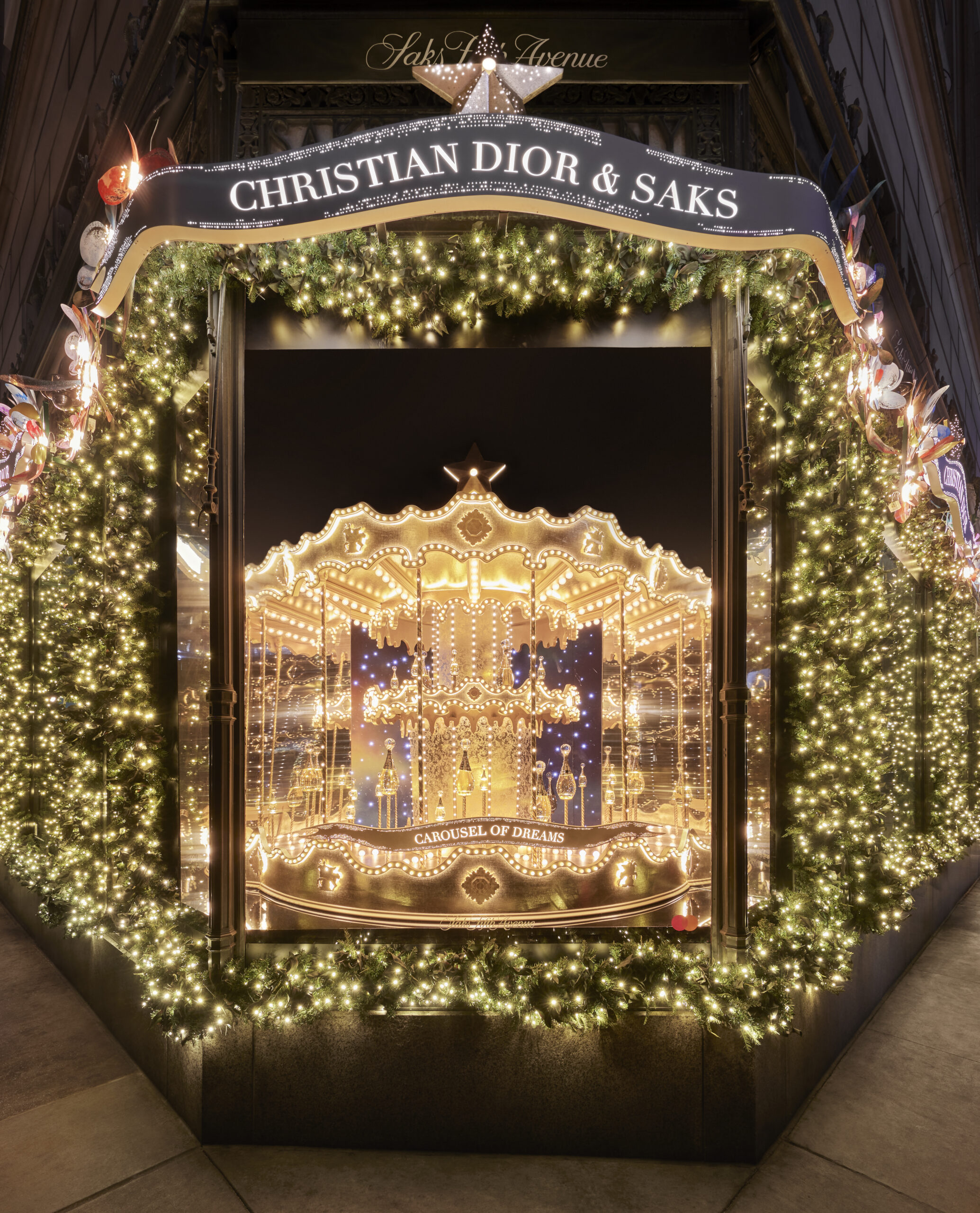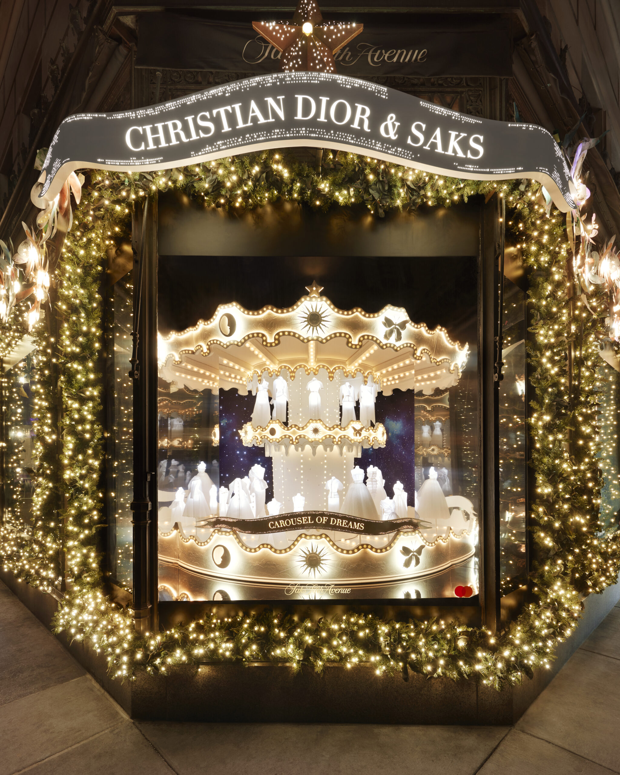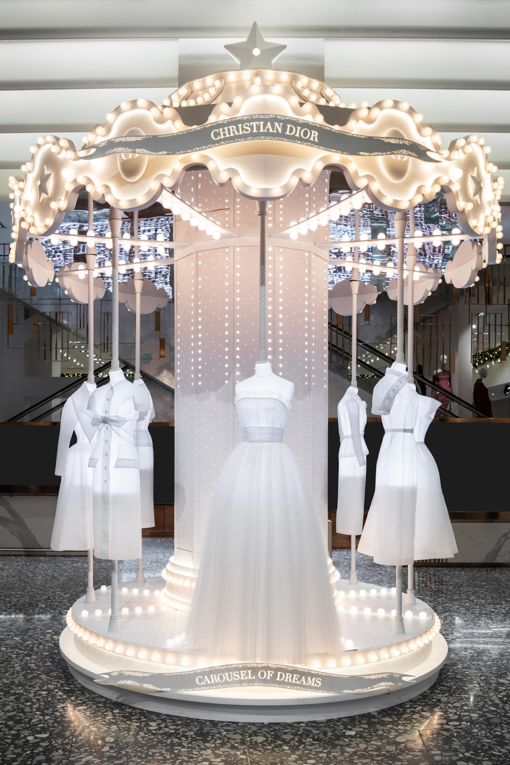 À l’intérieur de Saks, un carrousel de près de cinq mètres de haut symbolise l’union entre Dior et les États-Unis. Les silhouettes iconiques de Christian Dior, telles que New York, Amérique et Fifth Avenue, s’animent dans une féerie éblouissante.