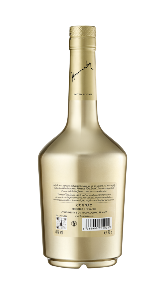 Le doré, couleur signature de l’histoire de la Maison Hennessy, se retrouve sublimé dans cette édition limitée. Il évoque la richesse des armoiries familiales, le mûrissement des raisins sous le soleil de Charente, et bien sûr, le scintillement des étiquettes qui ornent les bouteilles depuis des générations. L’élégance de la bouteille incurvée, le col haut et l’étiquette classique du Cognac Hennessy Very Special, se voient magnifiés par cette parure dorée, faisant de cette édition un véritable trésor pour les amateurs de spiritueux.