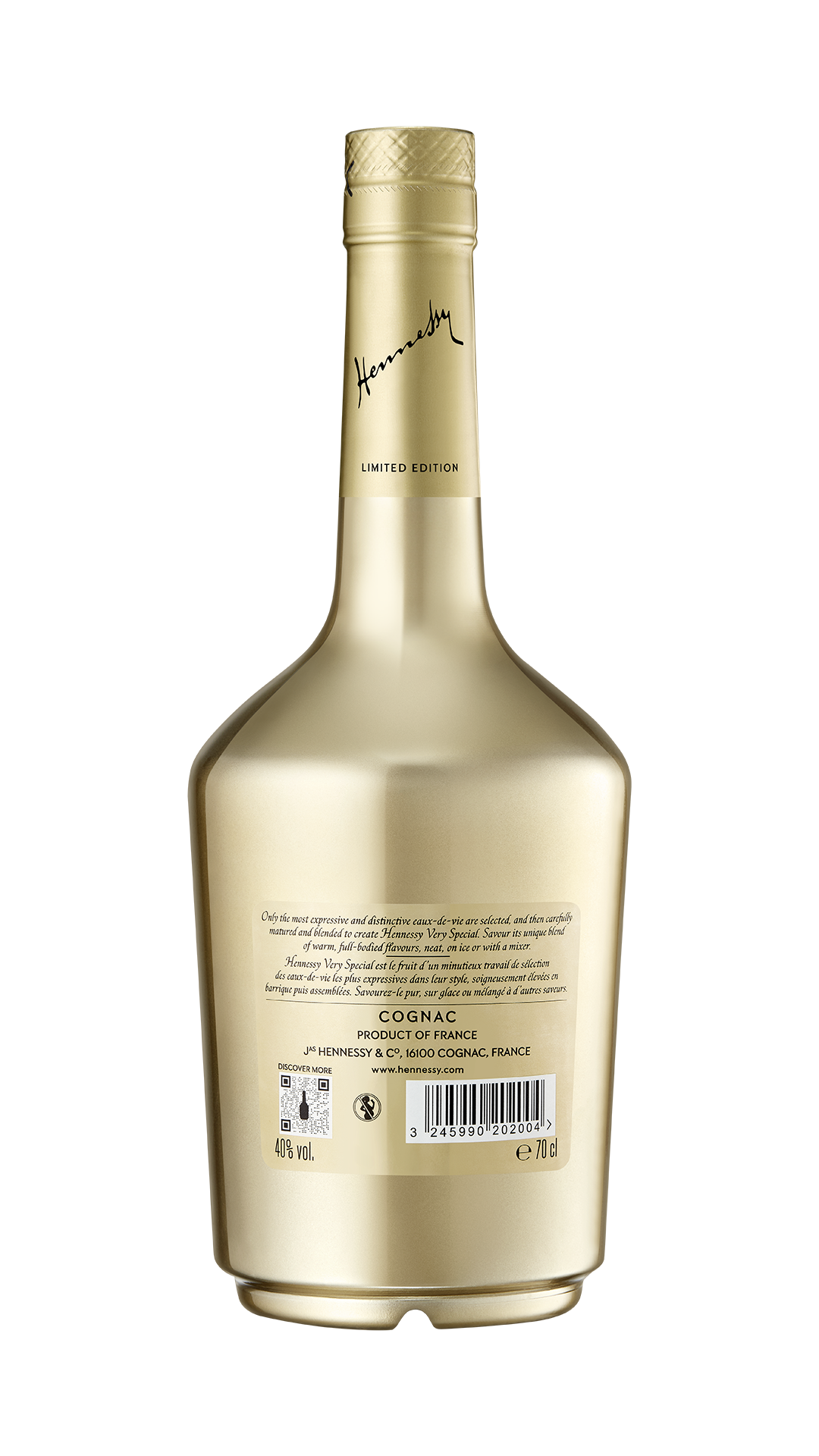 Le doré, couleur signature de l’histoire de la Maison Hennessy, se retrouve sublimé dans cette édition limitée. Il évoque la richesse des armoiries familiales, le mûrissement des raisins sous le soleil de Charente, et bien sûr, le scintillement des étiquettes qui ornent les bouteilles depuis des générations. L’élégance de la bouteille incurvée, le col haut et l’étiquette classique du Cognac Hennessy Very Special, se voient magnifiés par cette parure dorée, faisant de cette édition un véritable trésor pour les amateurs de spiritueux.