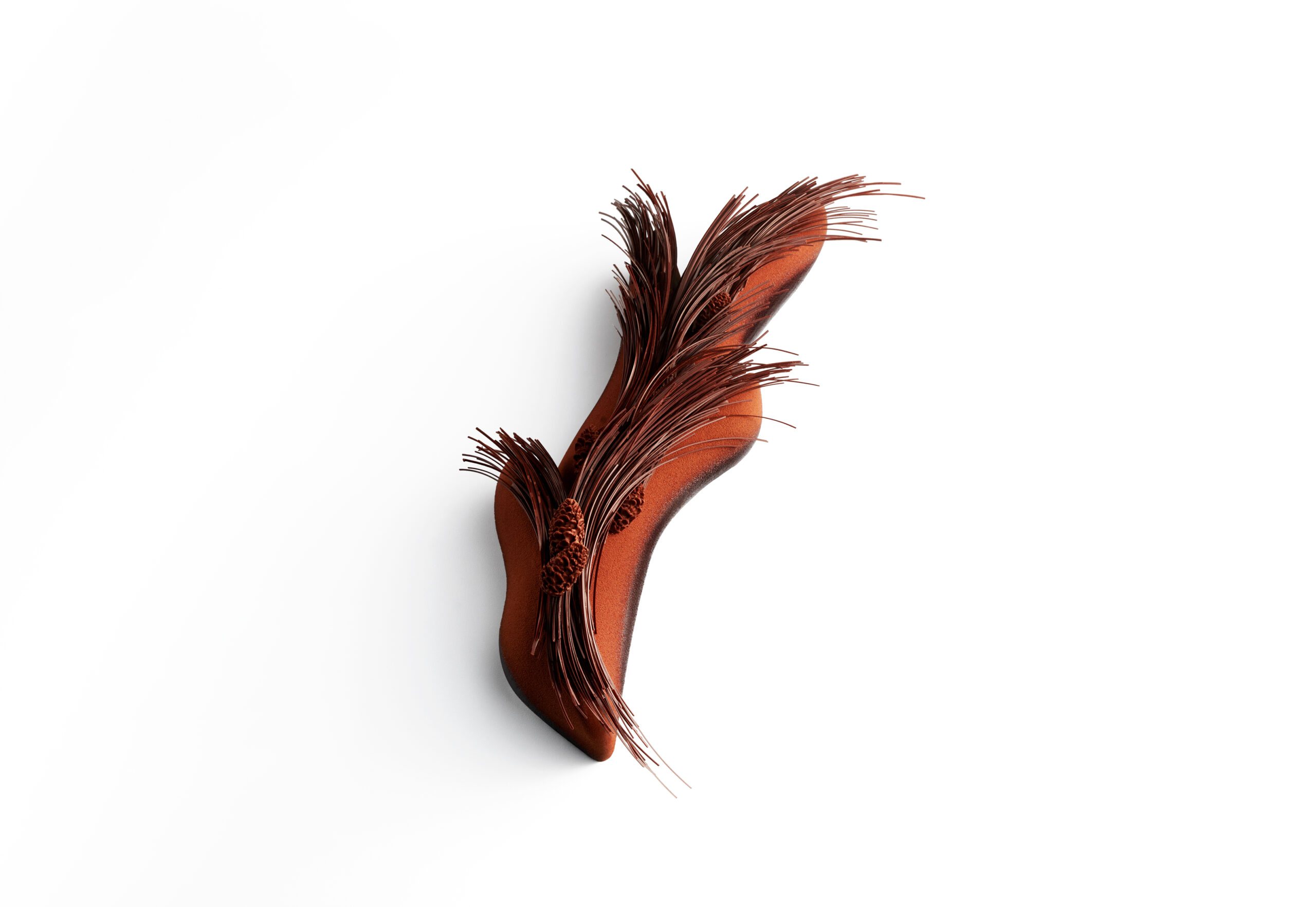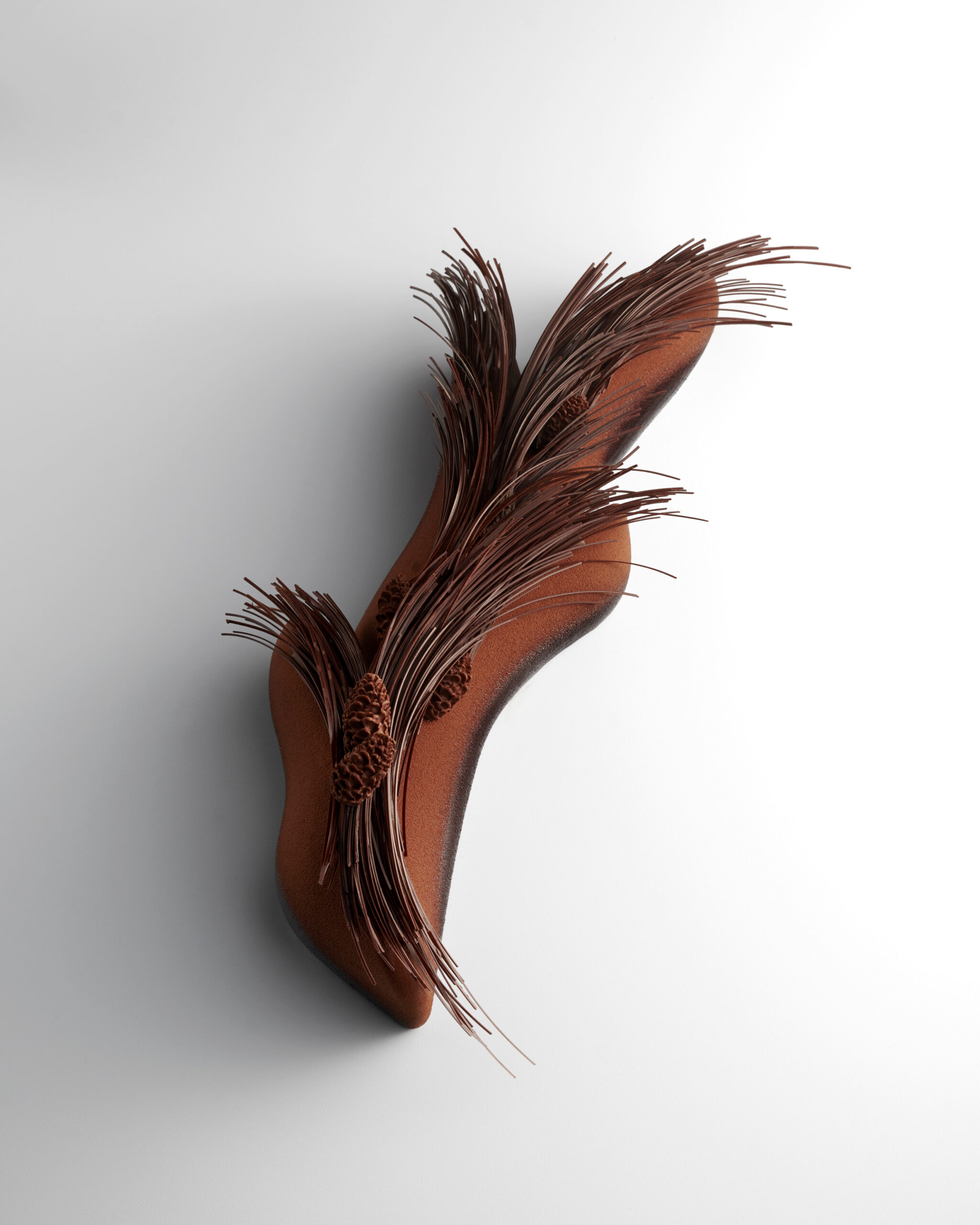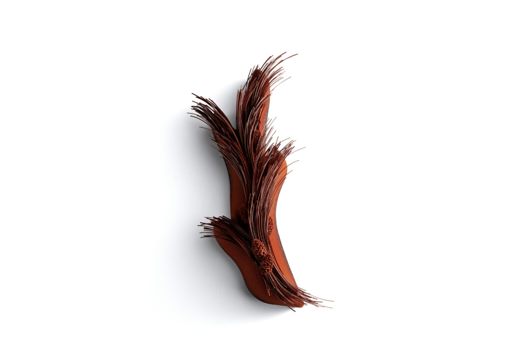 - Saveurs et Textures : L’entremets offre une mousse légère au mucilage de cabosse de cacao, apportant des notes fruitées et acidulées. Un crémeux chocolat noir 70% de Papouasie-Nouvelle-Guinée enrichit la bûche de saveurs profondes et boisées, complété par un praliné au pain grillé et légèrement fumé.