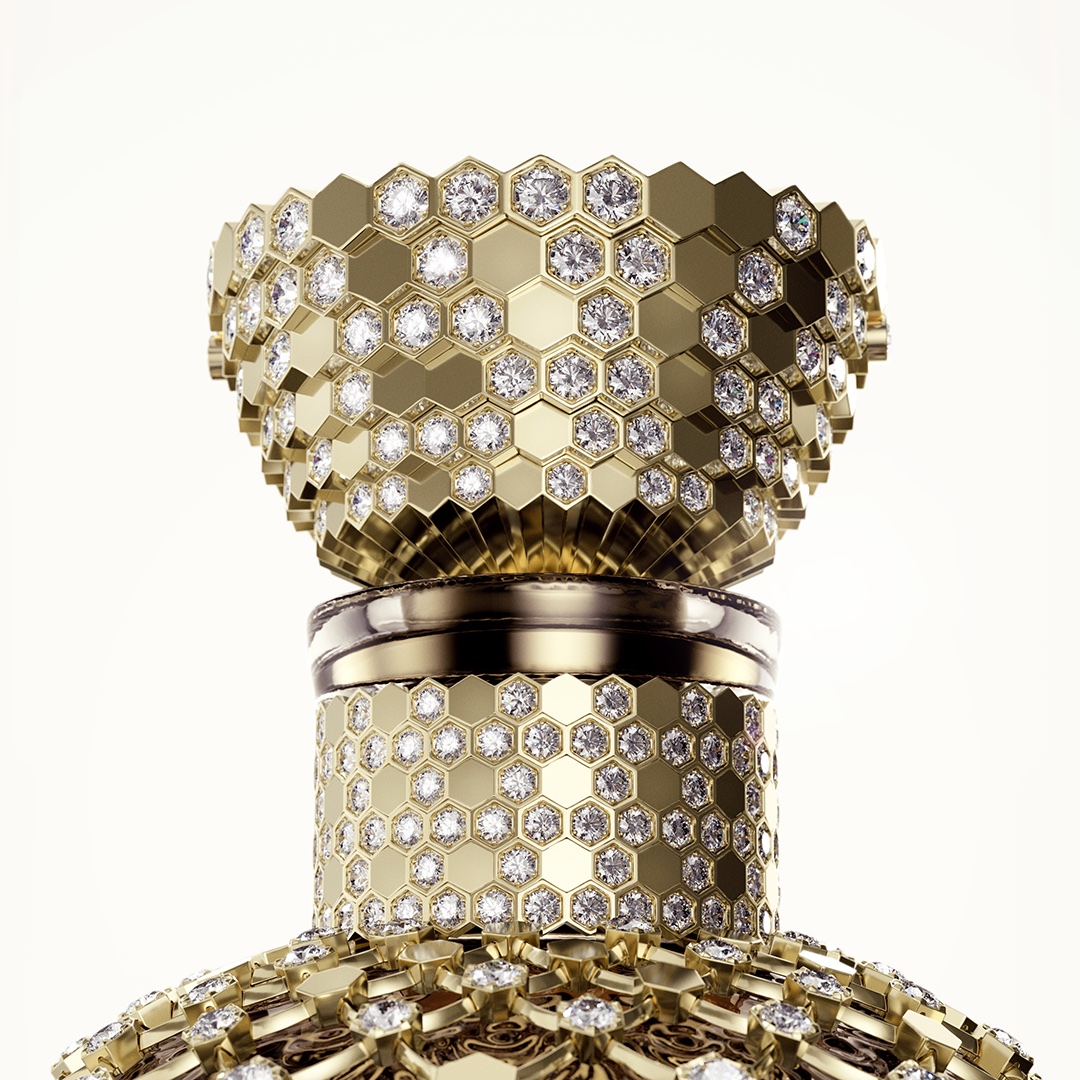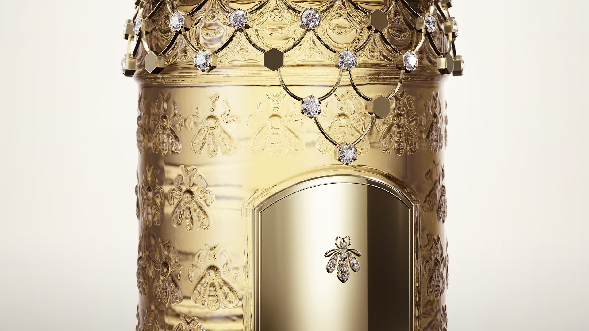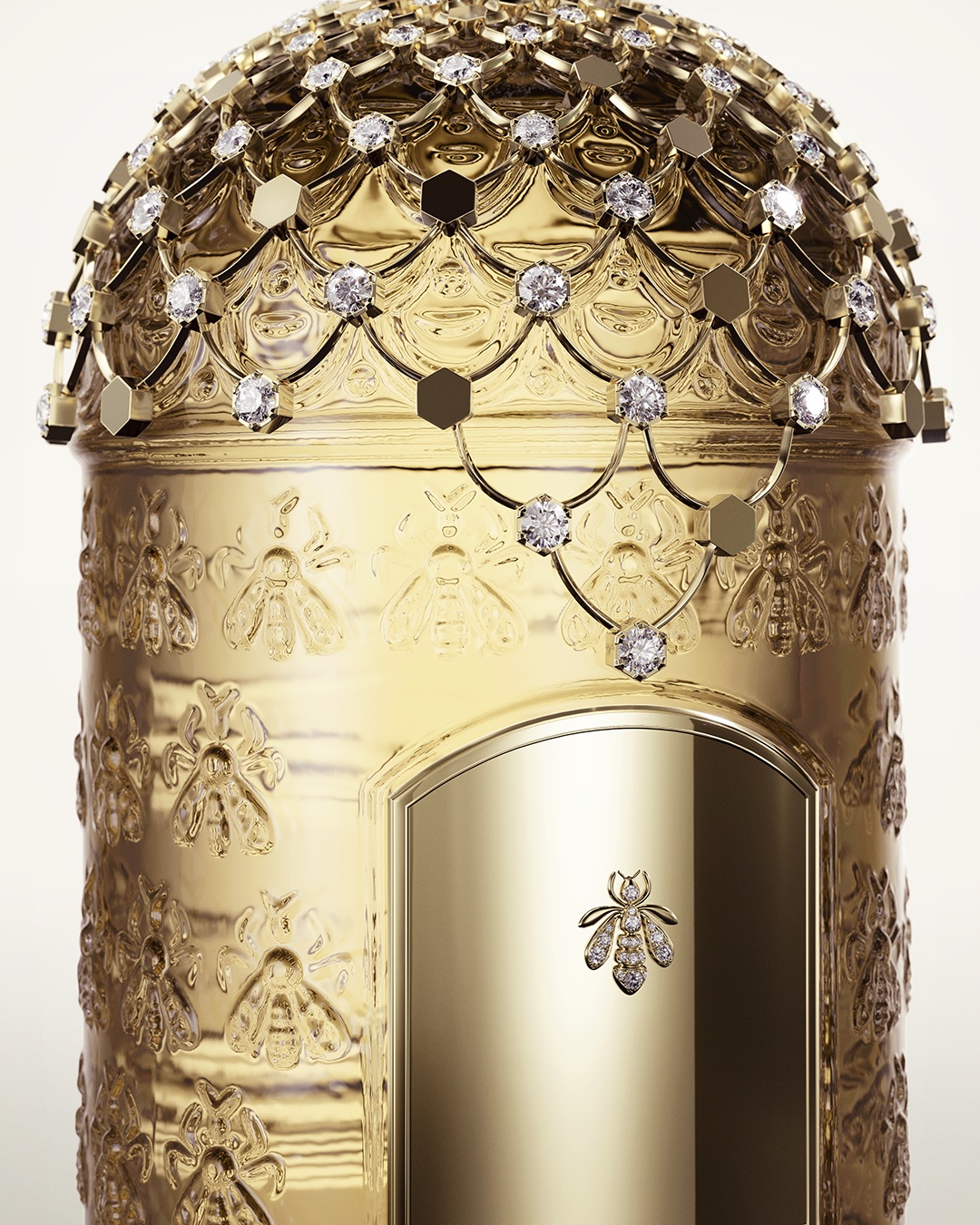 Afin de magnifier cette édition exceptionnelle, Chaumet décore le flacon d’une parure flamboyante composée de 658 grammes d’or et 336 diamants ronds, totalisant un poids de 55 carats. Mais la surprise ne s’arrête pas là. Le capot révèle une bague éblouissante couronnée d’un majestueux diamant de 2 carats. La pièce est finalisée par une plaque d’or ornée d’une abeille diamantée.