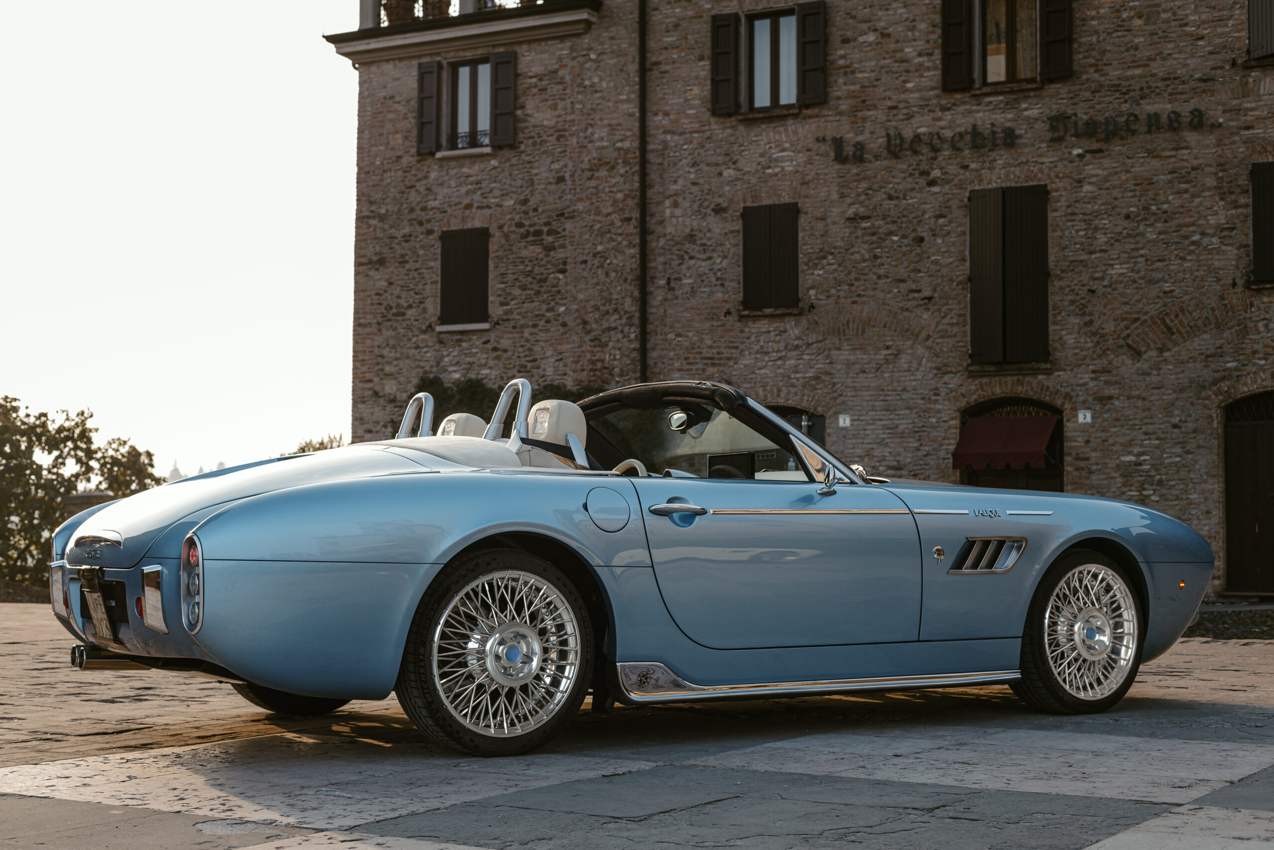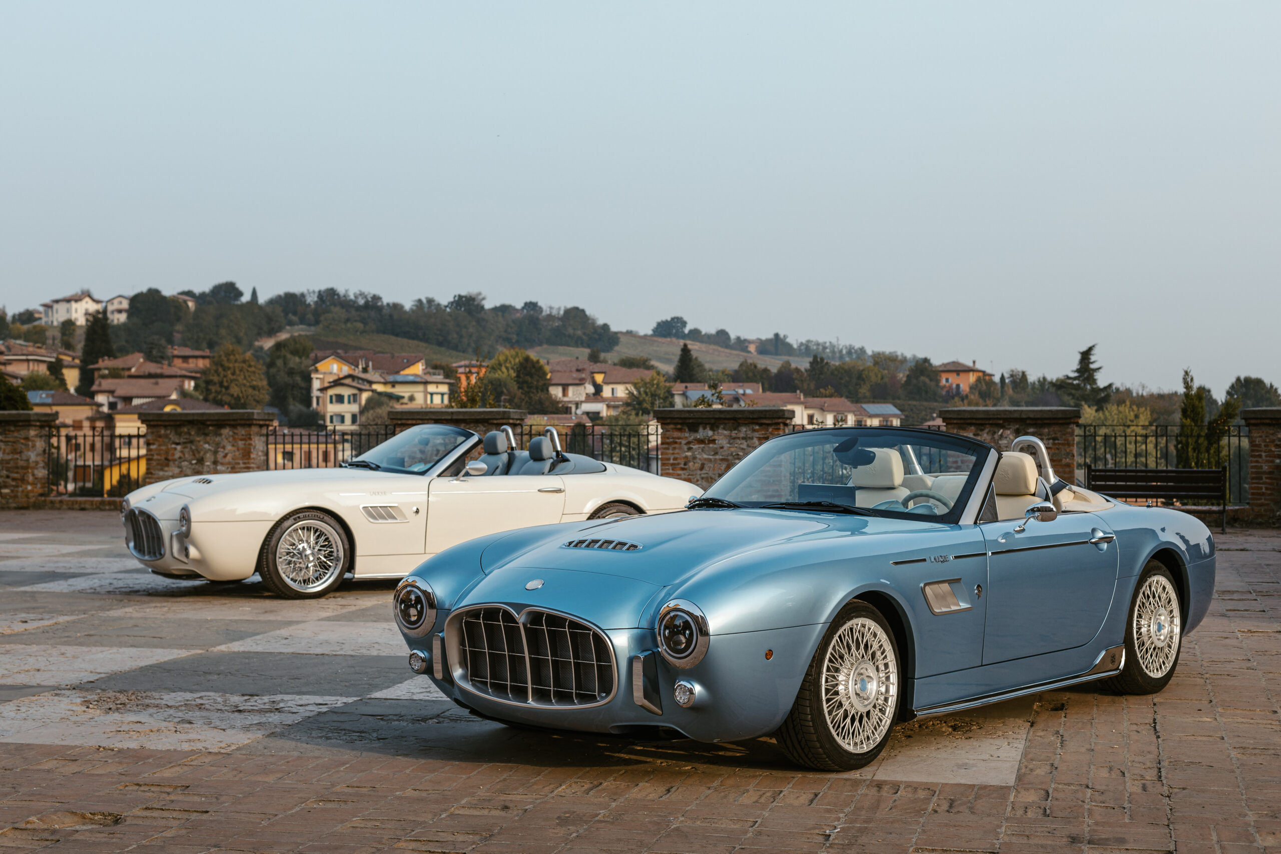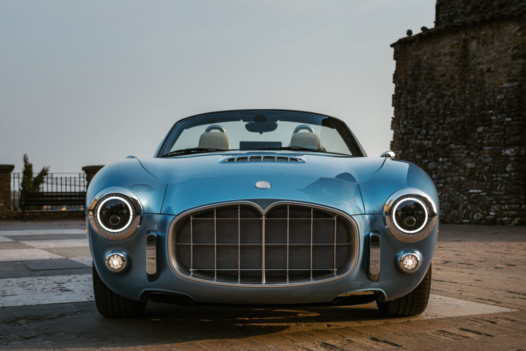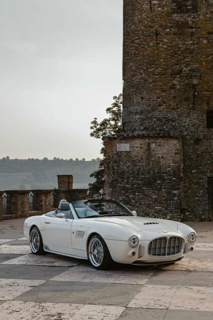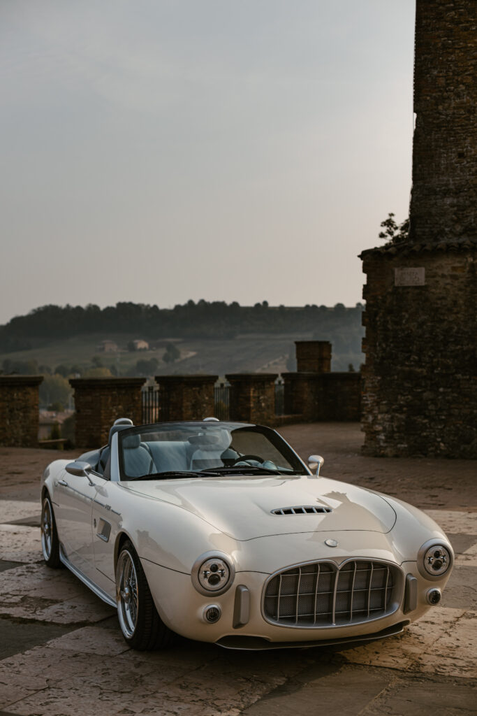 La voiture a été conçue et développée au Centro Stile d’Ares à Modène. Son extérieur en fibre de carbone fait écho aux lignes fluides des voitures vintage telles que la Maserati A6GCS Frua et la Ferrari 250 GT California. Le chrome habille la voiture, des pots d’échappement aux jantes fil de fer, en un hommage appuyé au style rétro. Disponible en rouge Amalfi et bleu clair méditerranéen, la carrosserie s’adapte à ceux qui souhaitent faire une déclaration visuelle audacieuse.