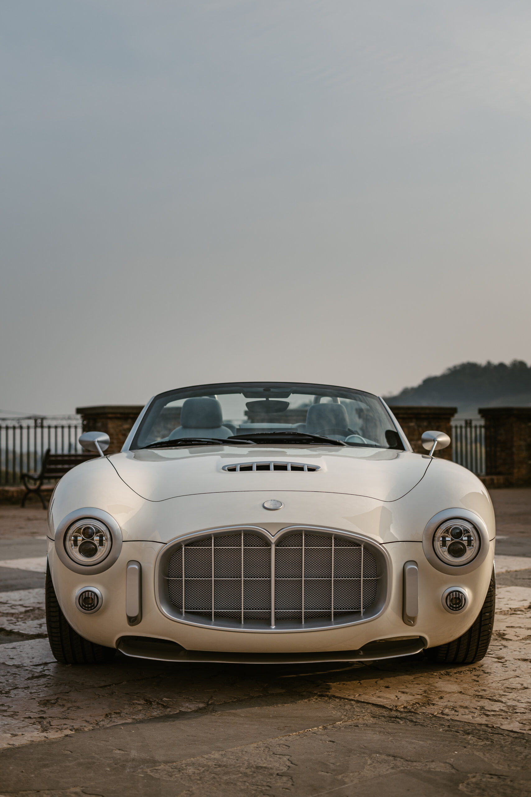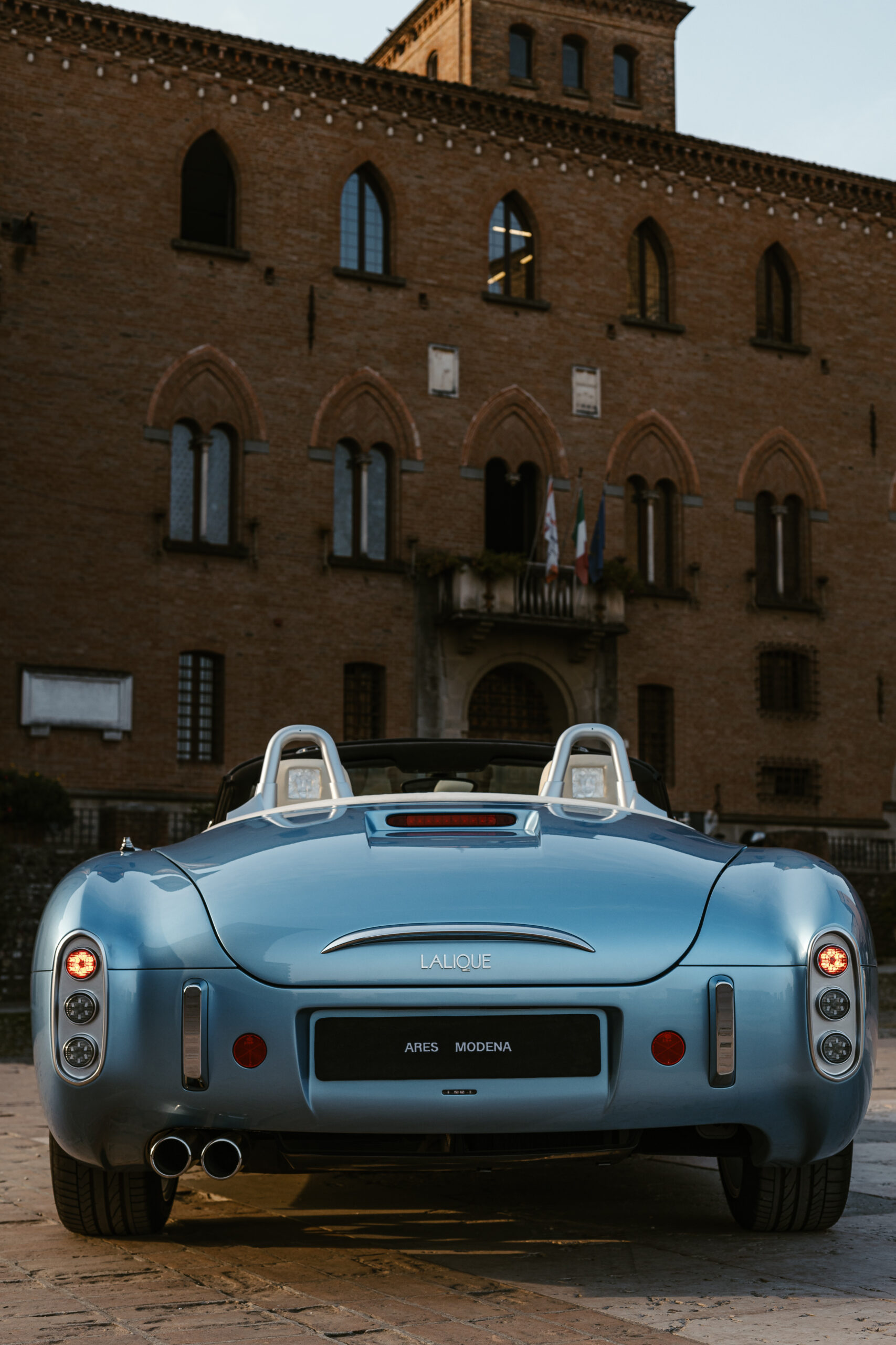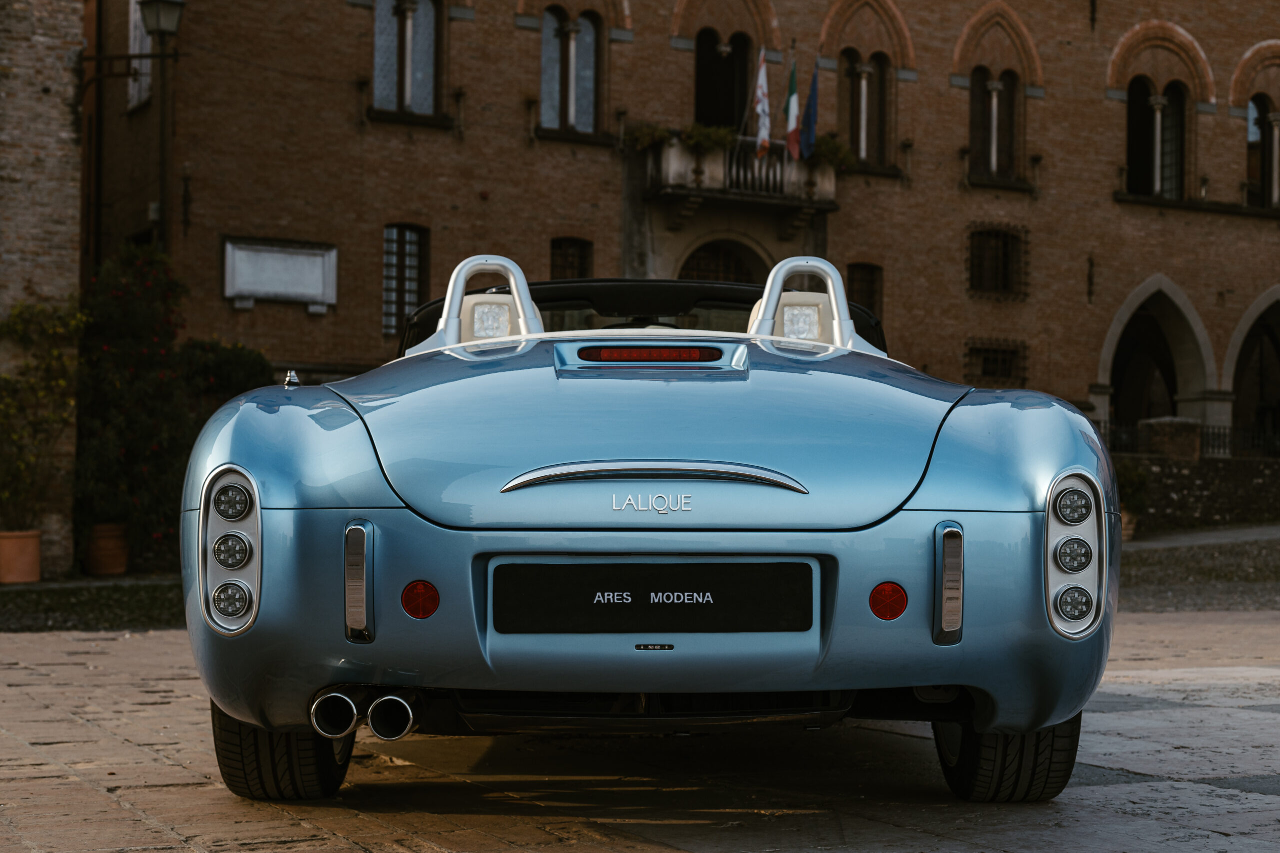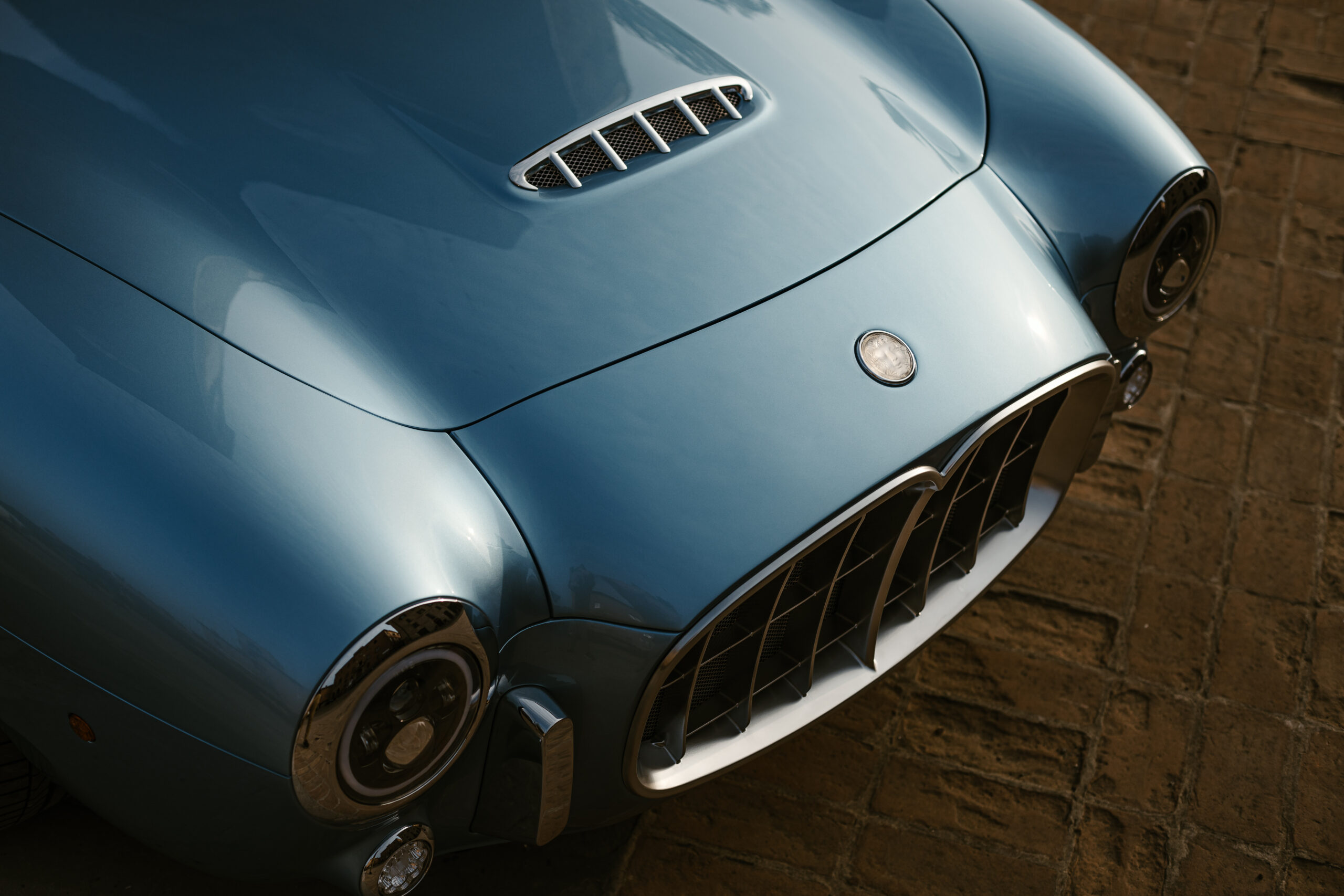 La voiture a été conçue et développée au Centro Stile d’Ares à Modène. Son extérieur en fibre de carbone fait écho aux lignes fluides des voitures vintage telles que la Maserati A6GCS Frua et la Ferrari 250 GT California. Le chrome habille la voiture, des pots d’échappement aux jantes fil de fer, en un hommage appuyé au style rétro. Disponible en rouge Amalfi et bleu clair méditerranéen, la carrosserie s’adapte à ceux qui souhaitent faire une déclaration visuelle audacieuse.