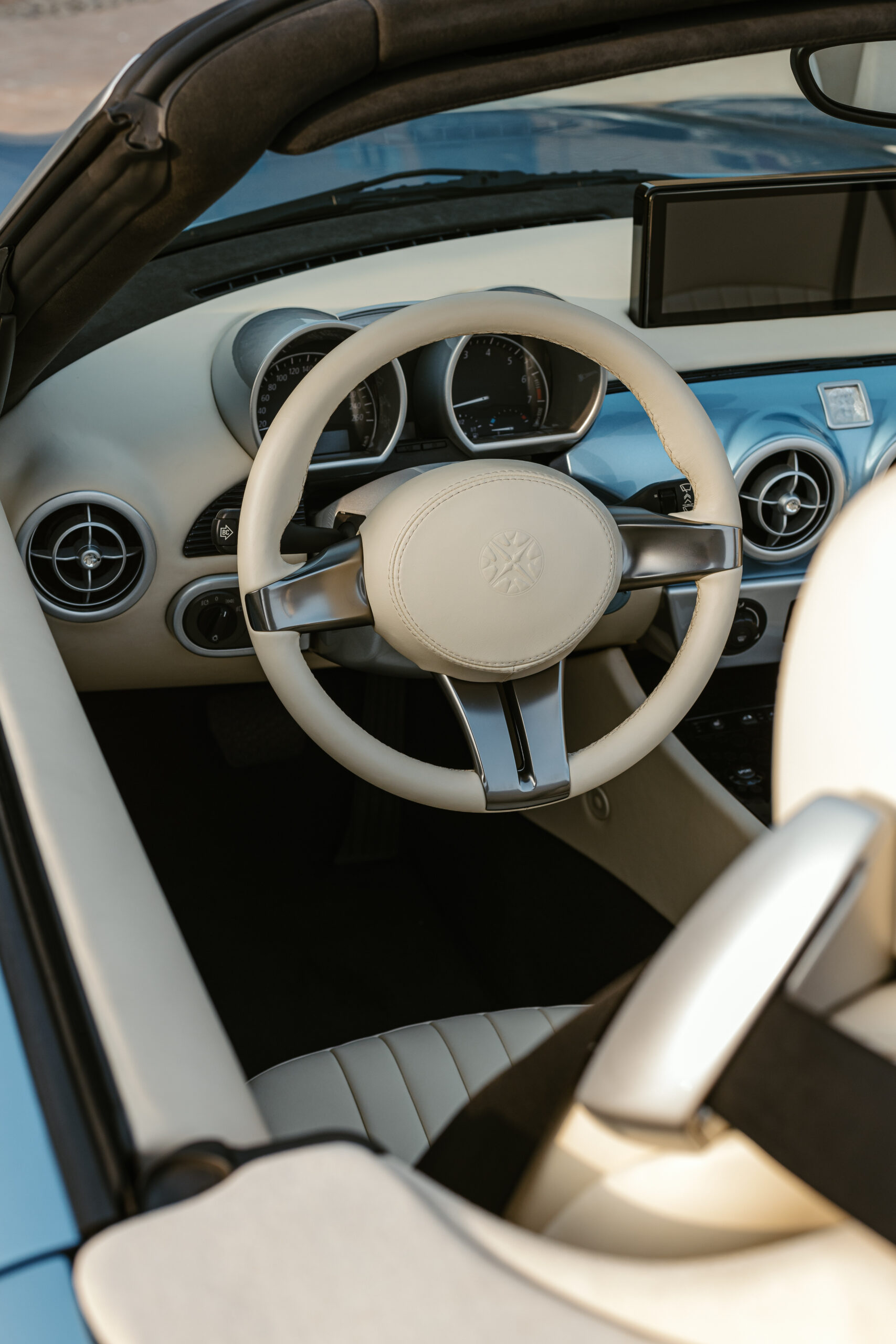 L’intérieur se veut minimaliste. Les distractions sont minimisées pour laisser place à la pureté de la conduite, un choix de design qui harmonise modernité et tradition.